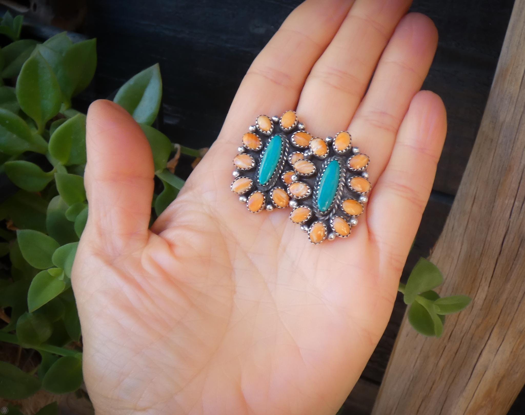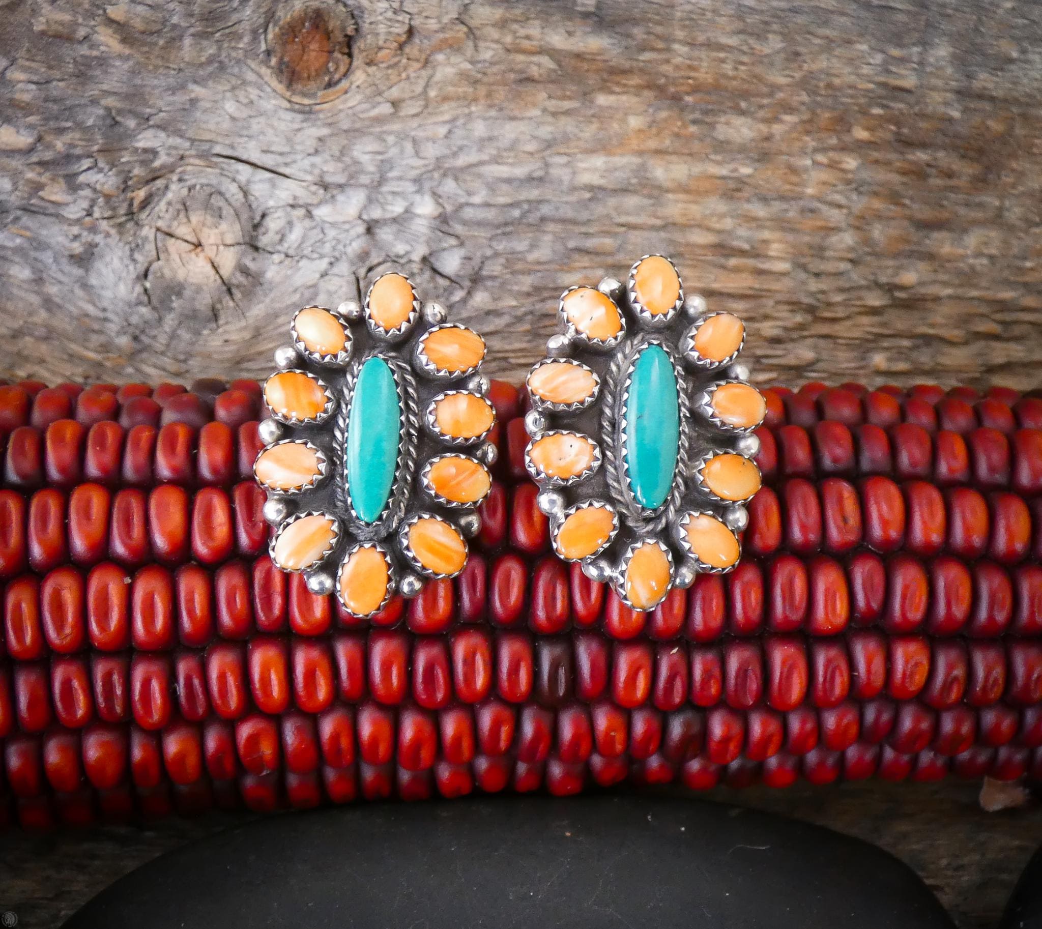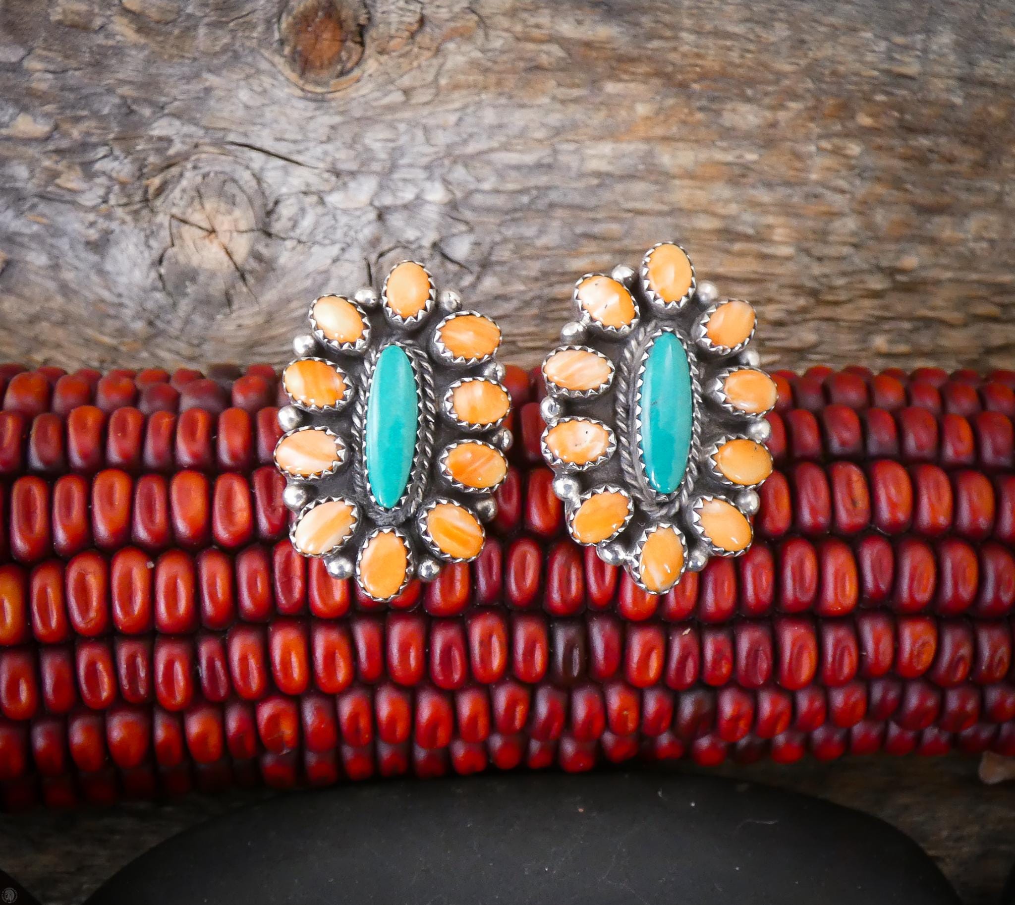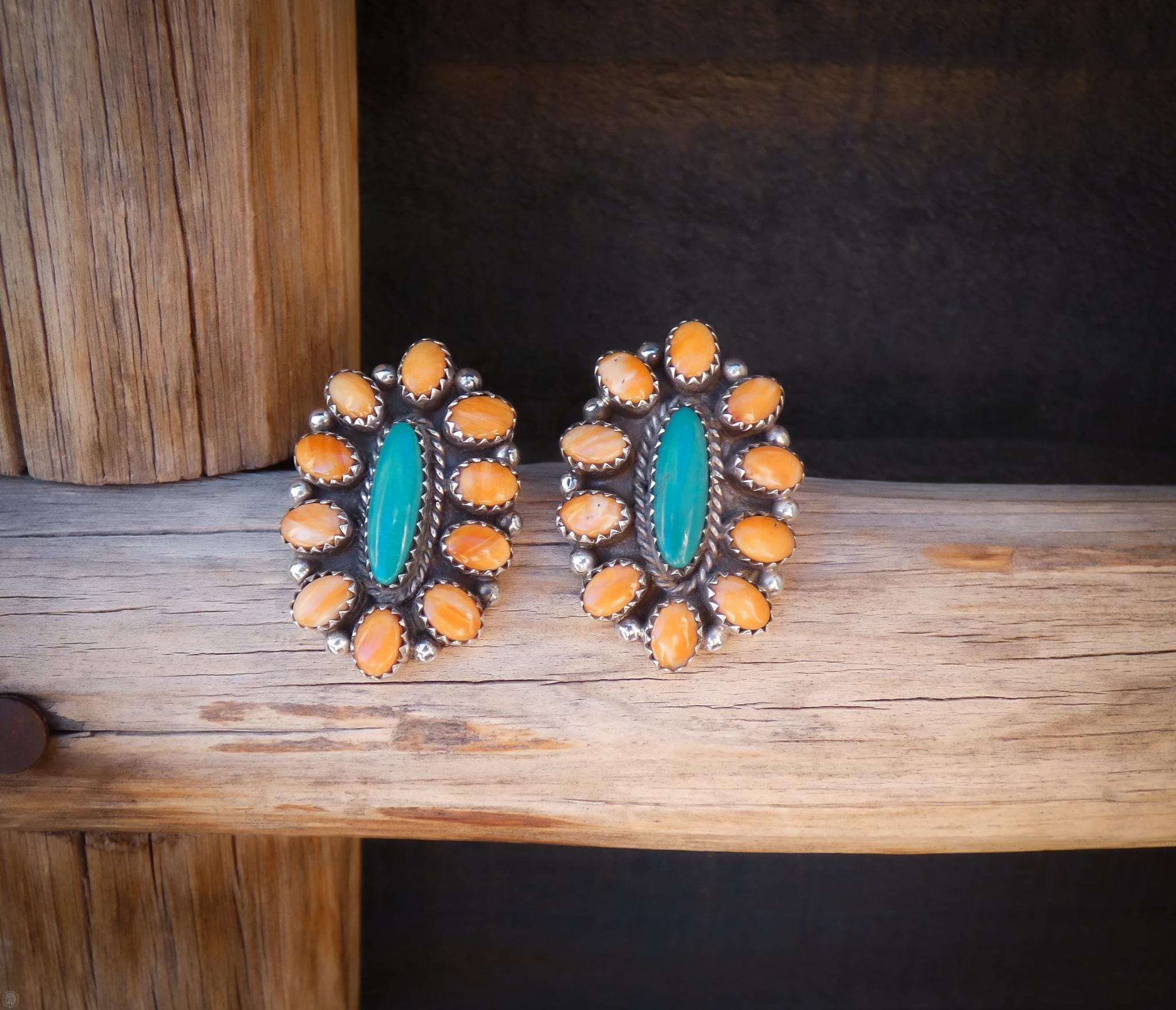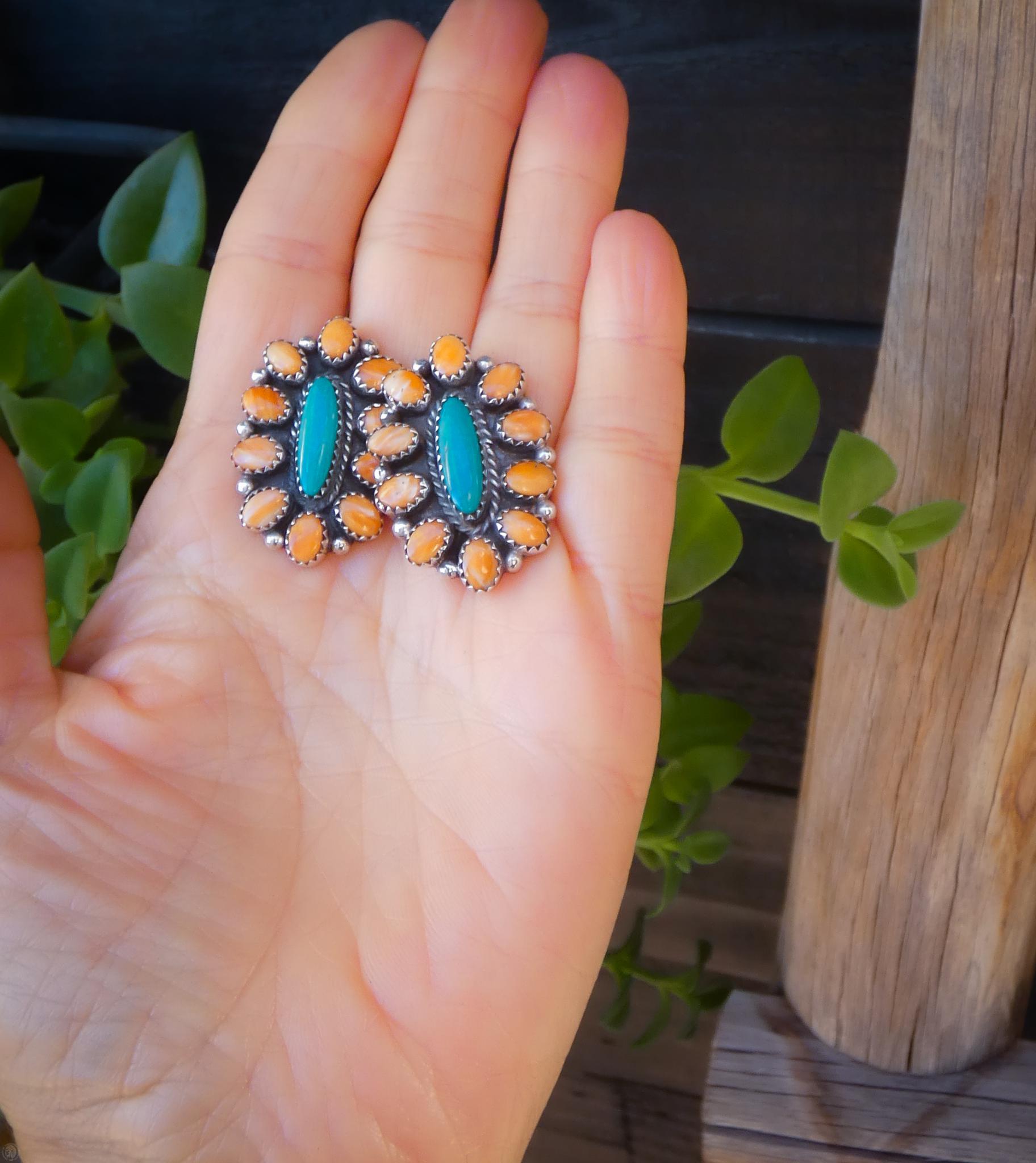 These beautiful Navajo cluster earrings by L. Bahe bring together two classic Southwestern favorites — vibrant spiny oyster shell and turquoise — in a design that feels both traditional and easy to wear. The stones are carefully arranged in a clustered pattern giving an earthy look sure to match a fun outfit.
