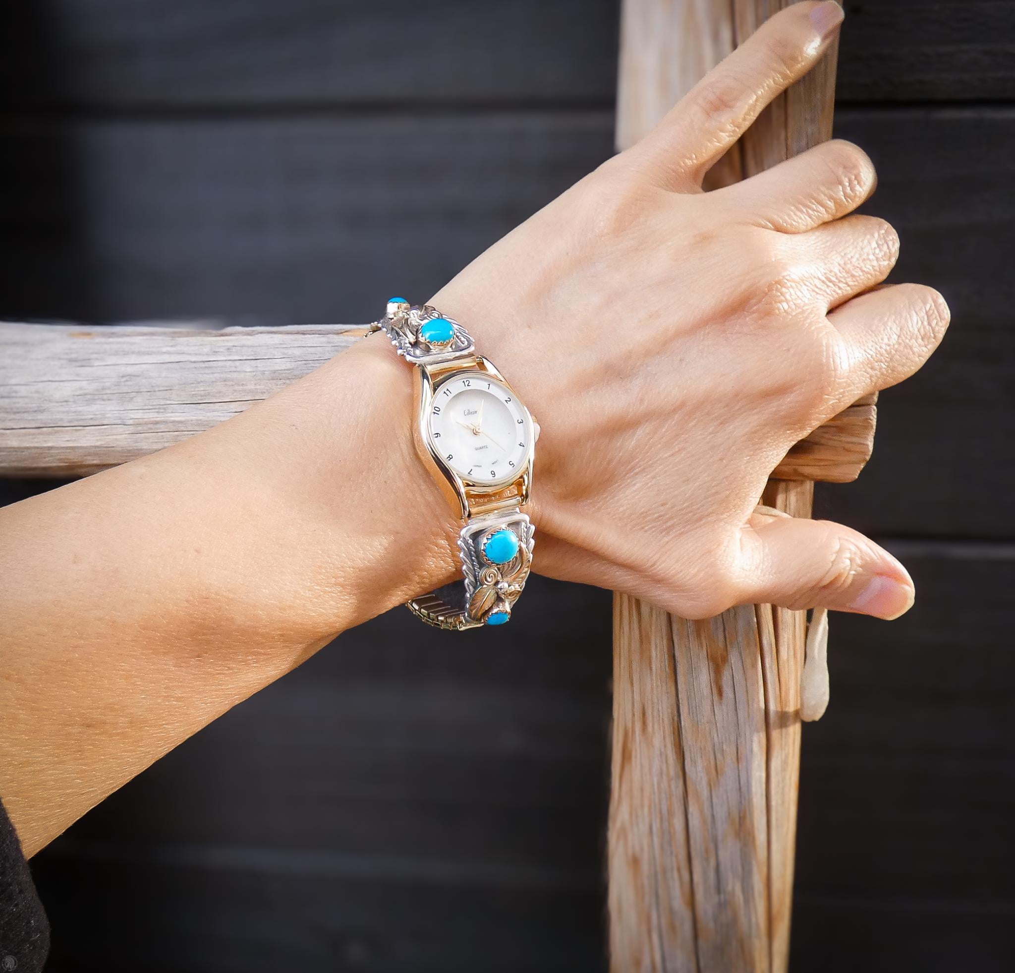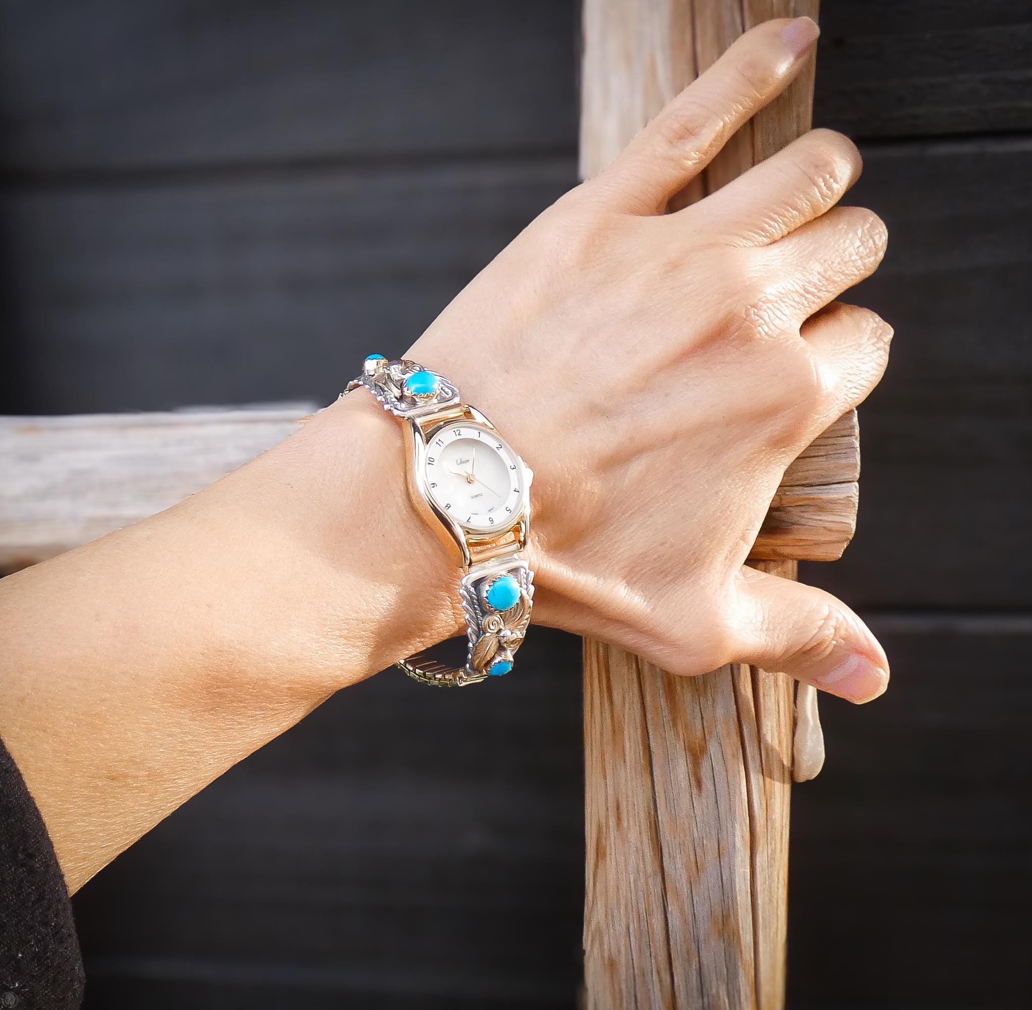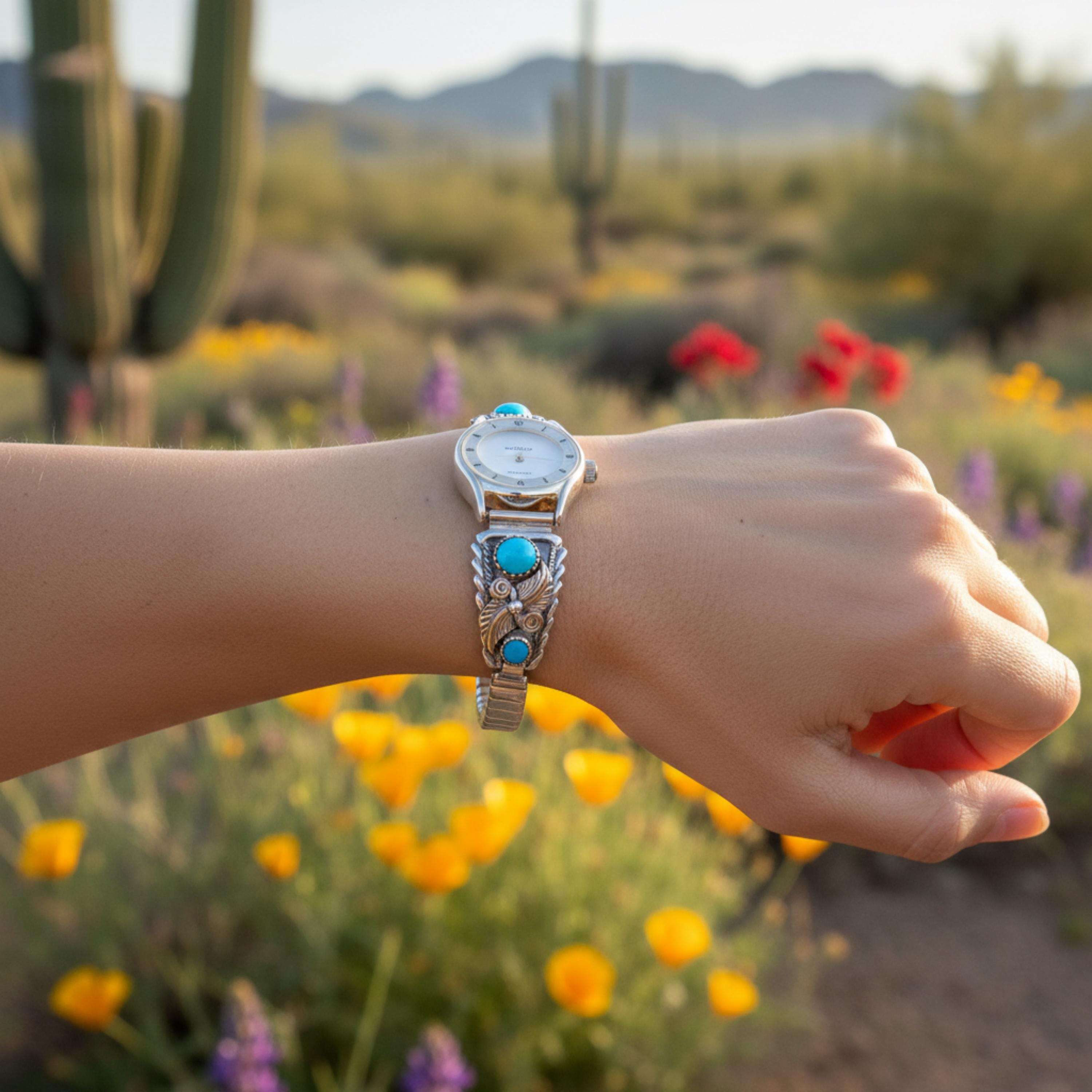 These watch tips are handcrafted into a beautiful, elegant, effeminate design. The design features delicate leaves along with a graceful flower and Turquoise stones. The gold really makes for a nice contrast against the silver, and the turquoise matches the gold quite nicely as well. But what really takes your breath away with this watch is the intricacy in the details added. Each and every detail is so carefully placed to be in perfect harmony with one another. Anyone who appreciates Native American jewelry handcrafted work will be sure to love this watch!