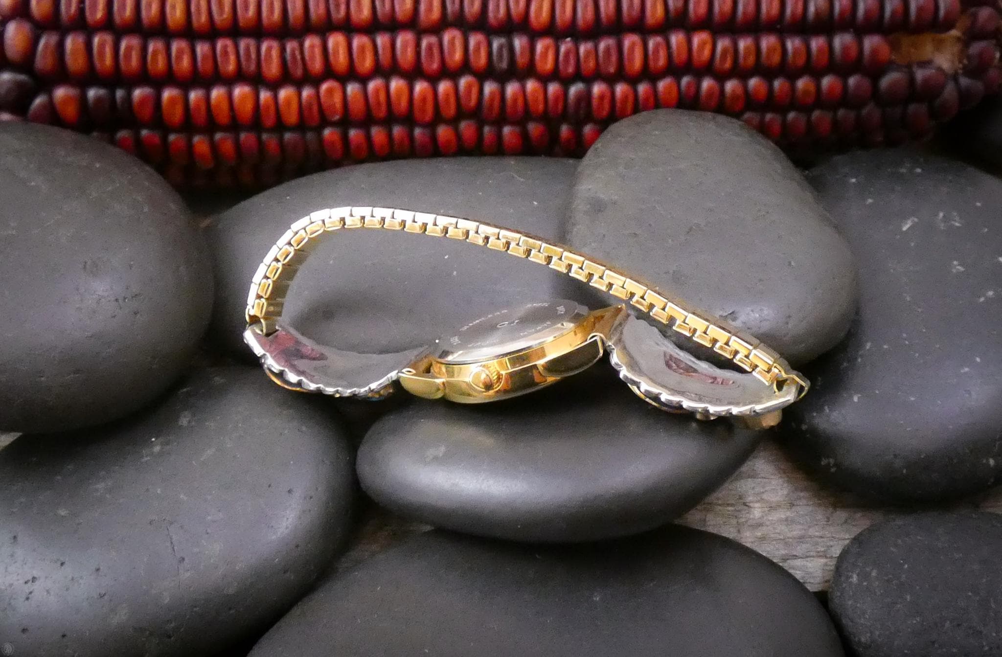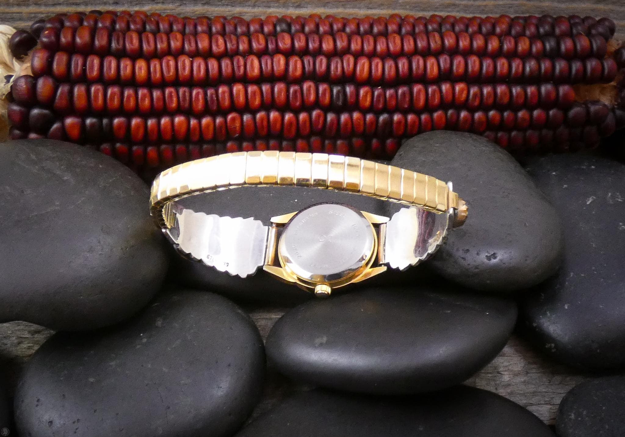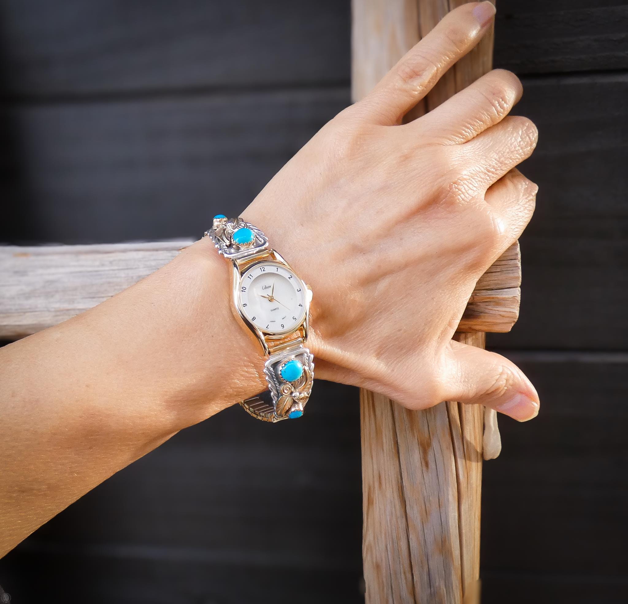 These watch tips are handcrafted into a beautiful, elegant, effeminate design. The design features delicate leaves along with a graceful flower and Turquoise stones. The gold really makes for a nice contrast against the silver, and the turquoise matches the gold quite nicely as well. But what really takes your breath away with this watch is the intricacy in the details added. Each and every detail is so carefully placed to be in perfect harmony with one another. Anyone who appreciates Native American jewelry handcrafted work will be sure to love this watch!