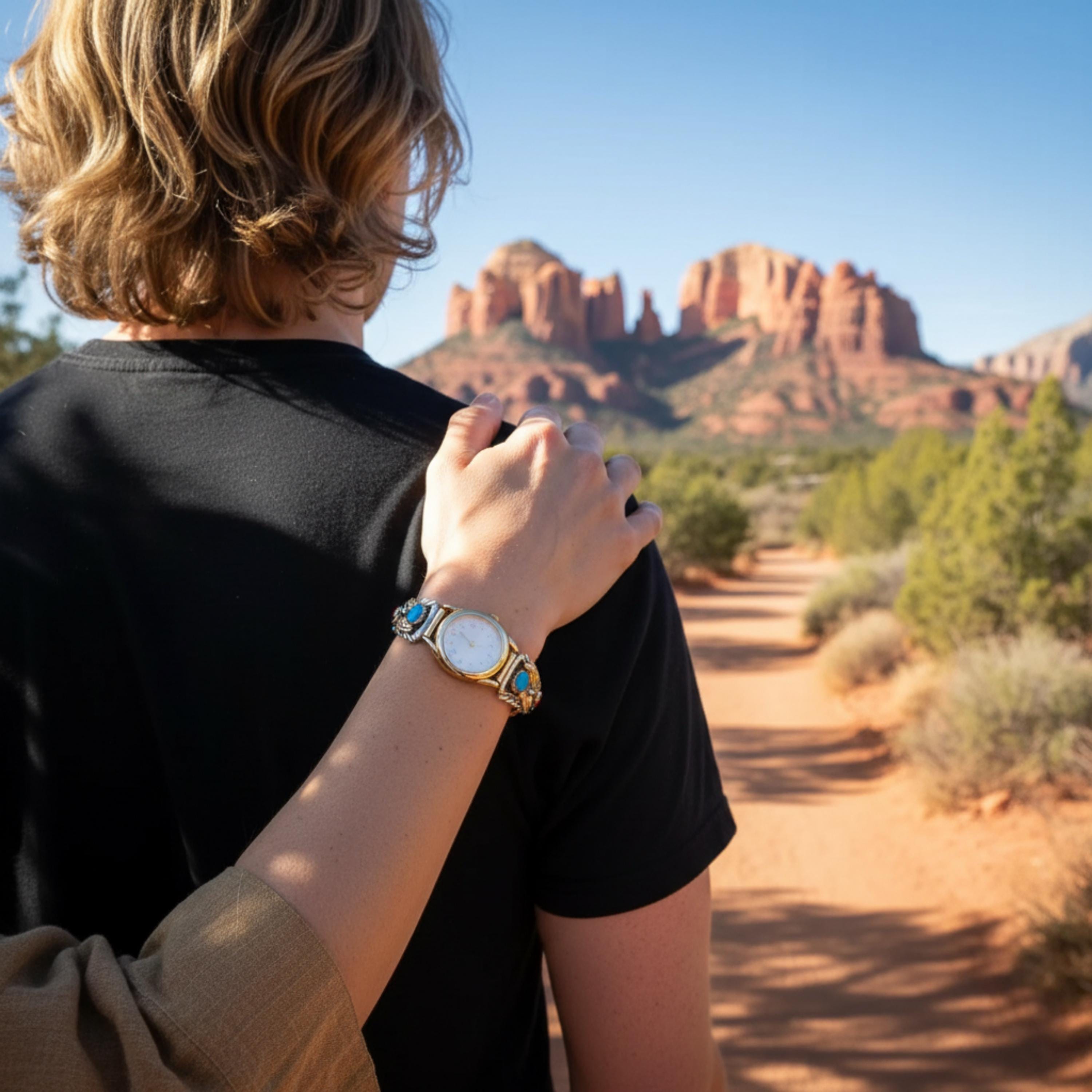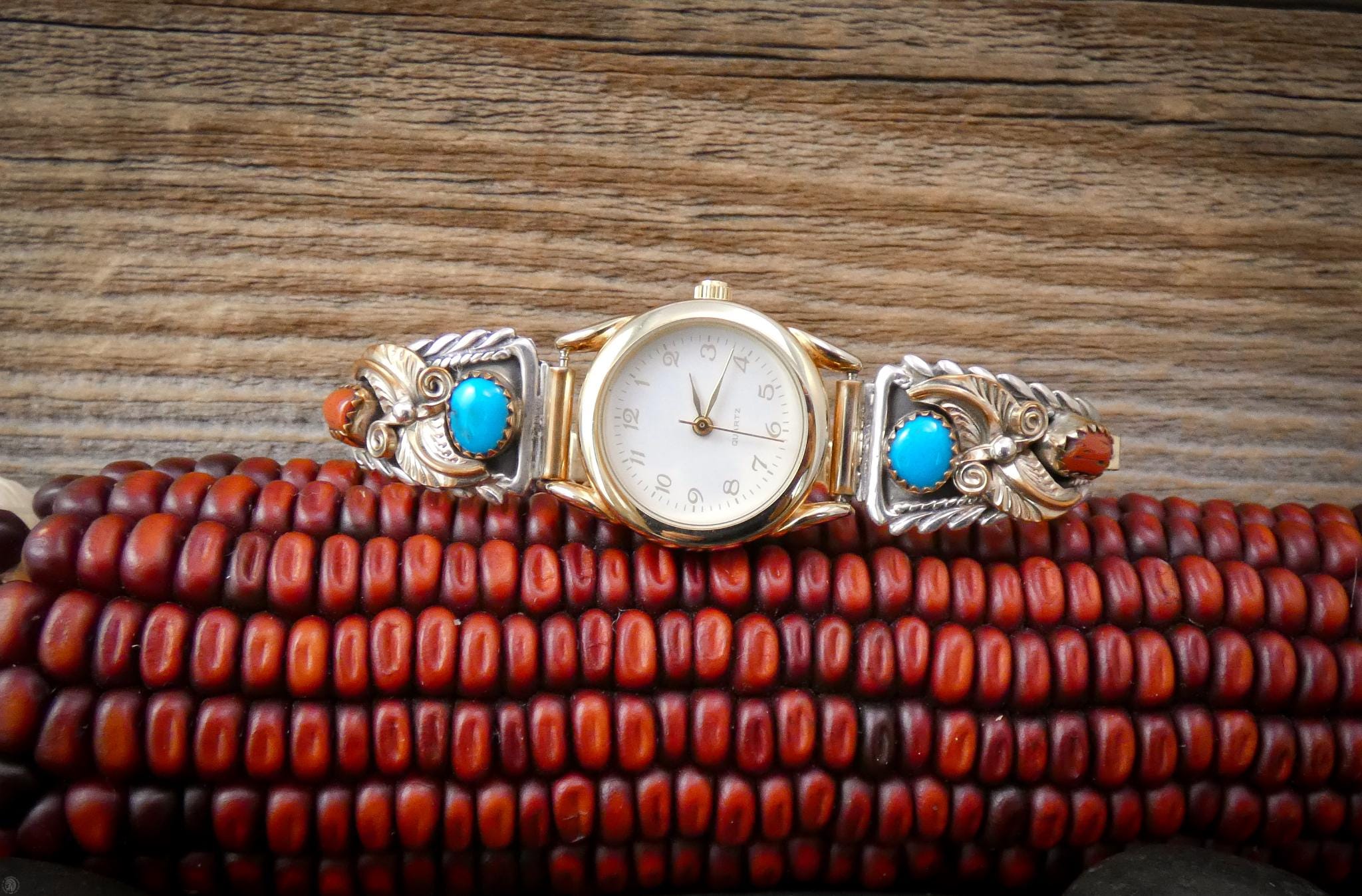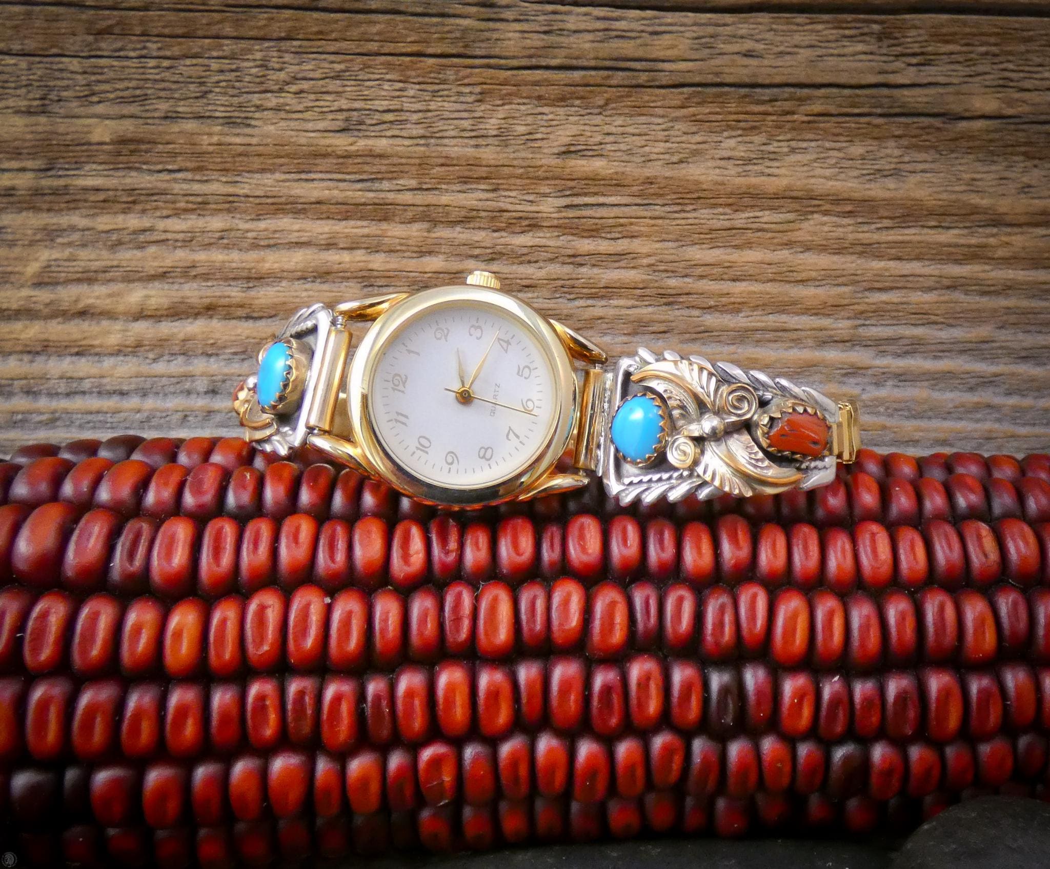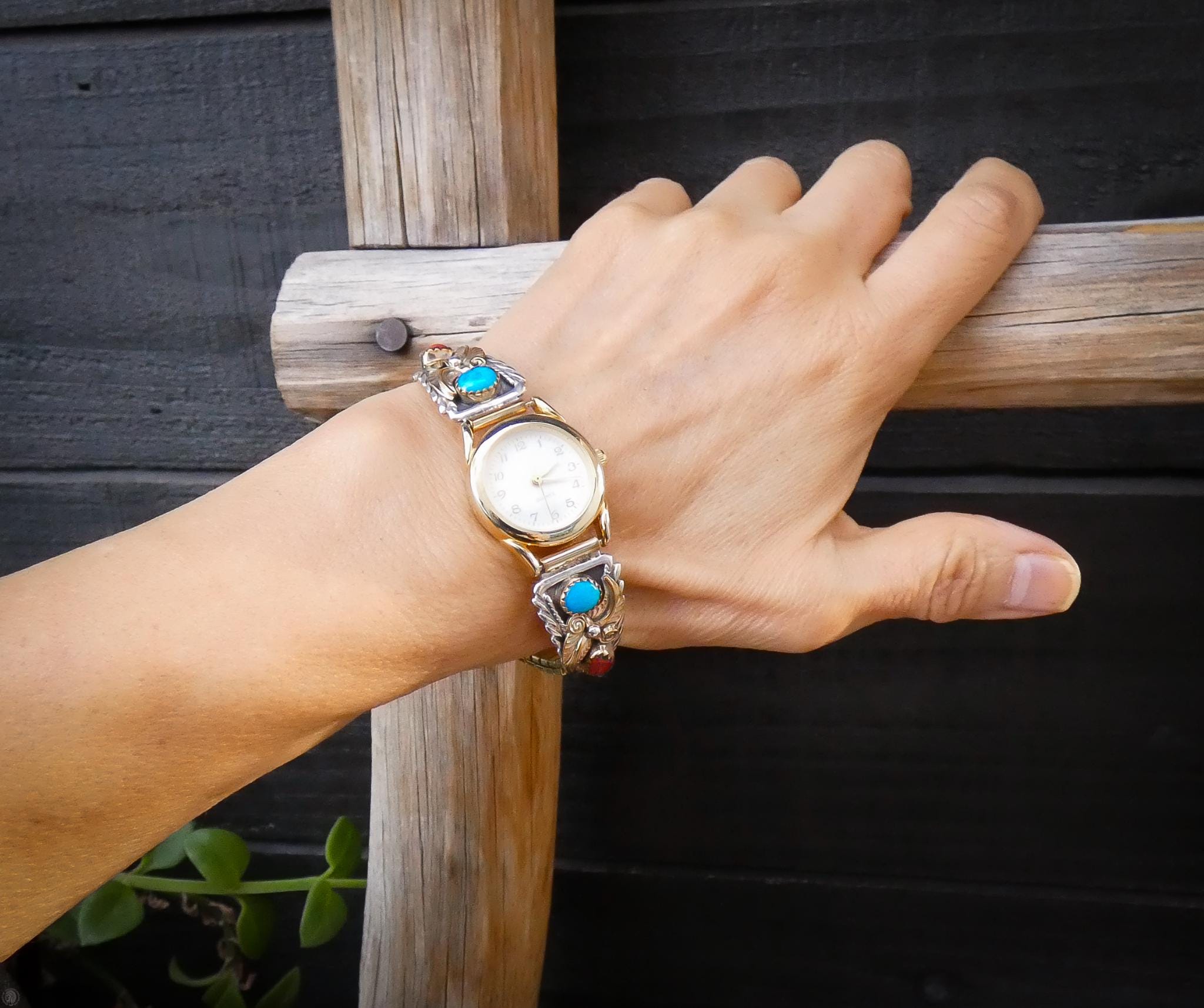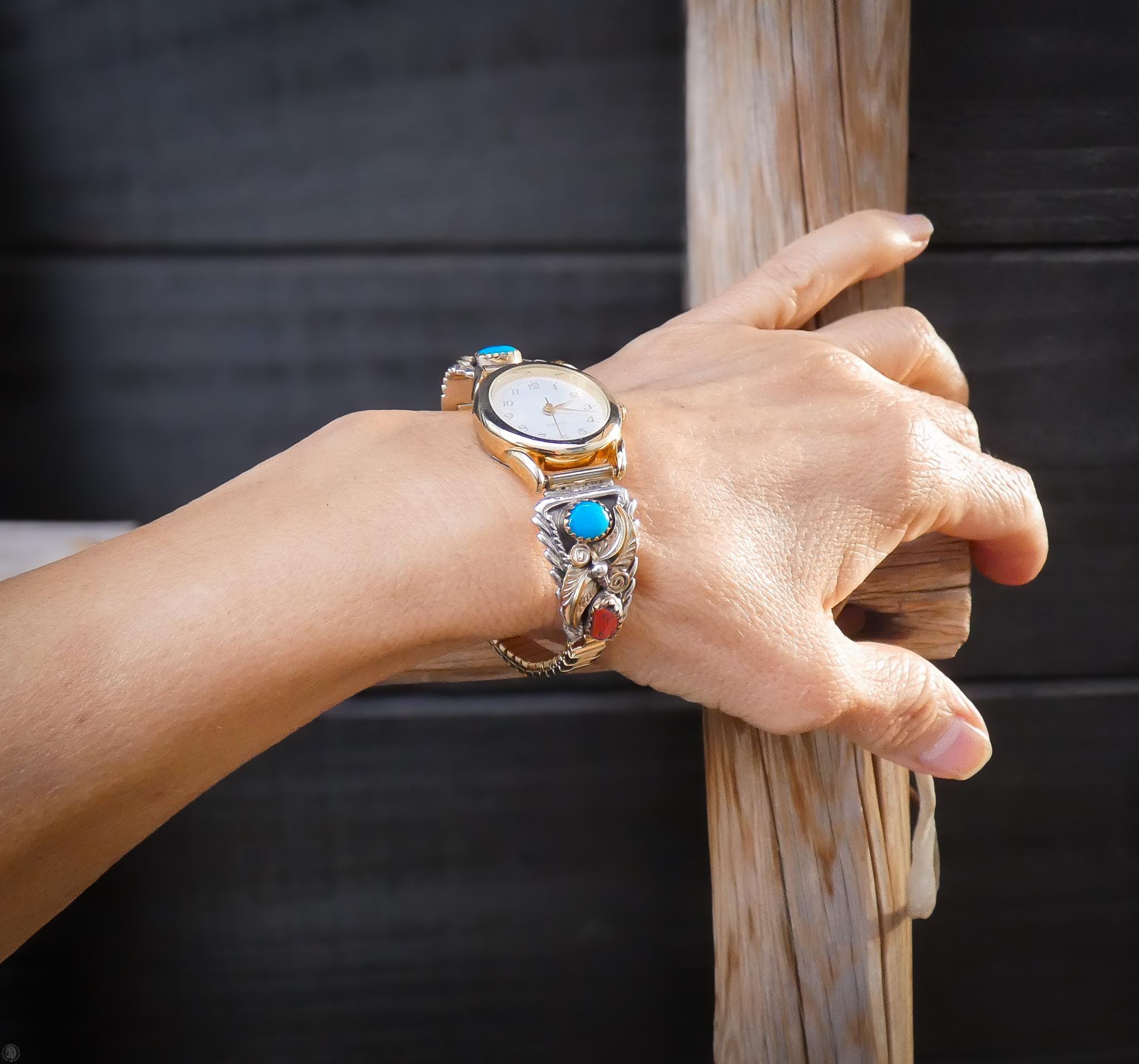 This women's vintage watch is a wonderful example of Native American tradition and culture. As you can see, the detail is amazing, completely handcrafted from 12KGF and Sterling Silver. On each side, the tips feature gold fill leaves, background and scroll work with Coral and Turquoise stones. Beautiful and traditional, this is the perfect piece for you or your loved one.