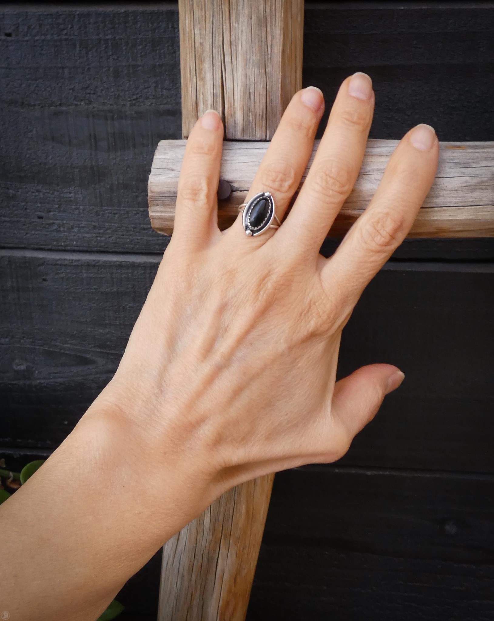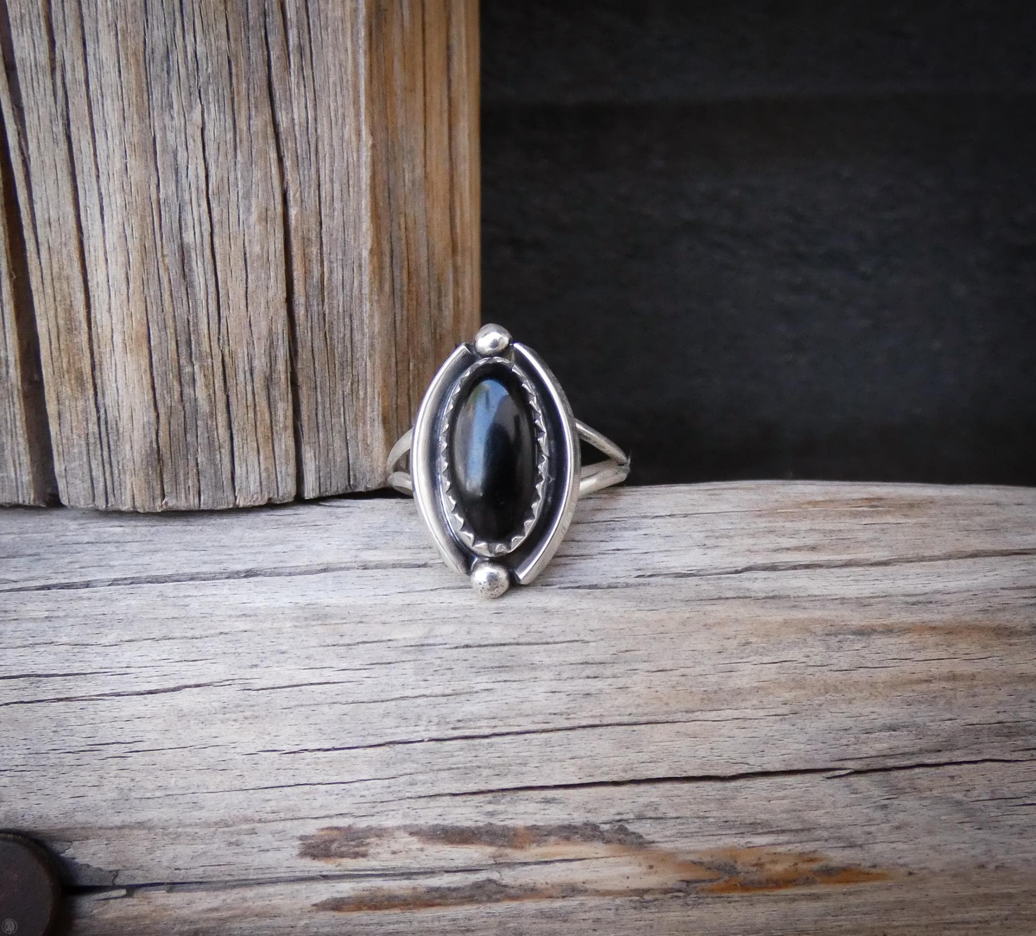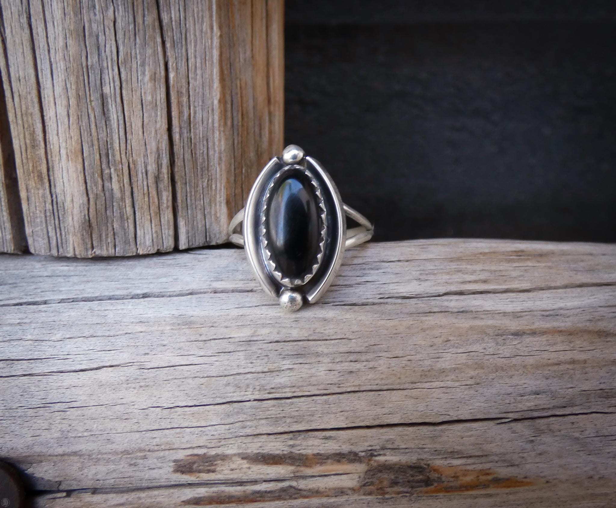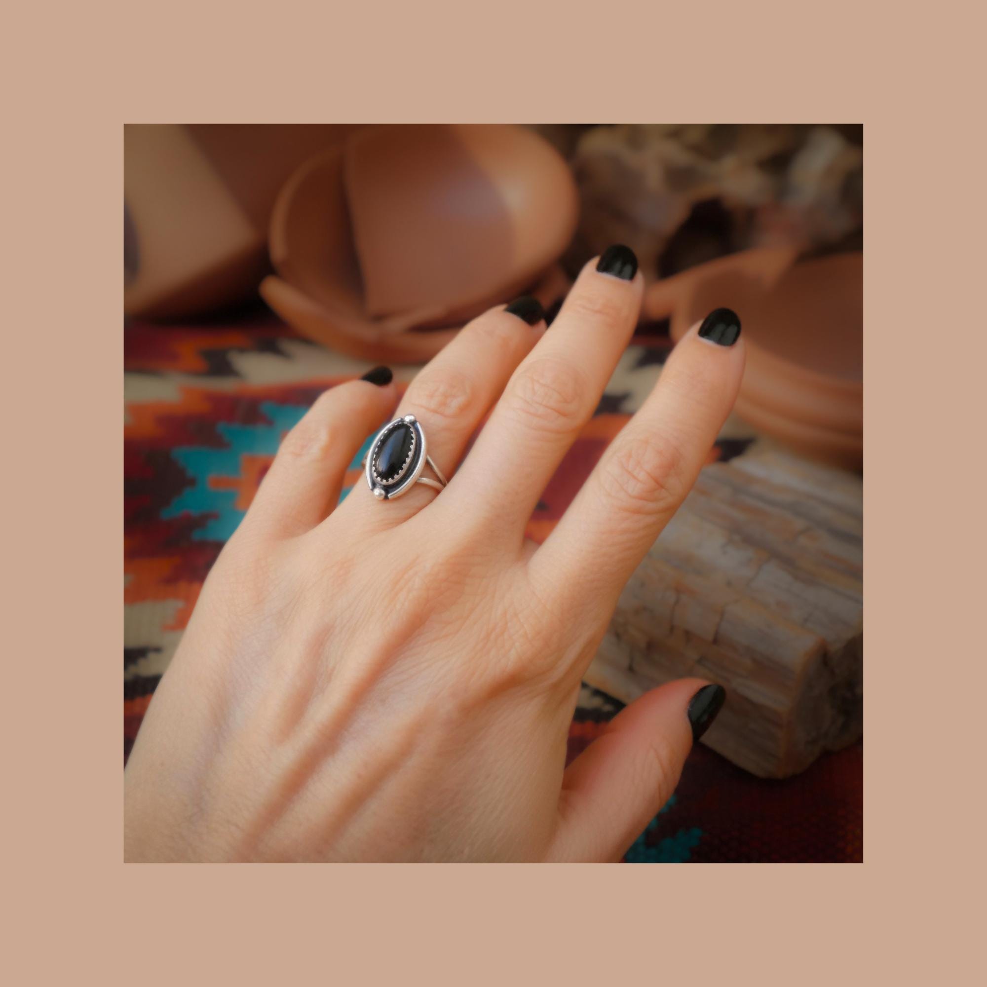This stunning Navajo handcrafted ring is a low key work of art! It features a beautifully set oblong onyx stone, handcrafted with care. Its neutral tone makes it versatile enough to complement any outfit or silver jewelry collection. A perfect gift for yourself or someone special!