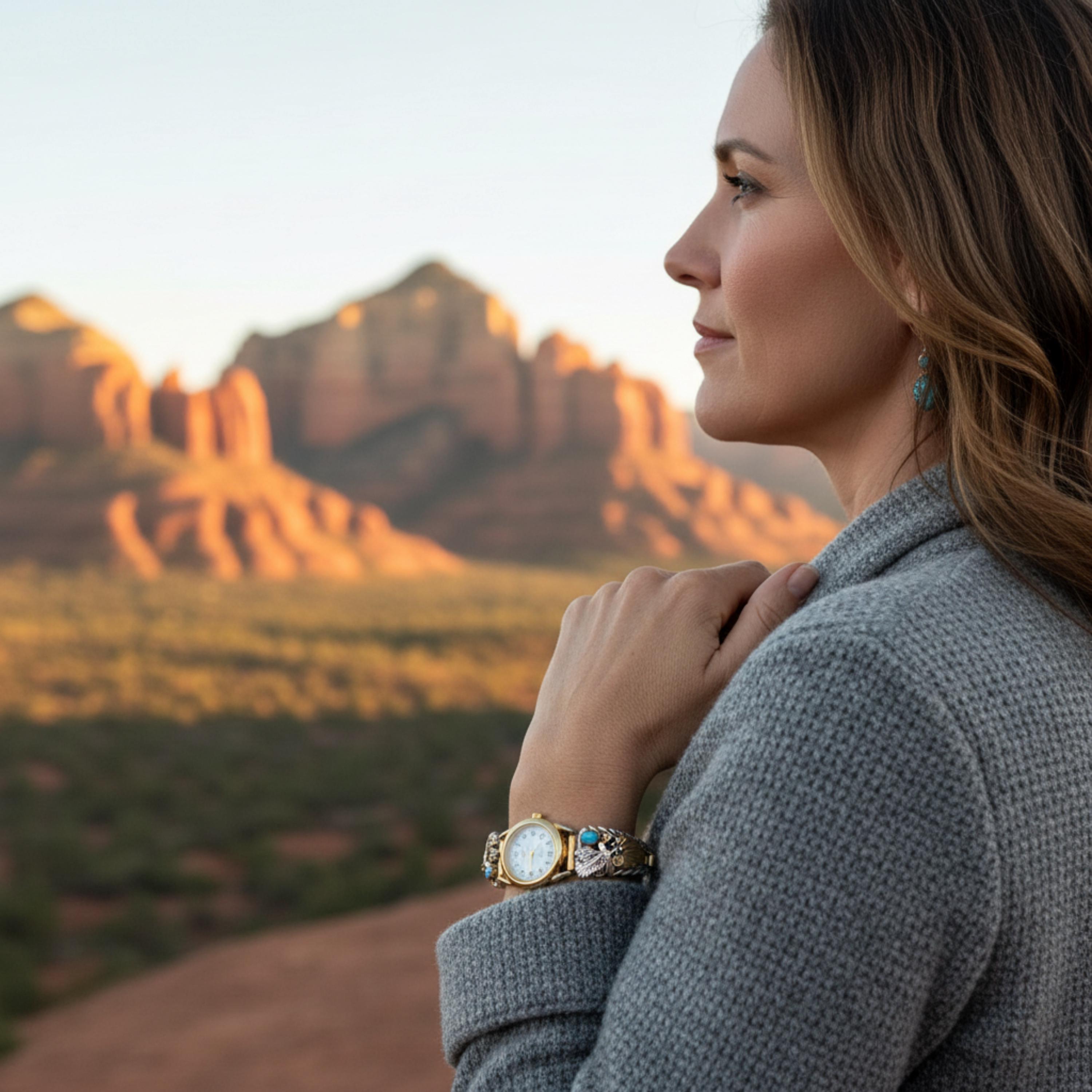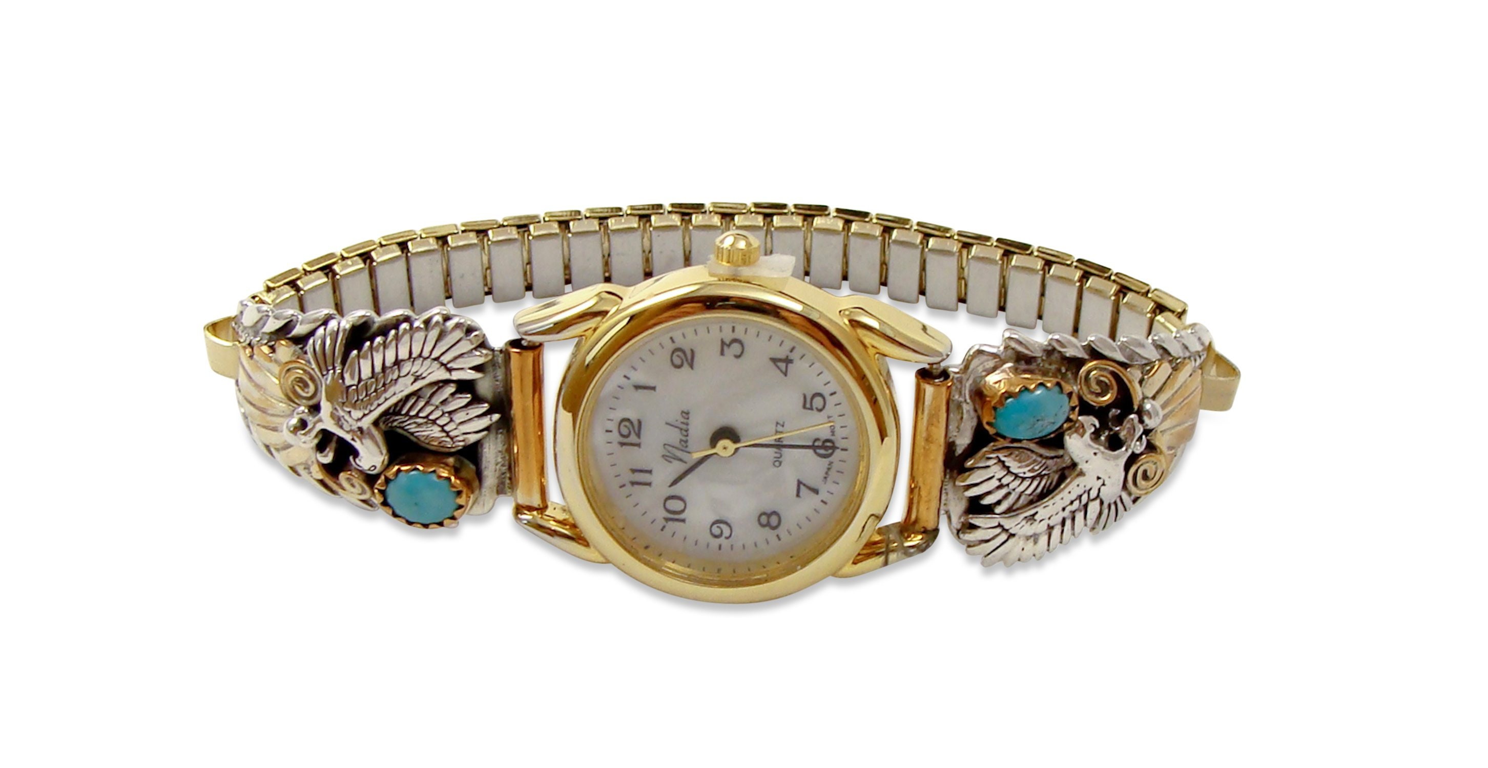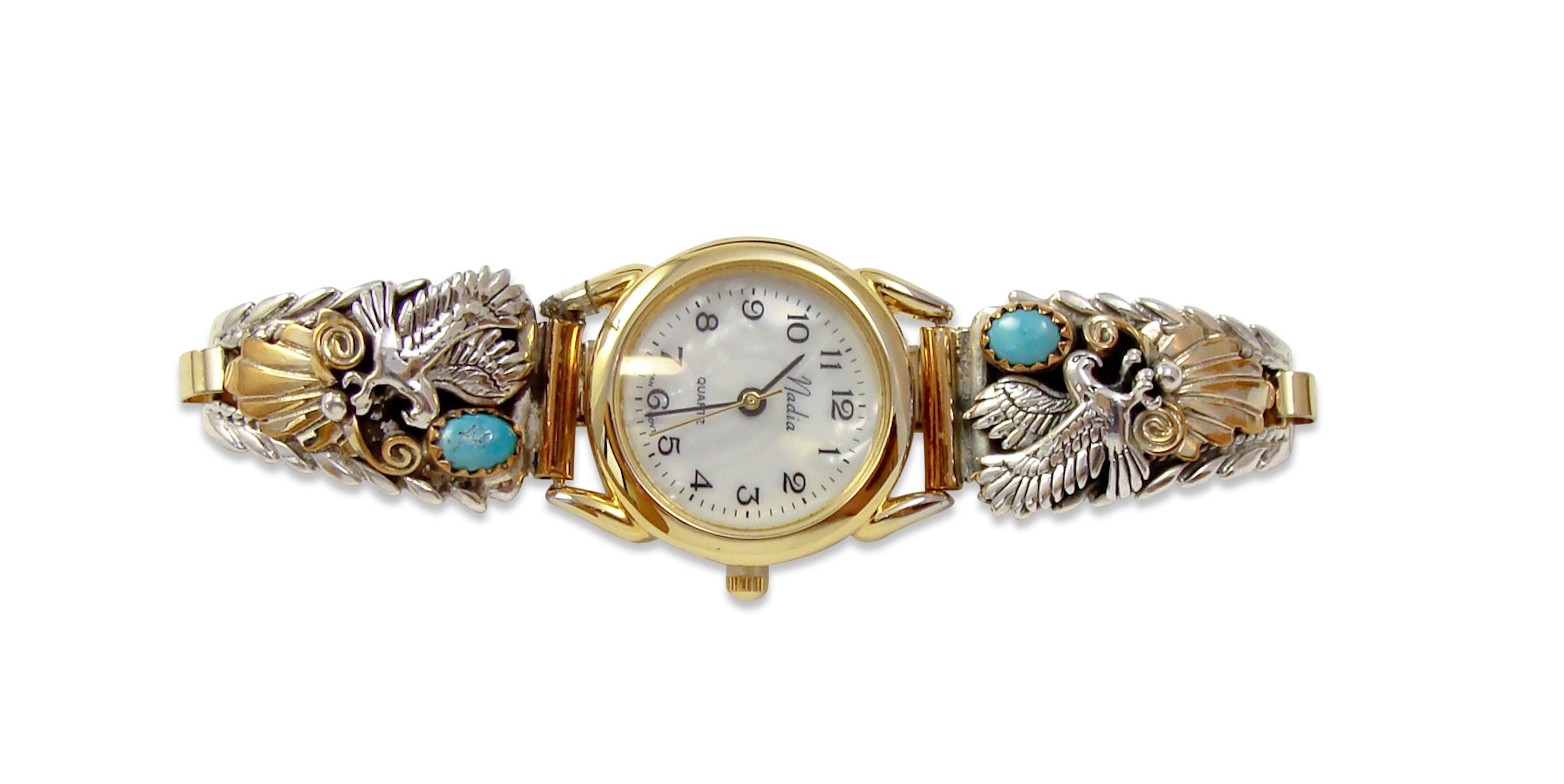 These watch tips are handcrafted from 12KGF and Sterling Silver into a truly elegant design. The design is an expertly hand-tooled eagle design, with Turquoise stones placed perfectly within the setting. Anyone who appreciates Native American jewelry or even delicate handcrafted work will be sure to love this watch!