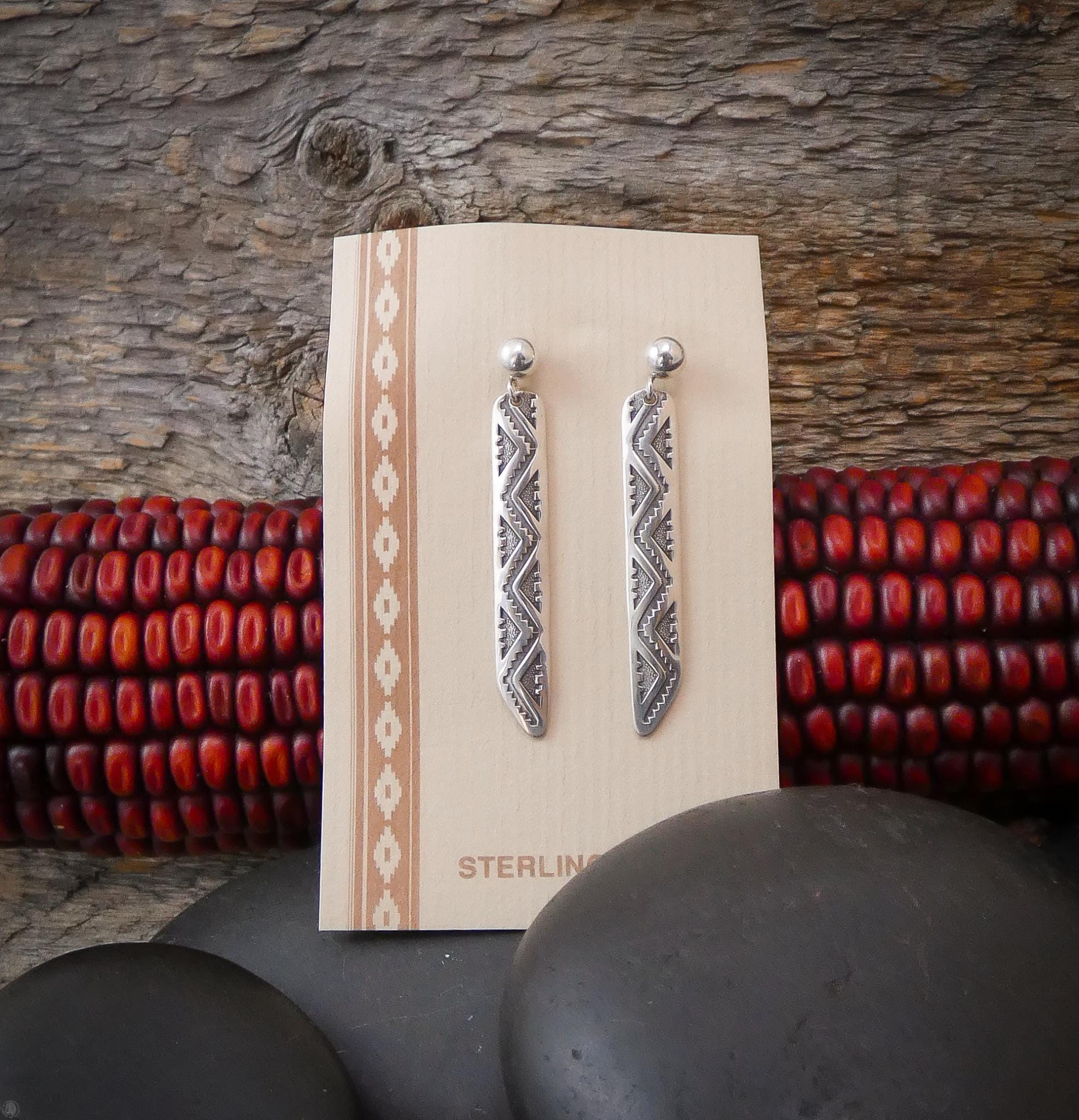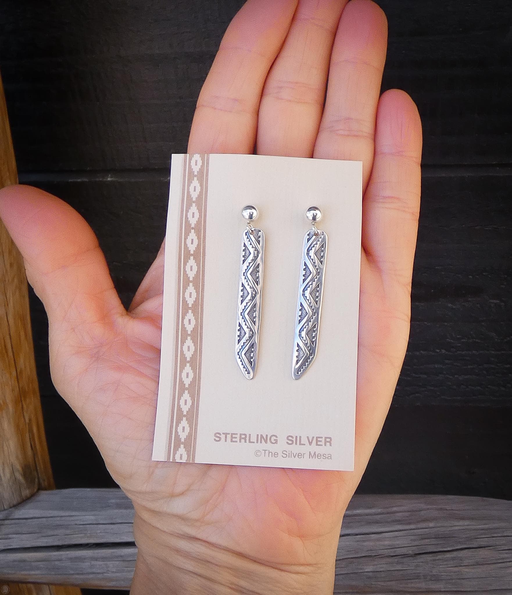 These Navajo Vintage Sterling Silver Earrings were handmade in the early 1990's in northern New Mexico, by Navajo Silversmith craftsman Johnny Begay. They have never been sold or worn. These classic traditional earrings can be worn casually or dressed up. The beautiful craftsmanship is on display for these vintage artisan earrings.