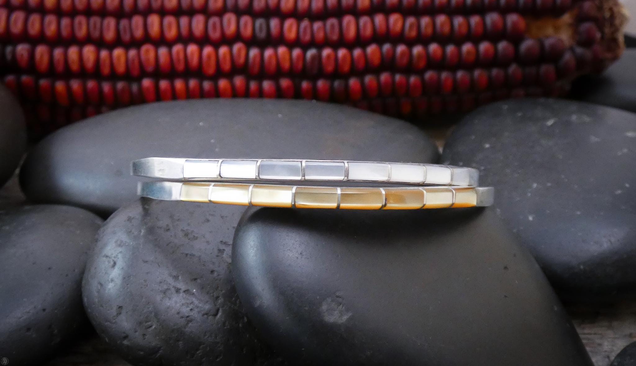 This vintage Zuni features a striking inlay of natural mother of pearl, beautiful Native American artistry with a clean, contemporary finish.