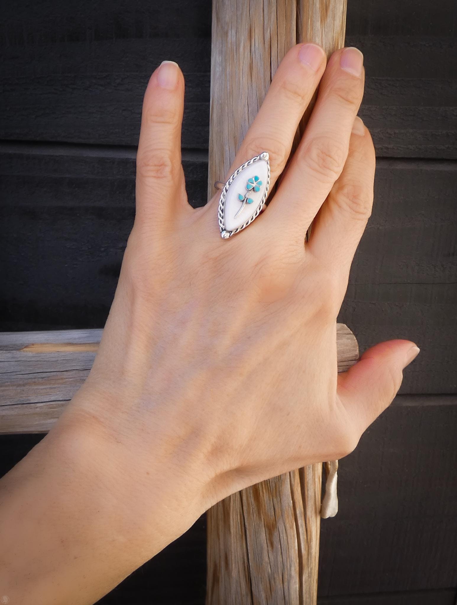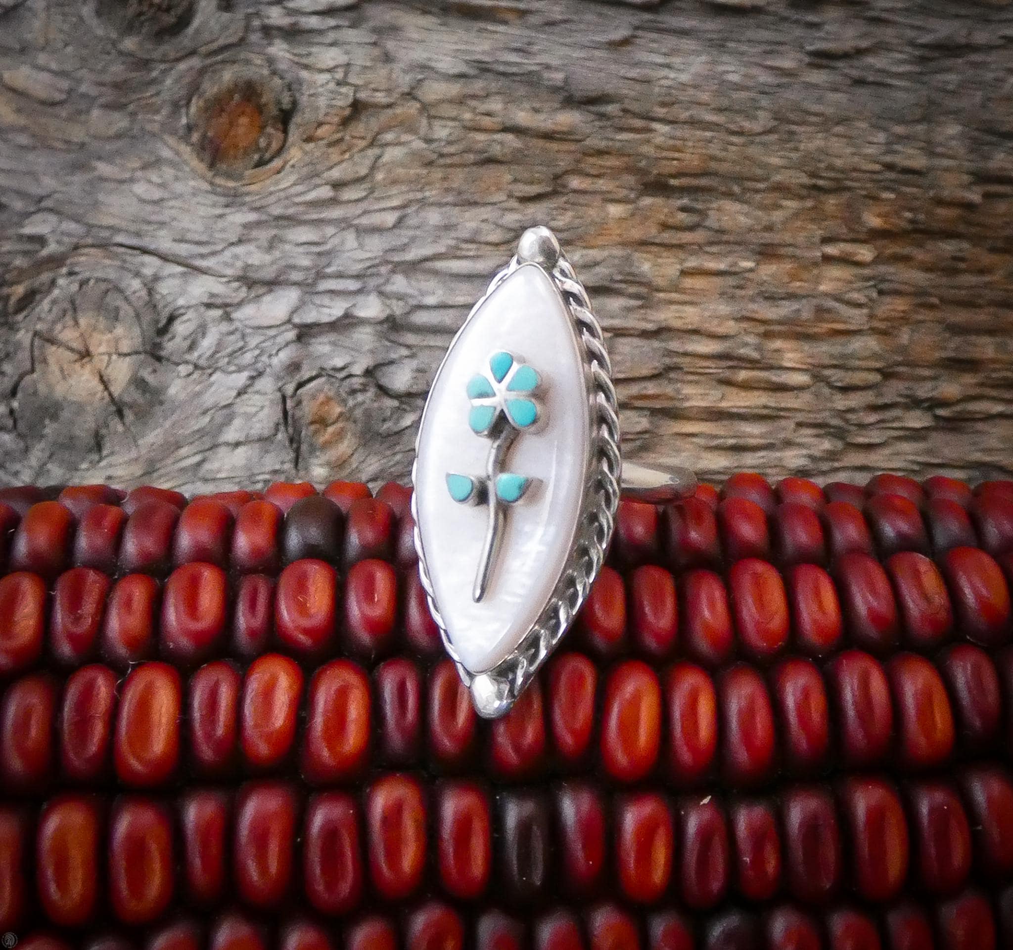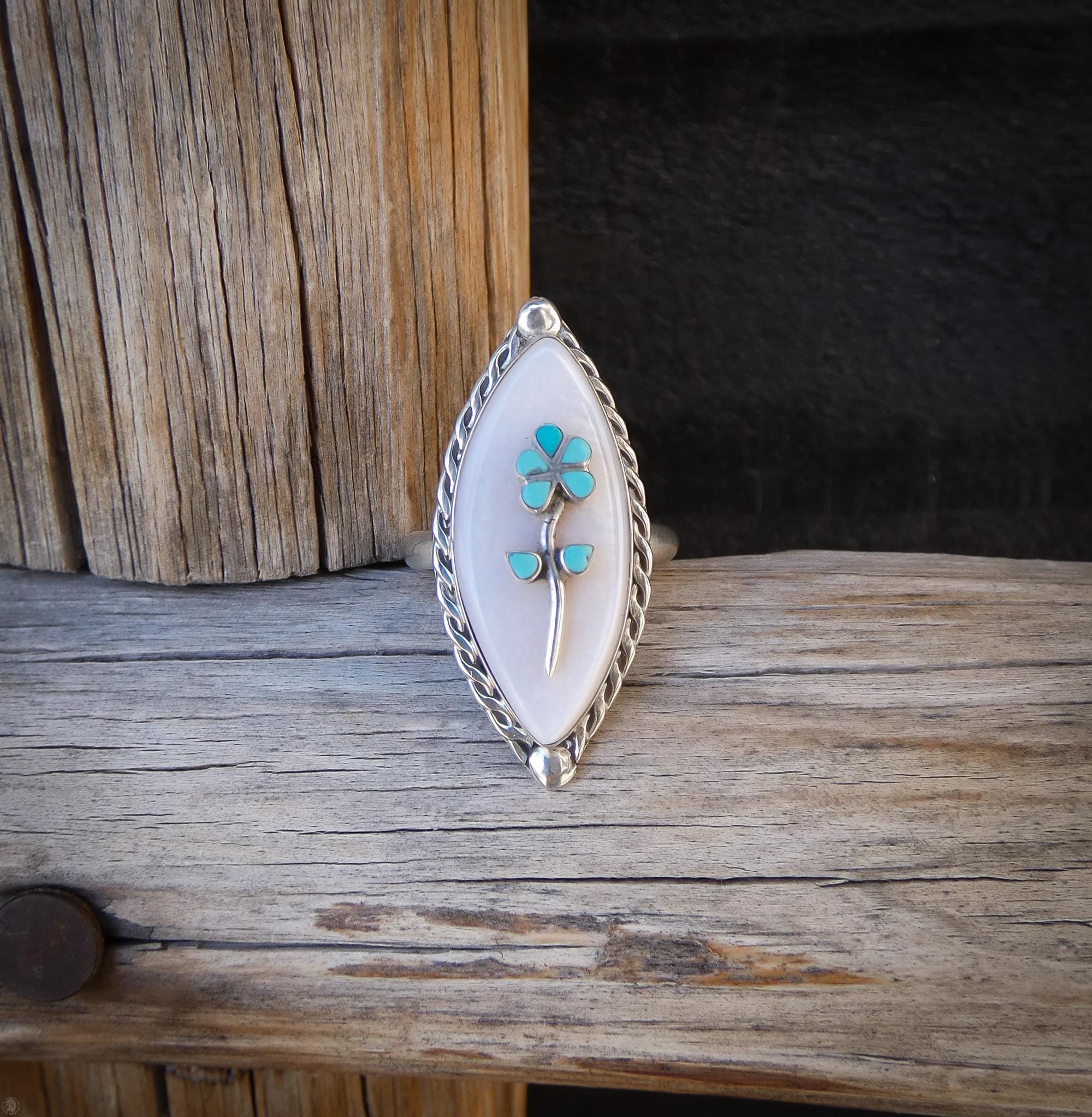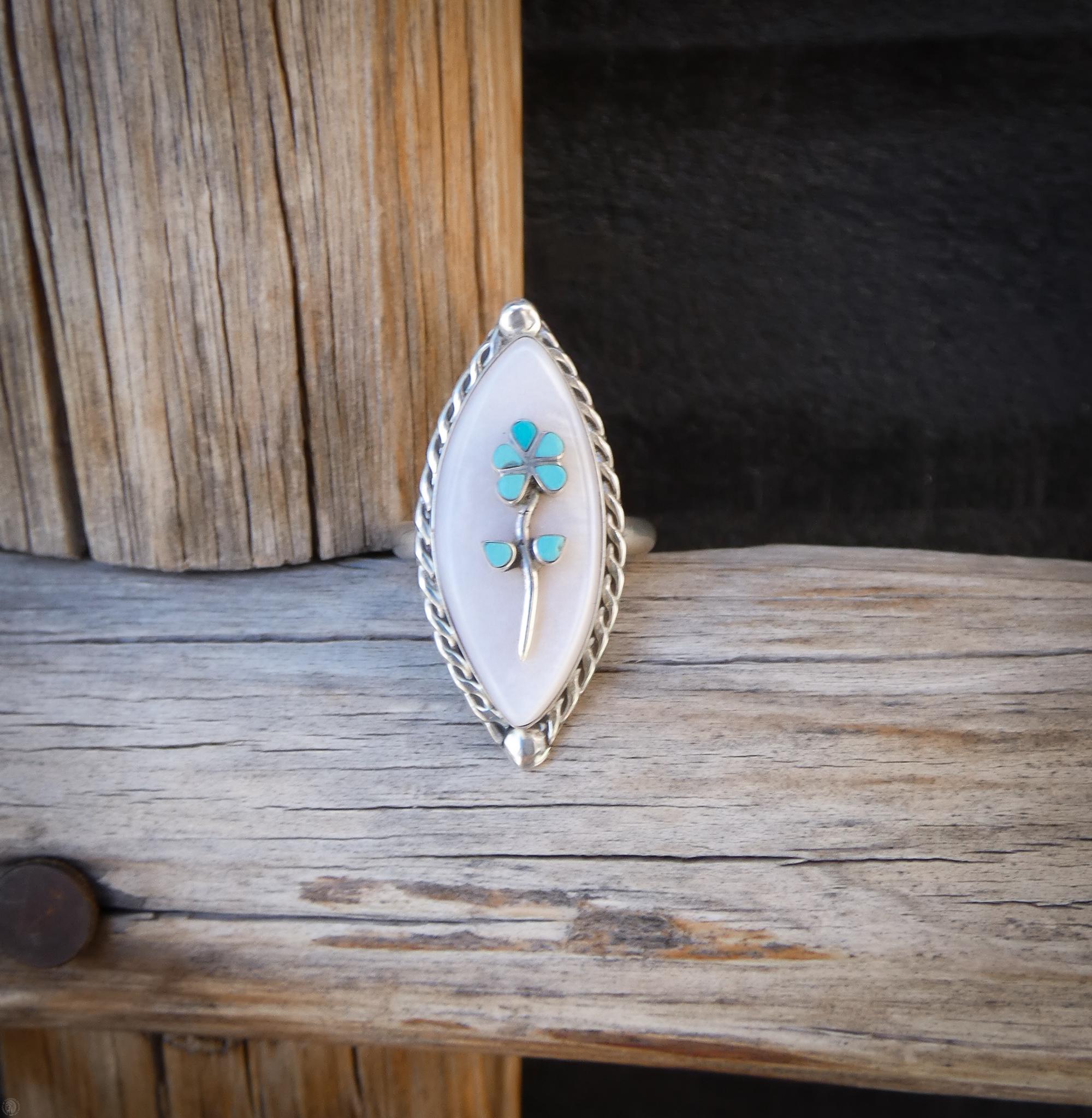 This handcrafted Zuni ring is made with Sterling Silver, mother of pearl shell, and turquoise. The turquoise flower against the stark white backdrop creates a striking yet understated contrast that will go with any outfit you wear. This specific piece of Turquoise is a pure and bright shade of blue, which is inlayed into a remarkably intricate flower, and placed against a backdrop of the pearlescent luster of the mother of pearl shell. This is unique vintage Zuni wearable art that you will be proud to show off! Made by Robert Lasiloo.