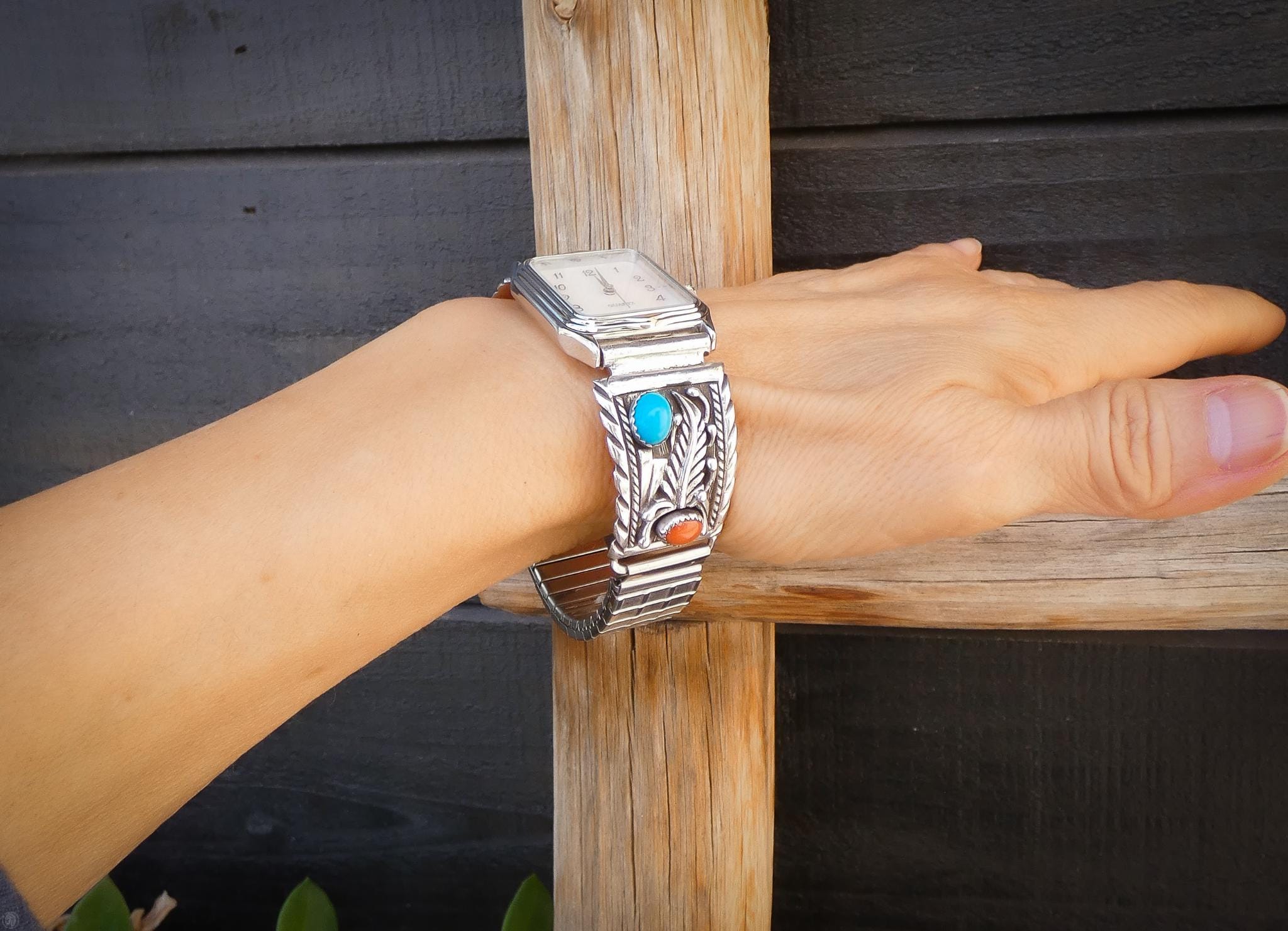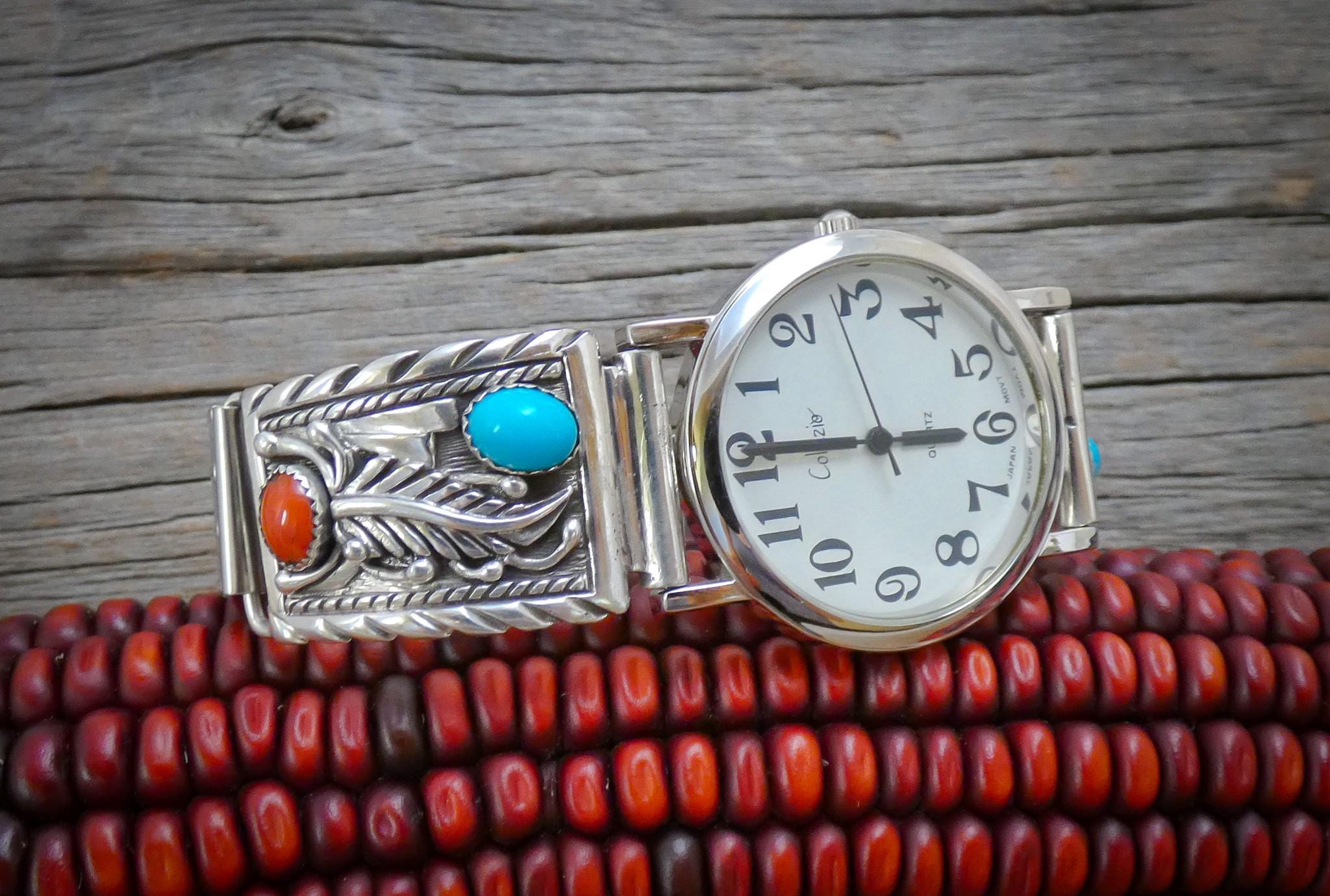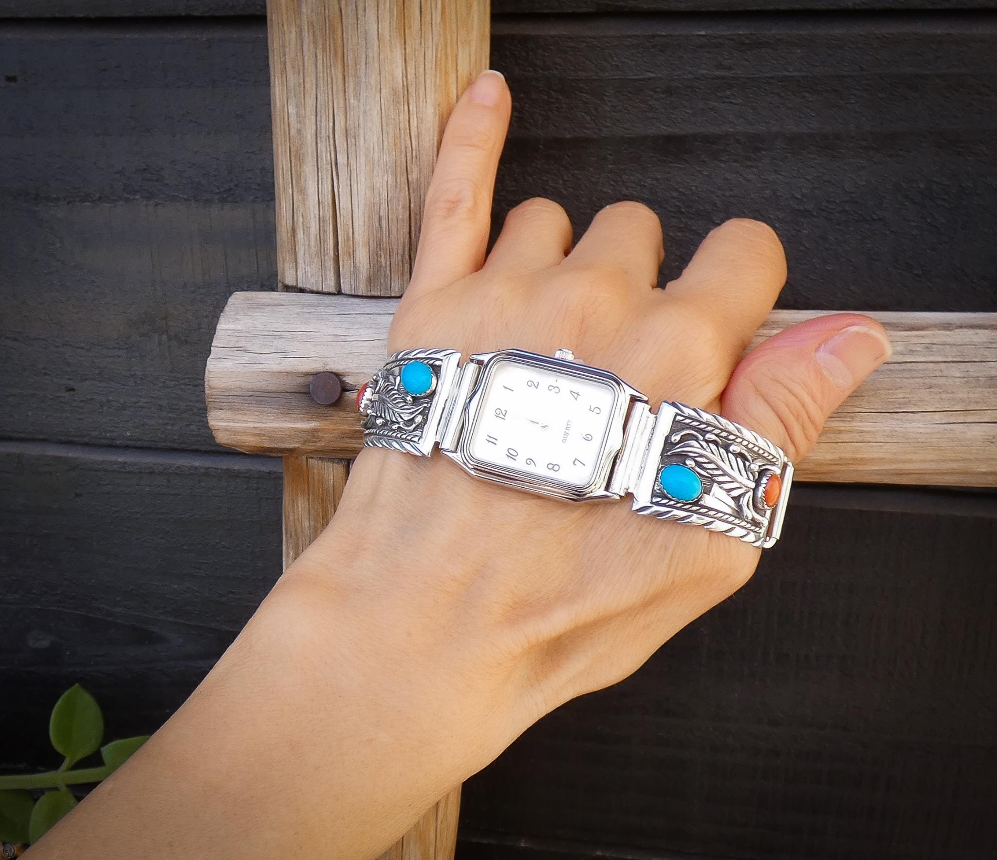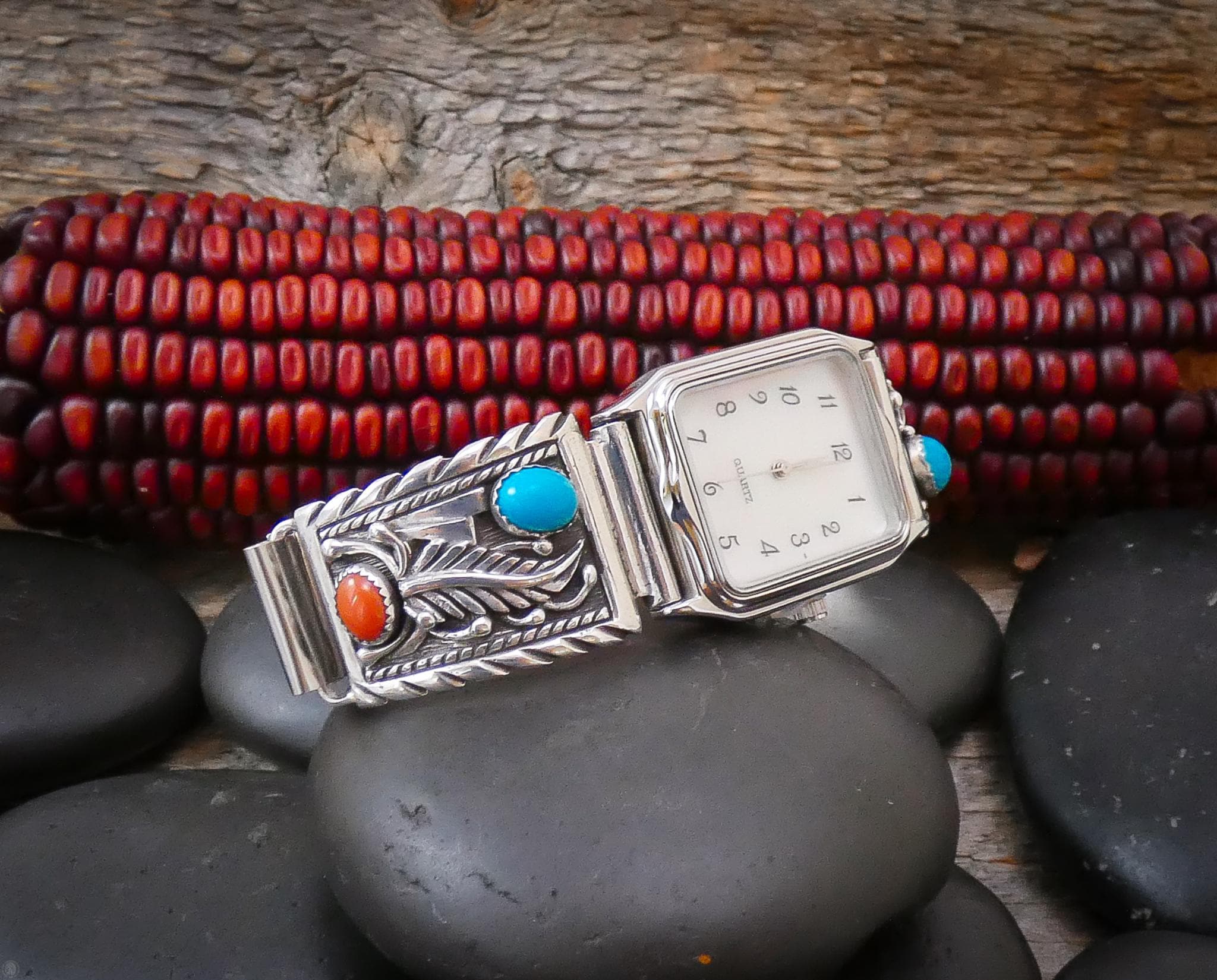 These watch tips are handcrafted from Sterling Silver into a gorgeous leaf and scroll work design, with Turquoise and Coral stones placed perfectly within each section. Such a wonderful example of Native American culture!
