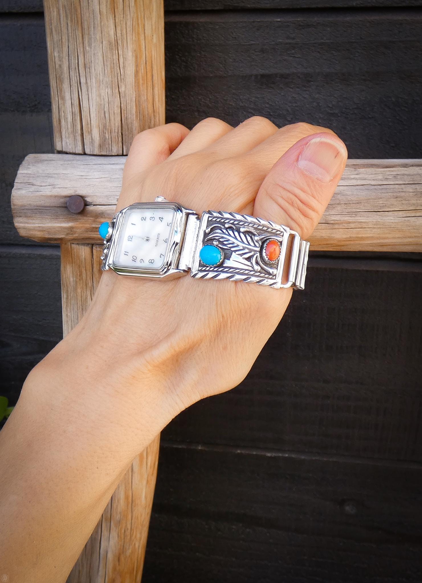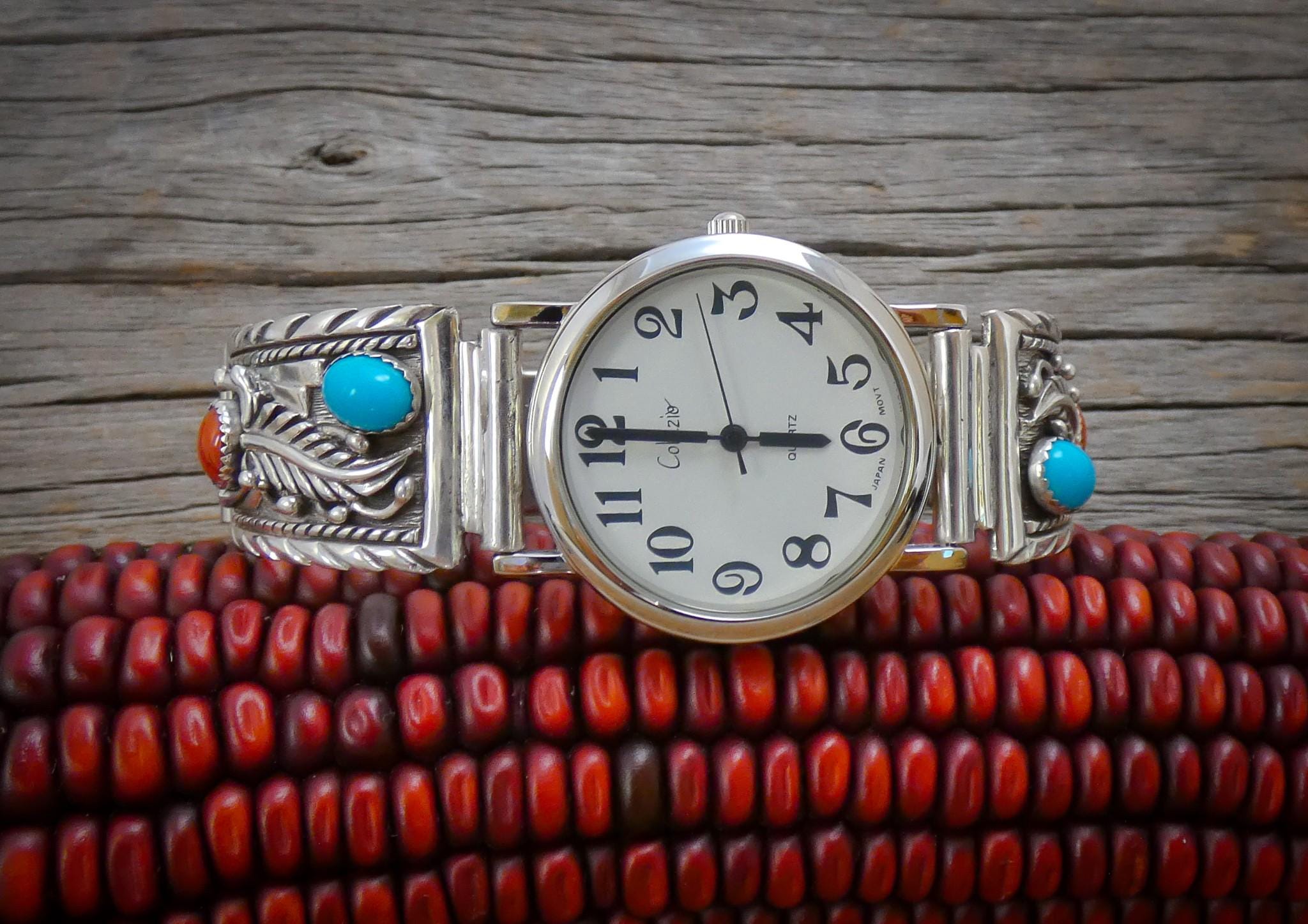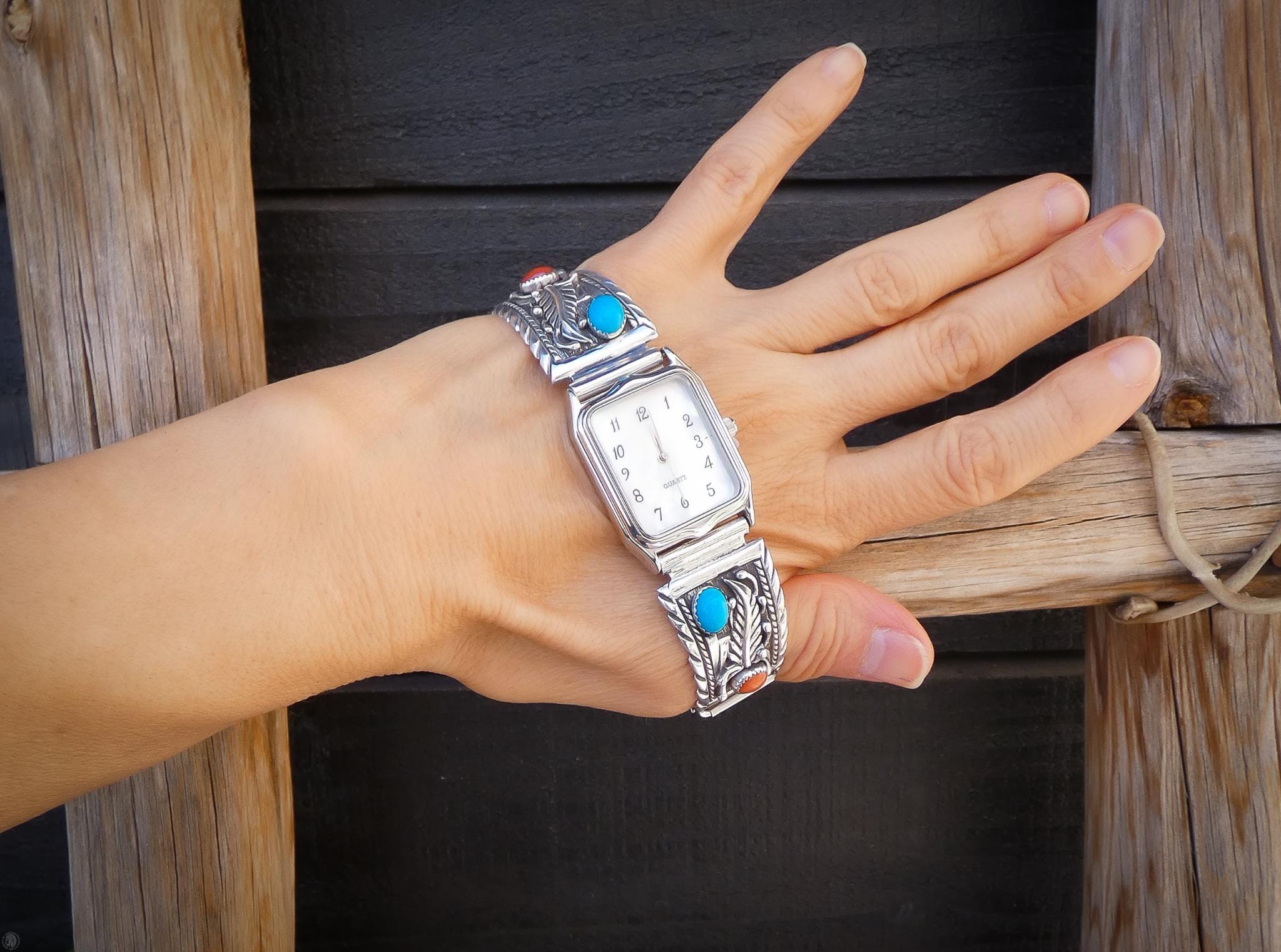 These watch tips are handcrafted from Sterling Silver into a gorgeous leaf and scroll work design, with Turquoise and Coral stones placed perfectly within each section. Such a wonderful example of Native American culture!