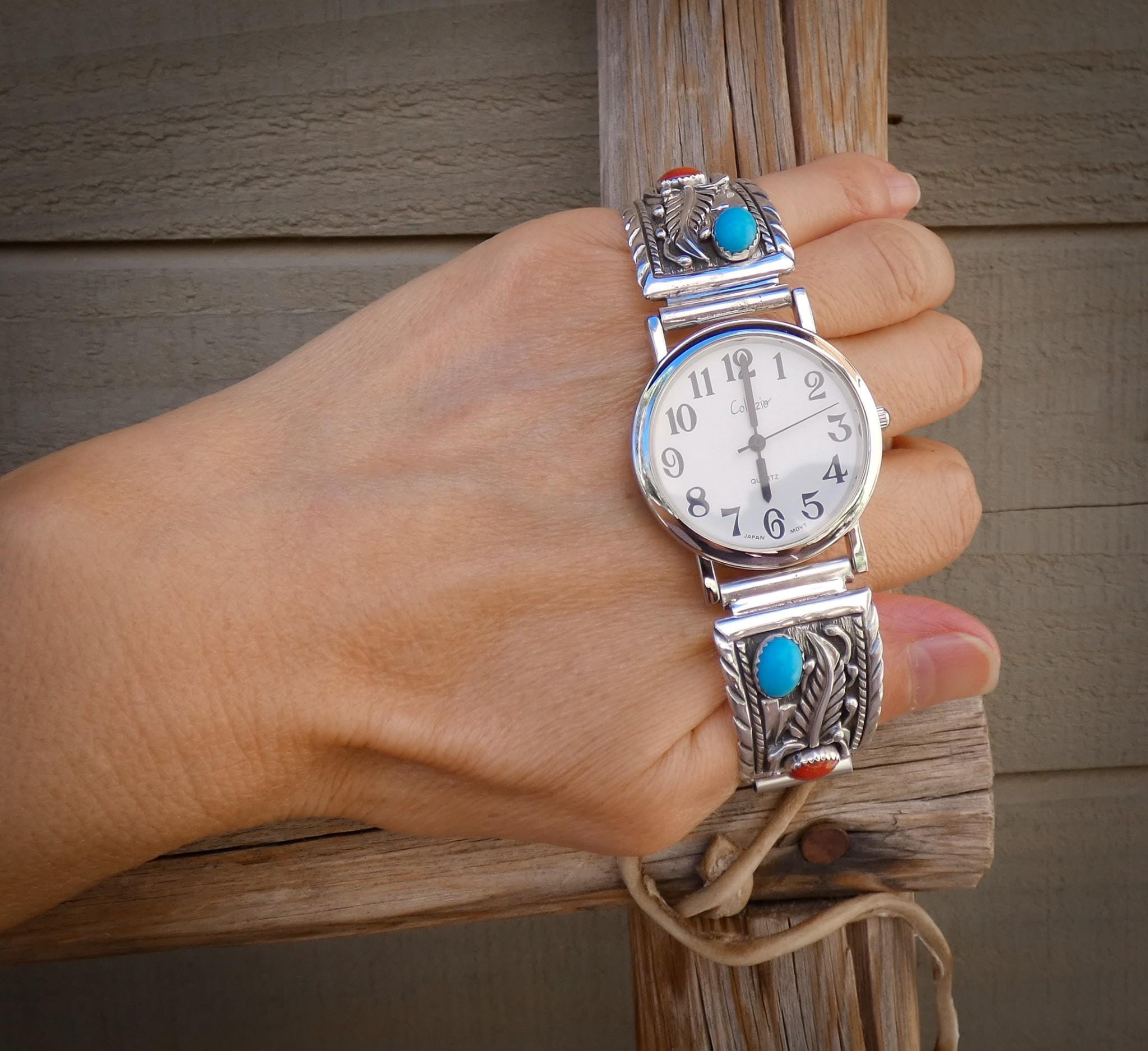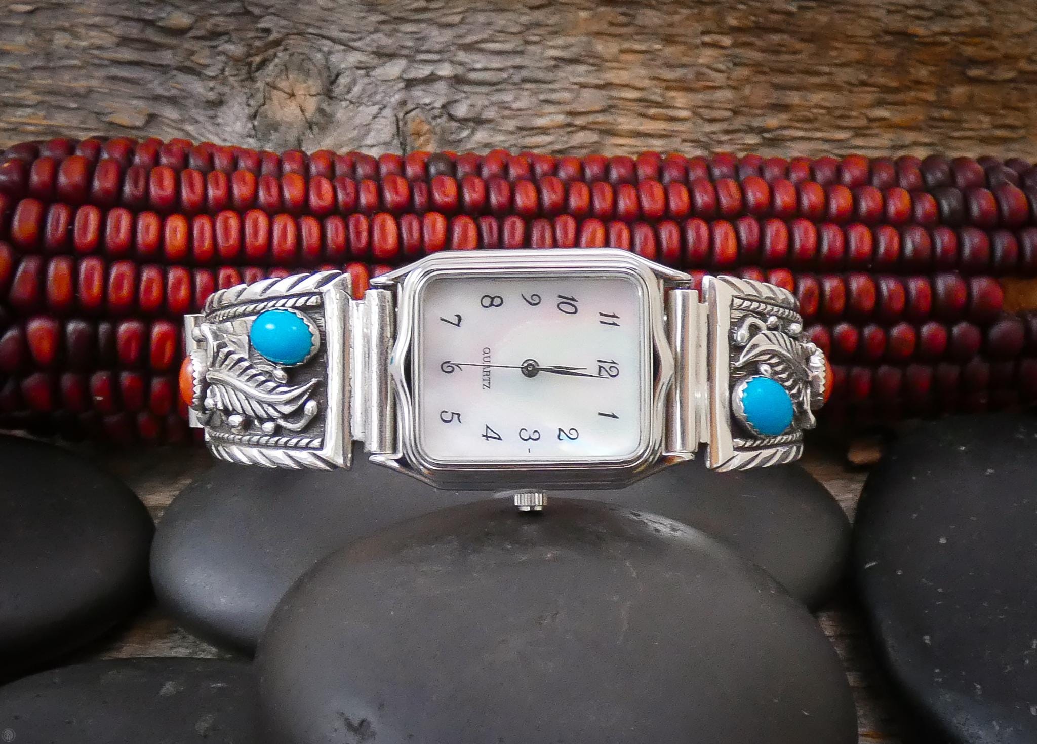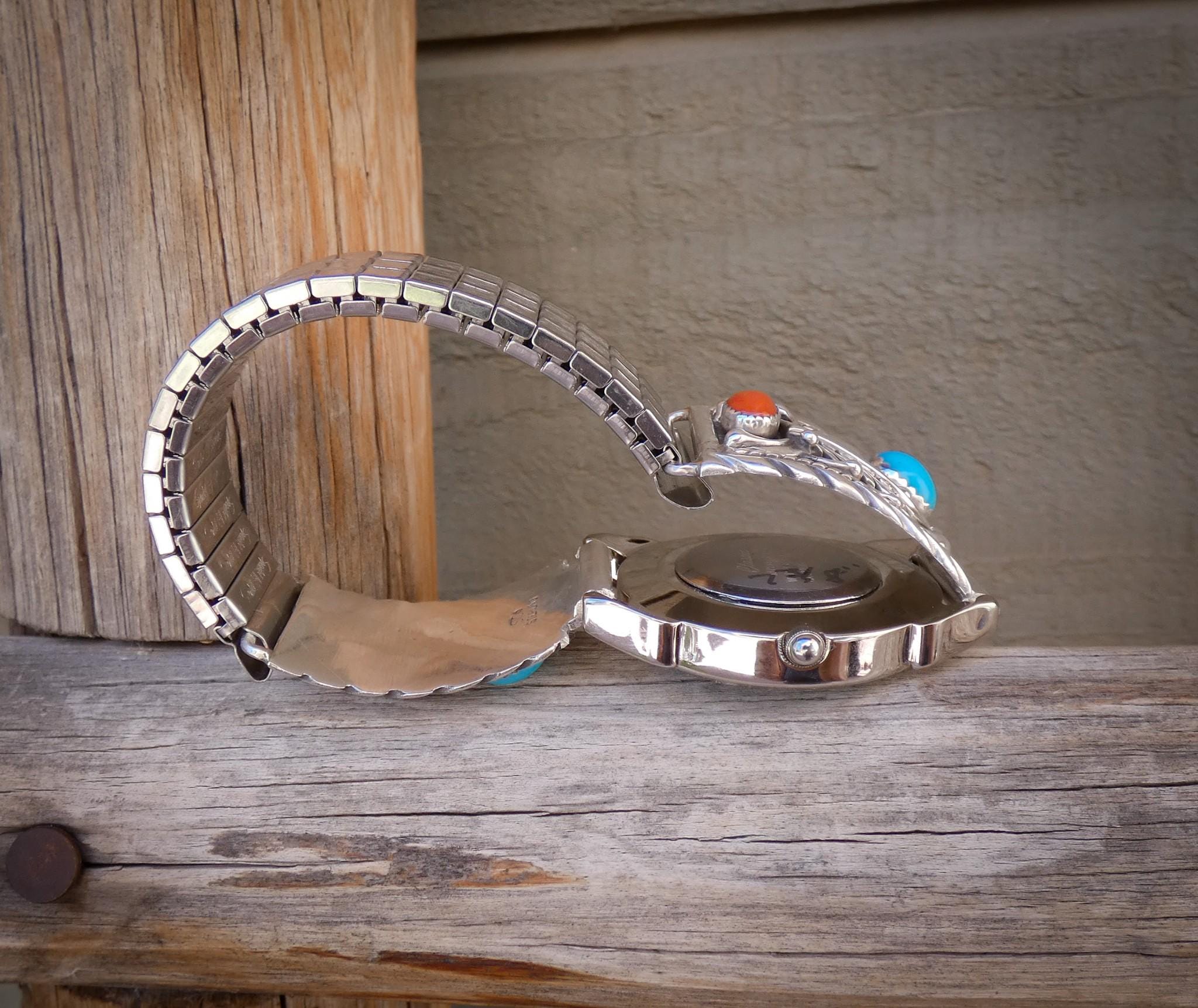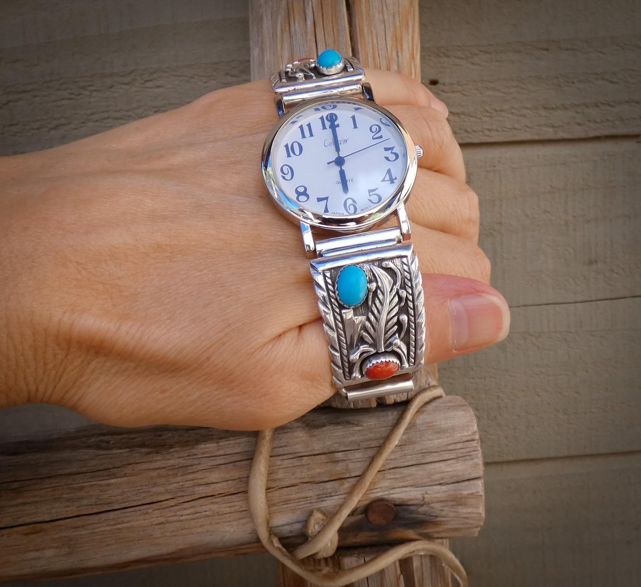 These watch tips are handcrafted from Sterling Silver into a gorgeous leaf and scroll work design, with Turquoise and Coral stones placed perfectly within each section. Such a wonderful example of Native American culture!