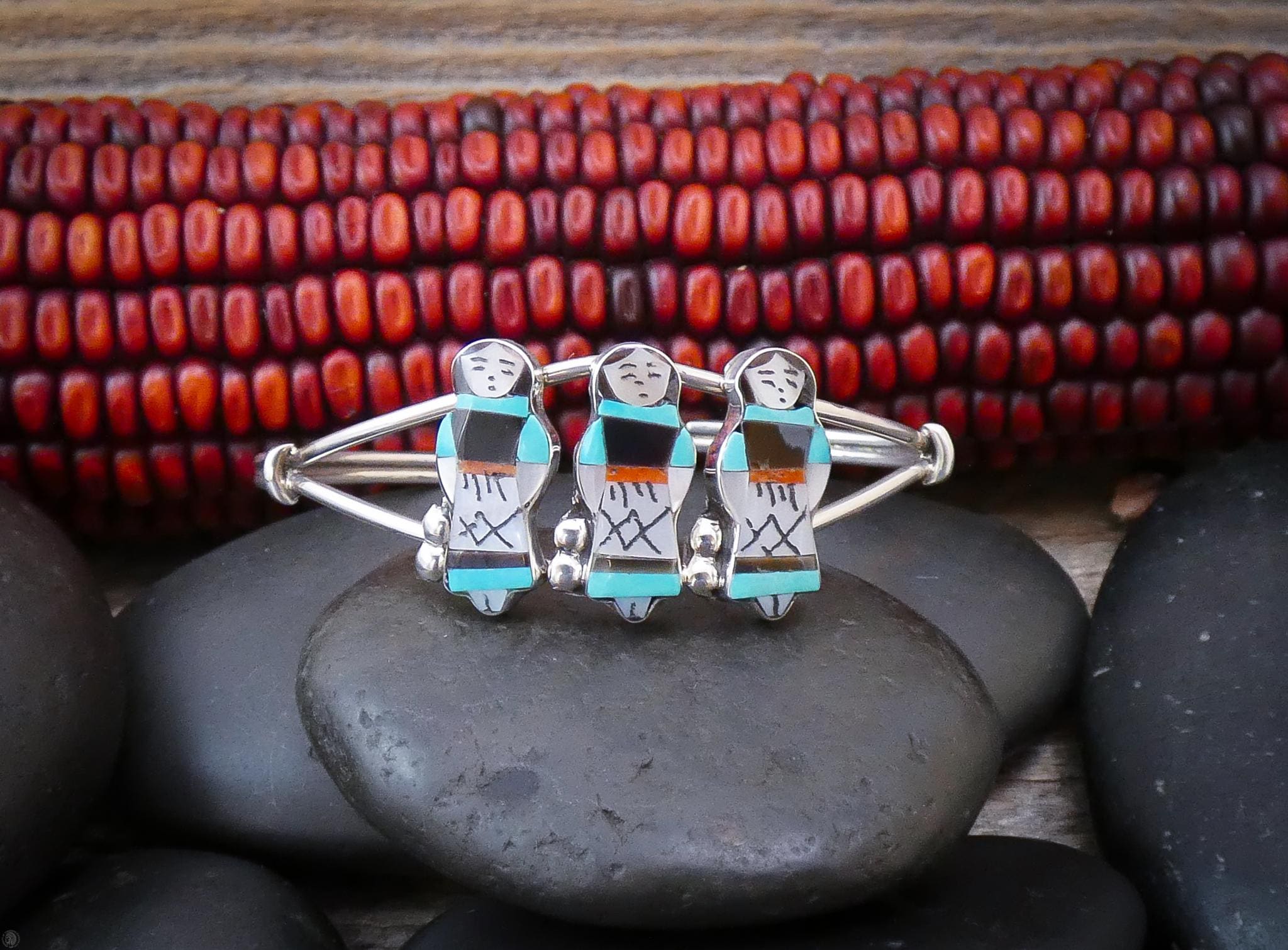 Sterling silver inlaid Zuni Maiden cuff bracelet. The Maiden is 22mm tall x 8mm wide. Mother of Pearl, Jet, Turquoise and Coral were used to do the inlay. Theresa Waseta is known for her unique personal touch, and her artisan craftsmanship will be sure to add an artistic flair to any outfit that will catch the eyes of many.