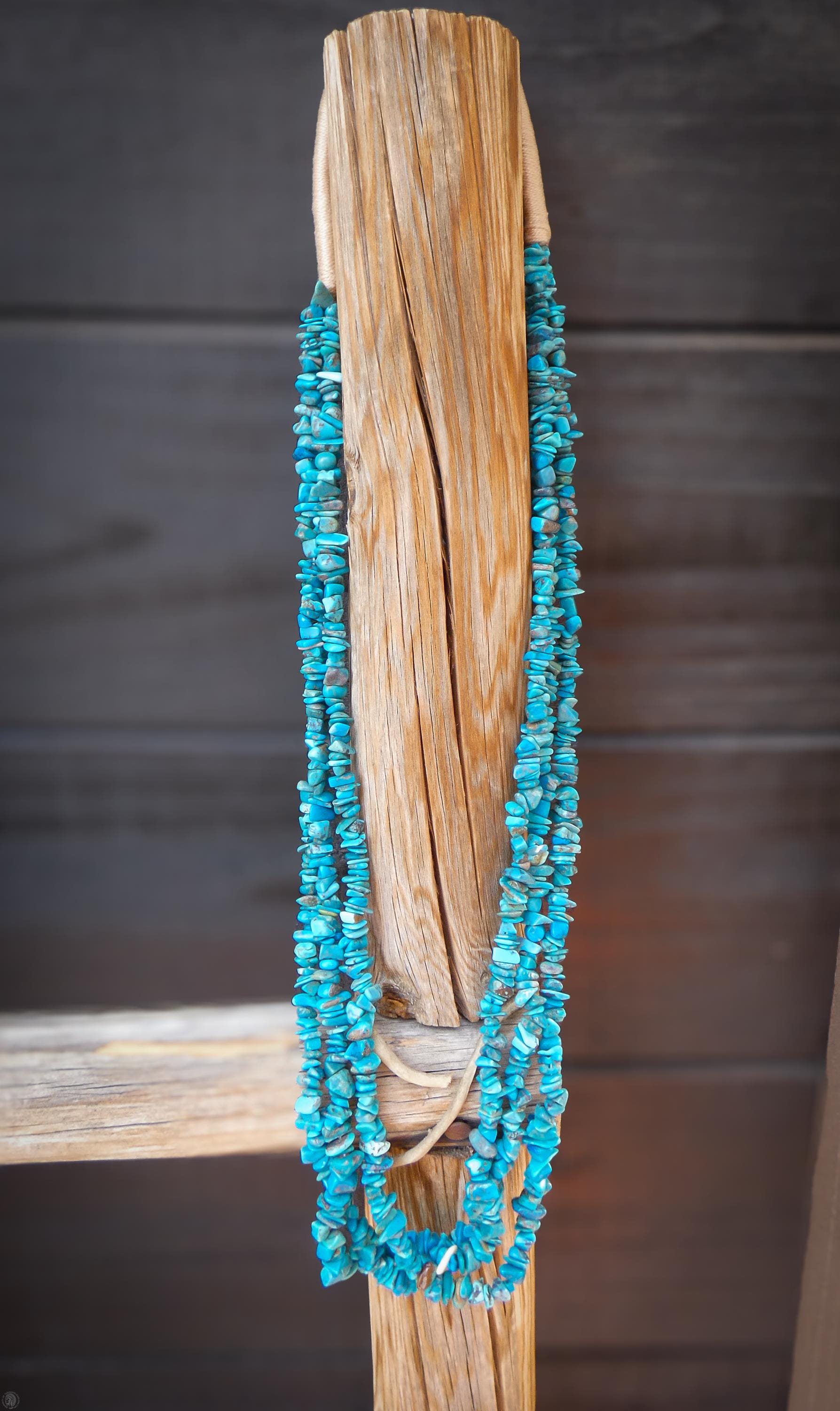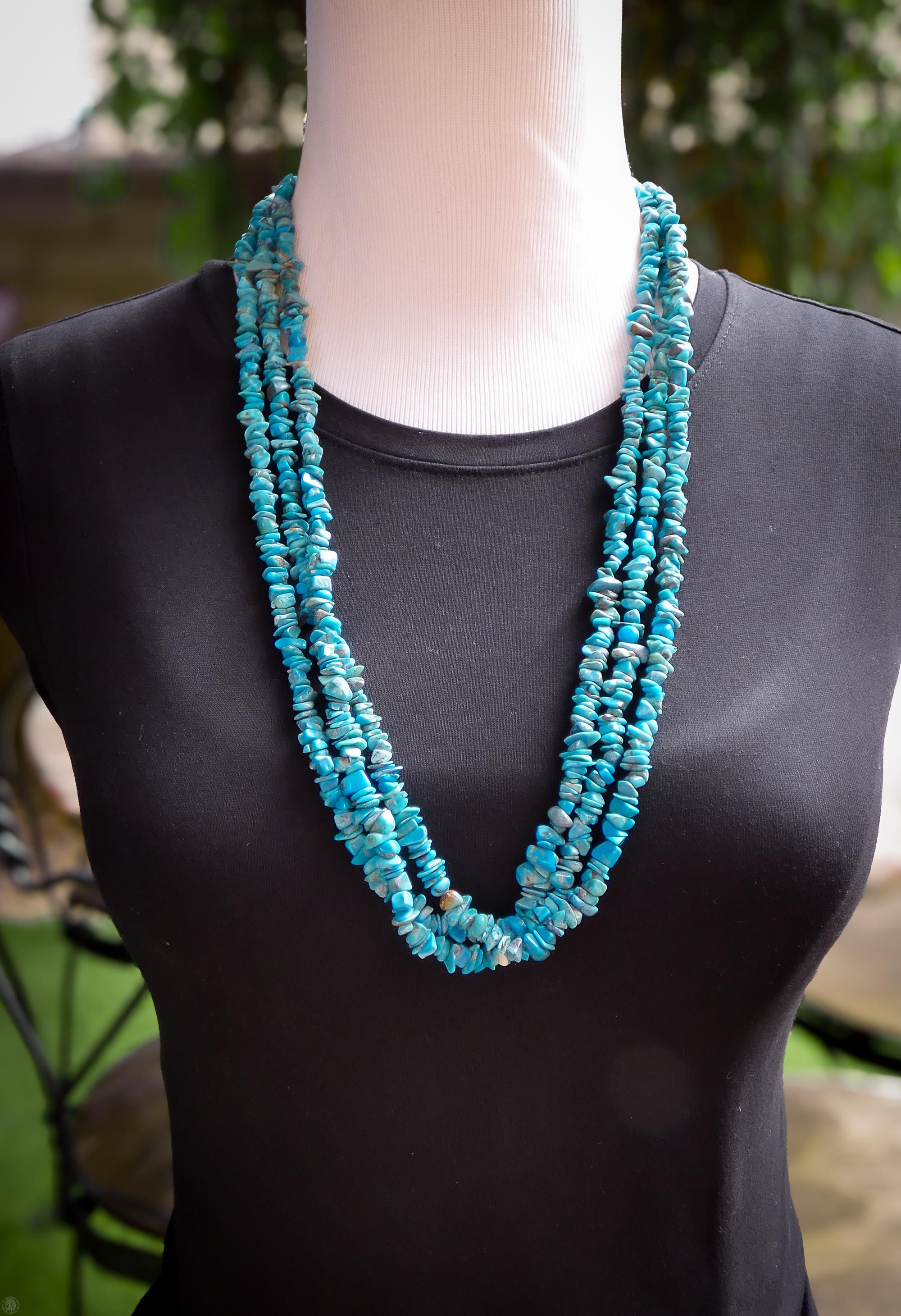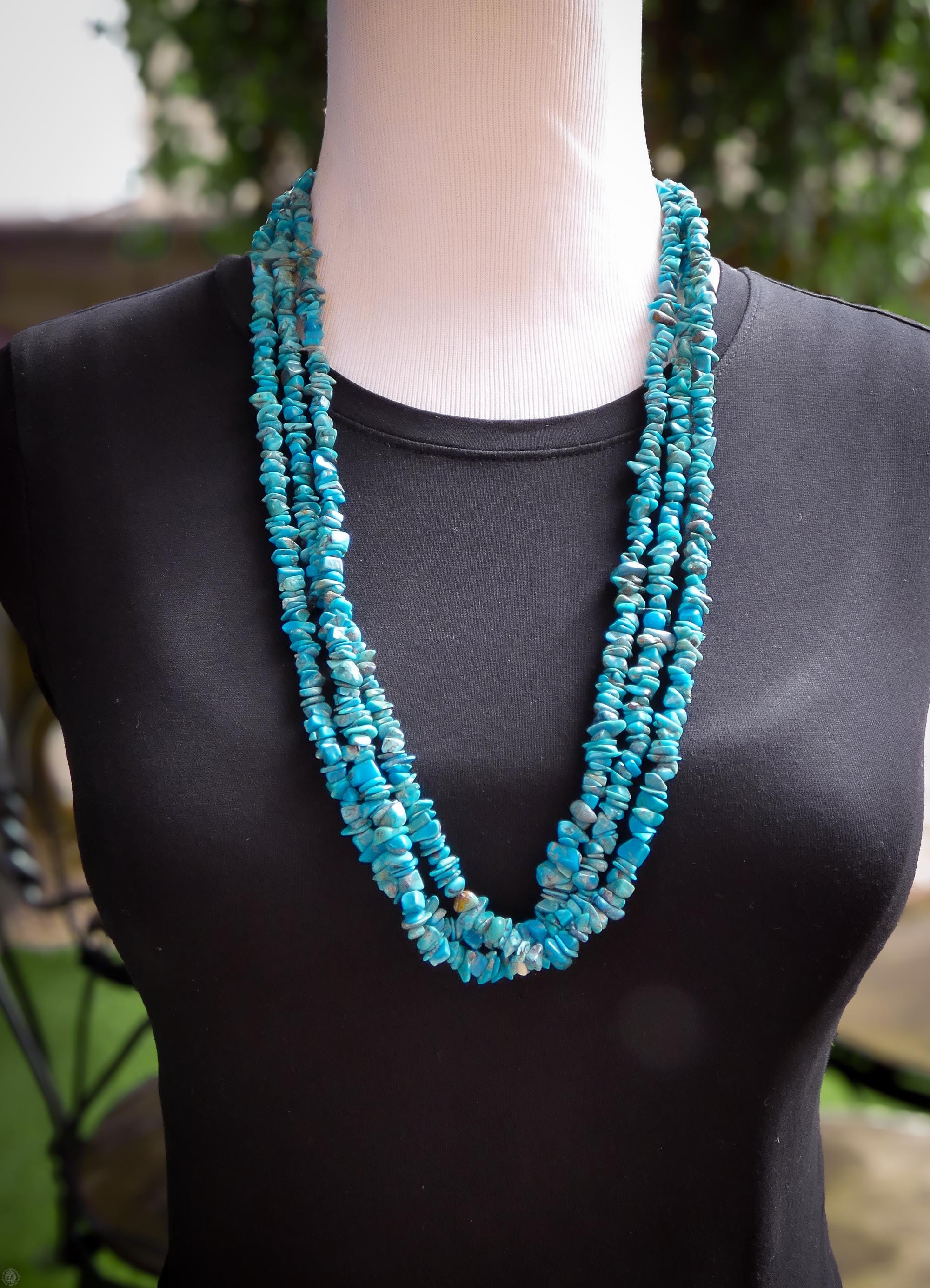 This vintage Santo Domingo necklace is that vintage wardrobe accessory that you've been searching for. It is handcrafted with 3 strands of beautiful vivid Turquoise stones and pin shell. This is perfect for dressing up any outfit! Native American handmade.