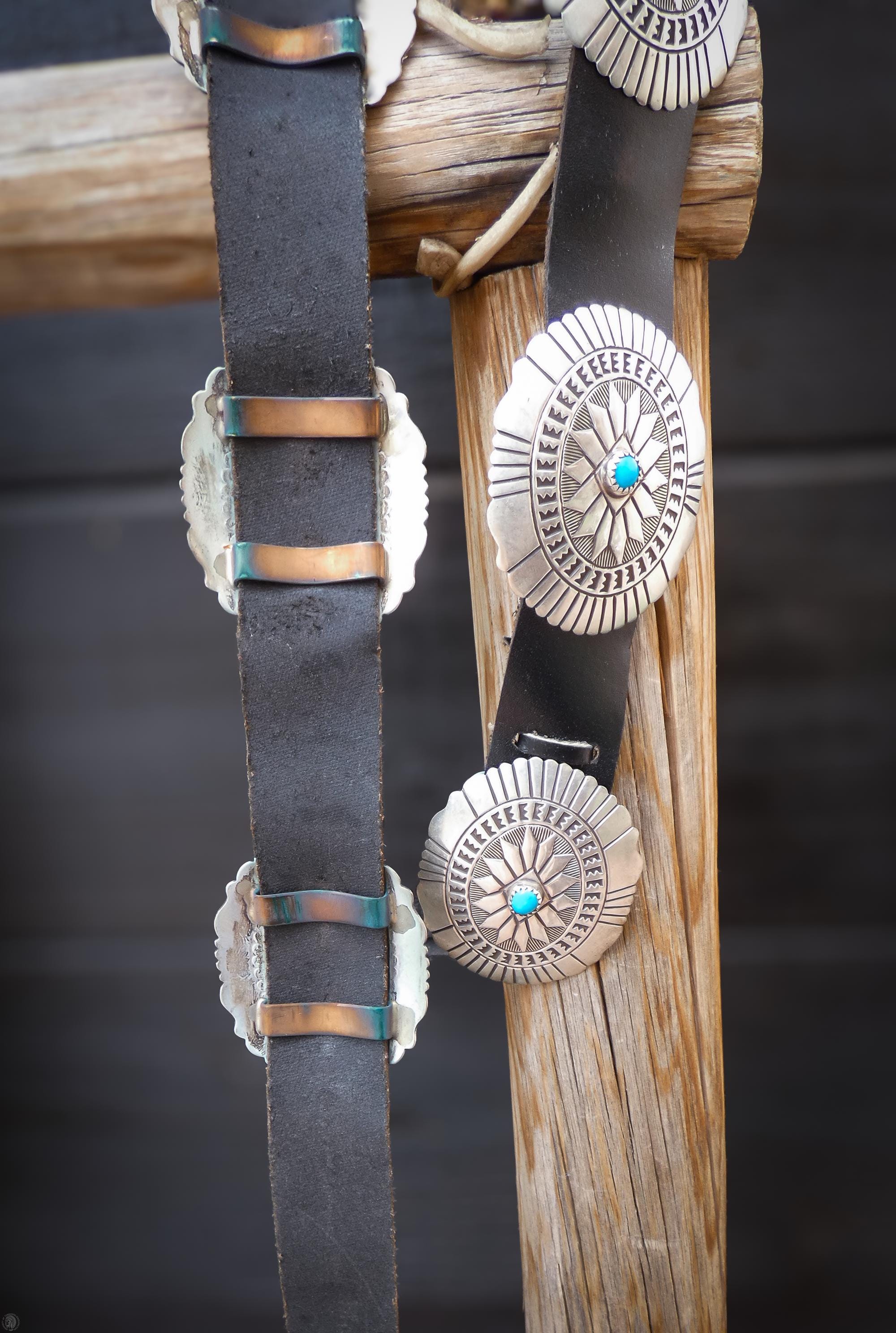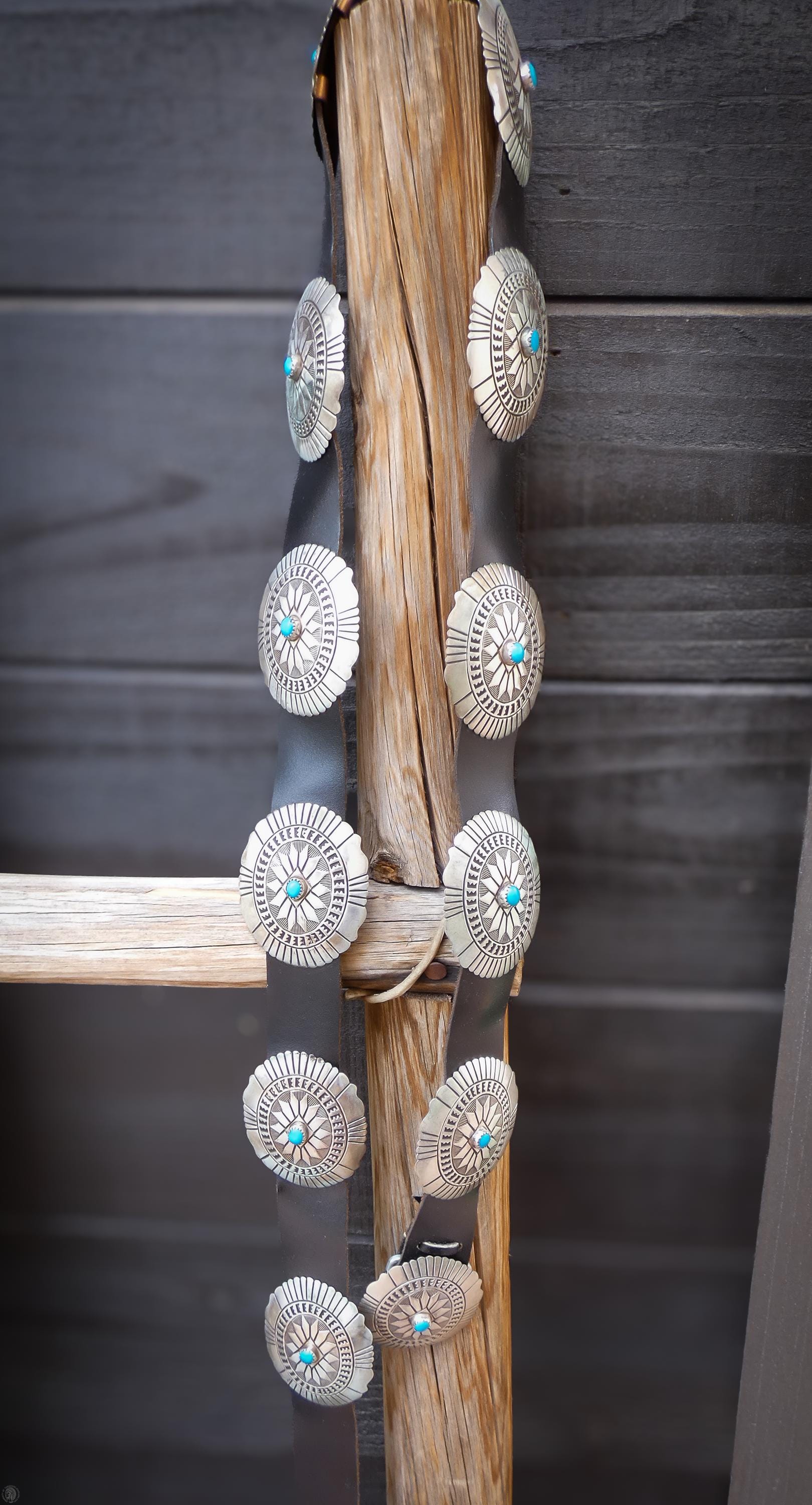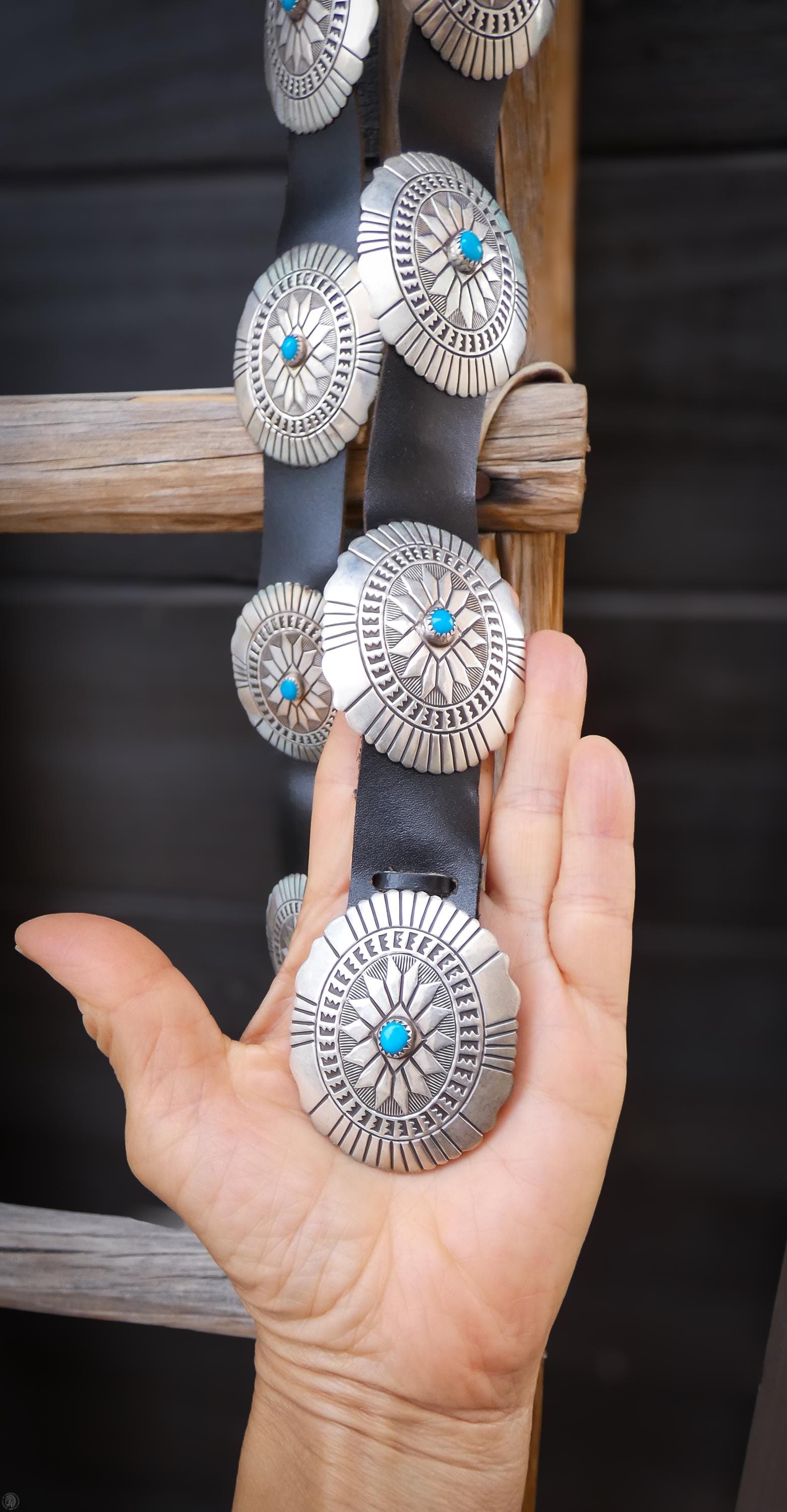 This authentic Native American Navajo leather belt is handcrafted from Sterling Silver with Kingman Turquoise accents in a traditional hand tooled design. It feels substantial, yet comfortable to wear all day. This traditional Navajo accessory will add that Southwestern signature to your wardrobe, certain to be a conversation starter.