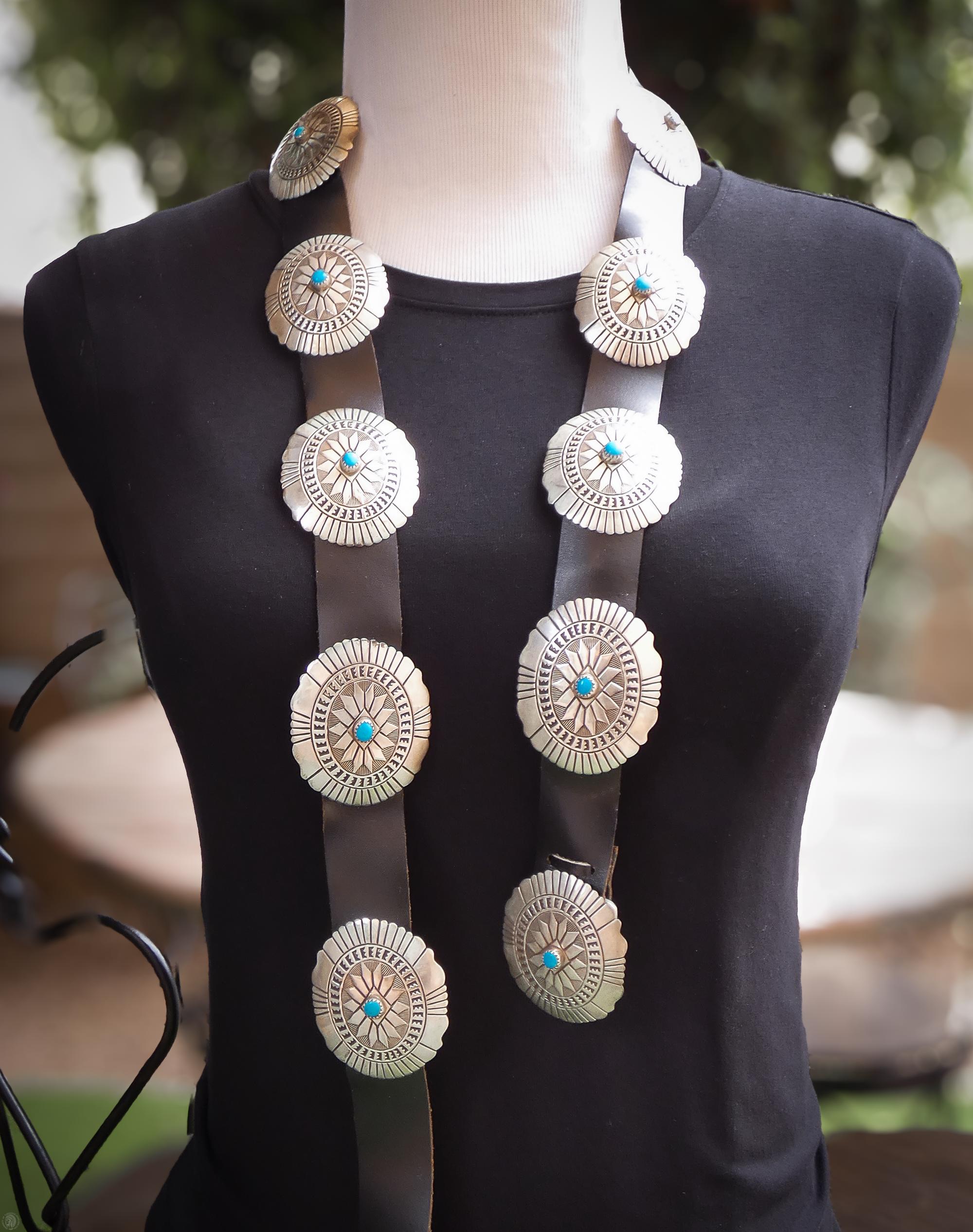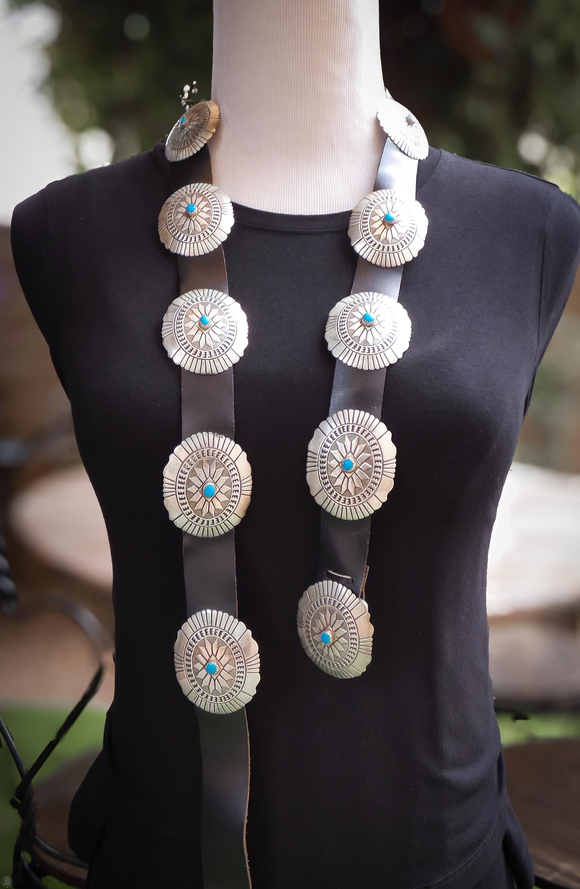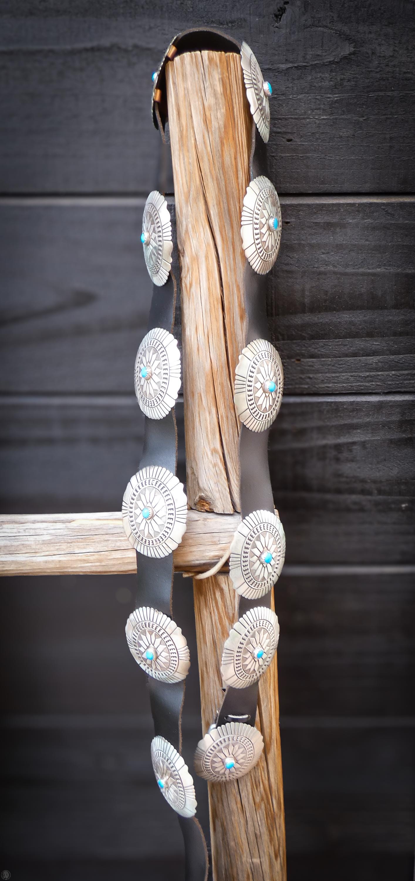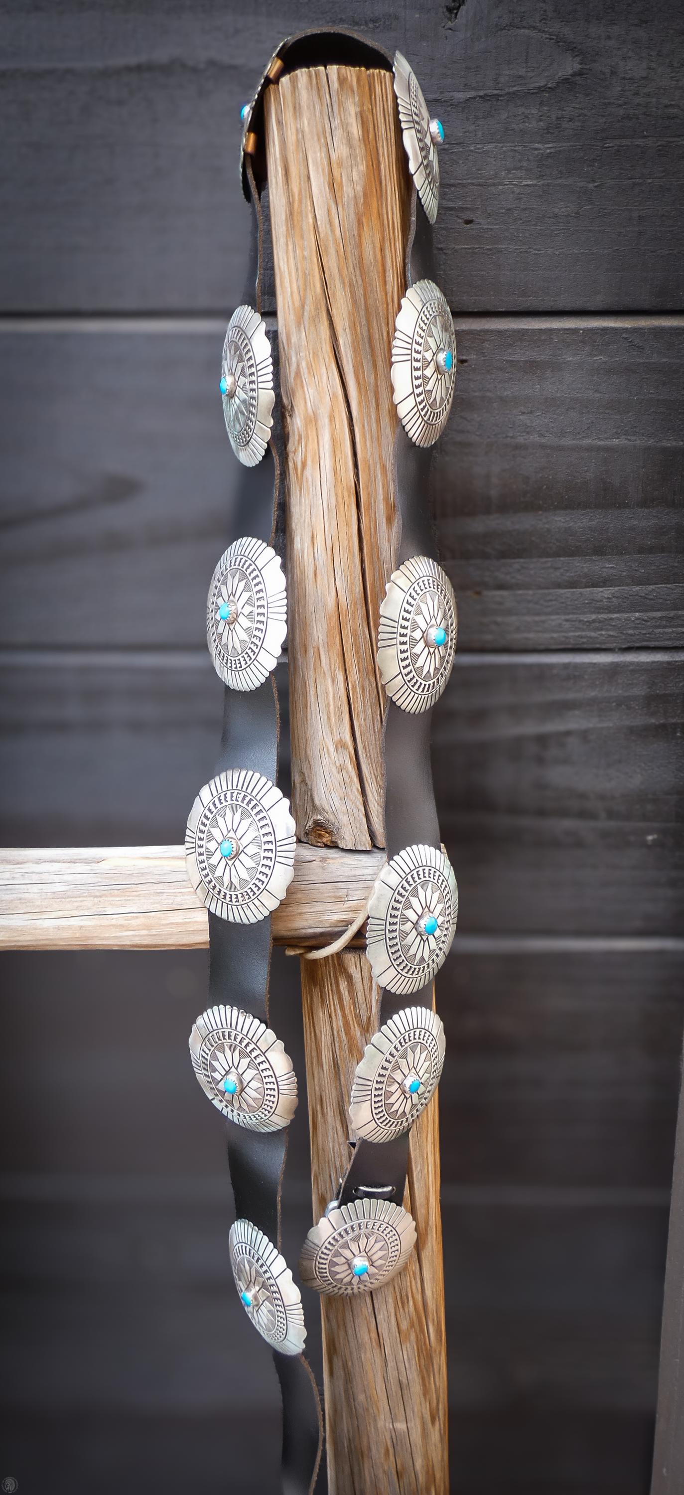 This authentic Native American Navajo leather belt is handcrafted from Sterling Silver with Kingman Turquoise accents in a traditional hand tooled design. It feels substantial, yet comfortable to wear all day. This traditional Navajo accessory will add that Southwestern signature to your wardrobe, certain to be a conversation starter.