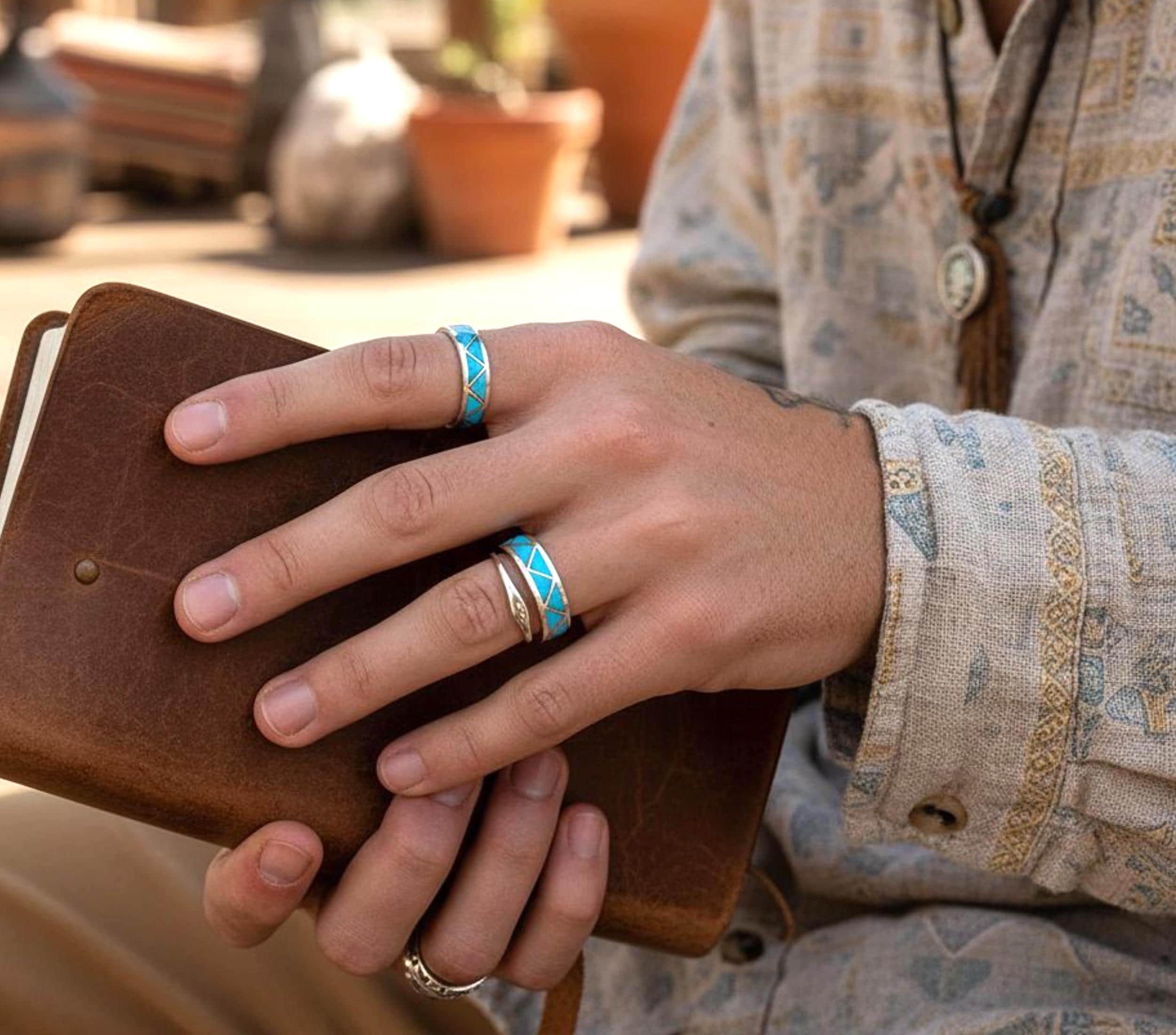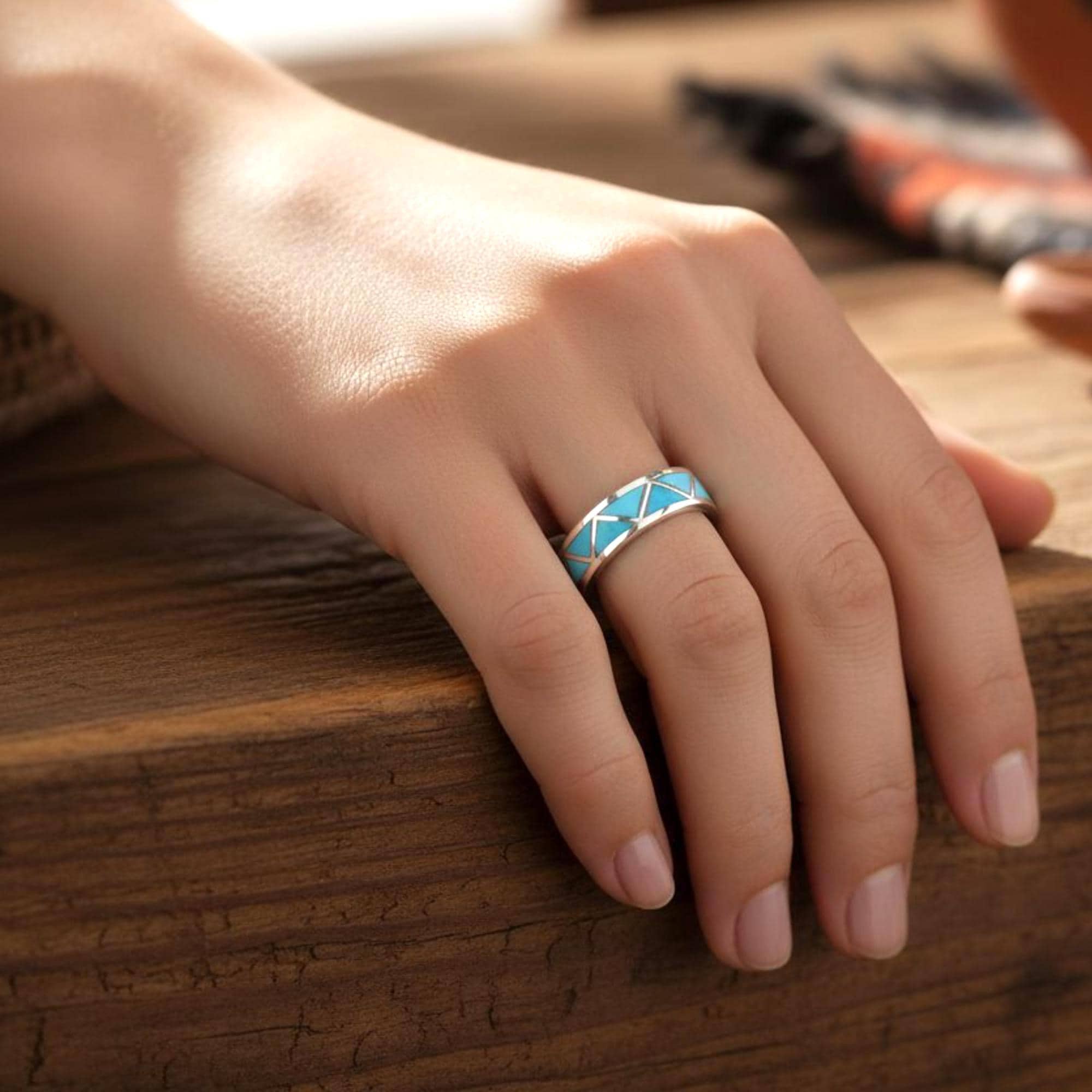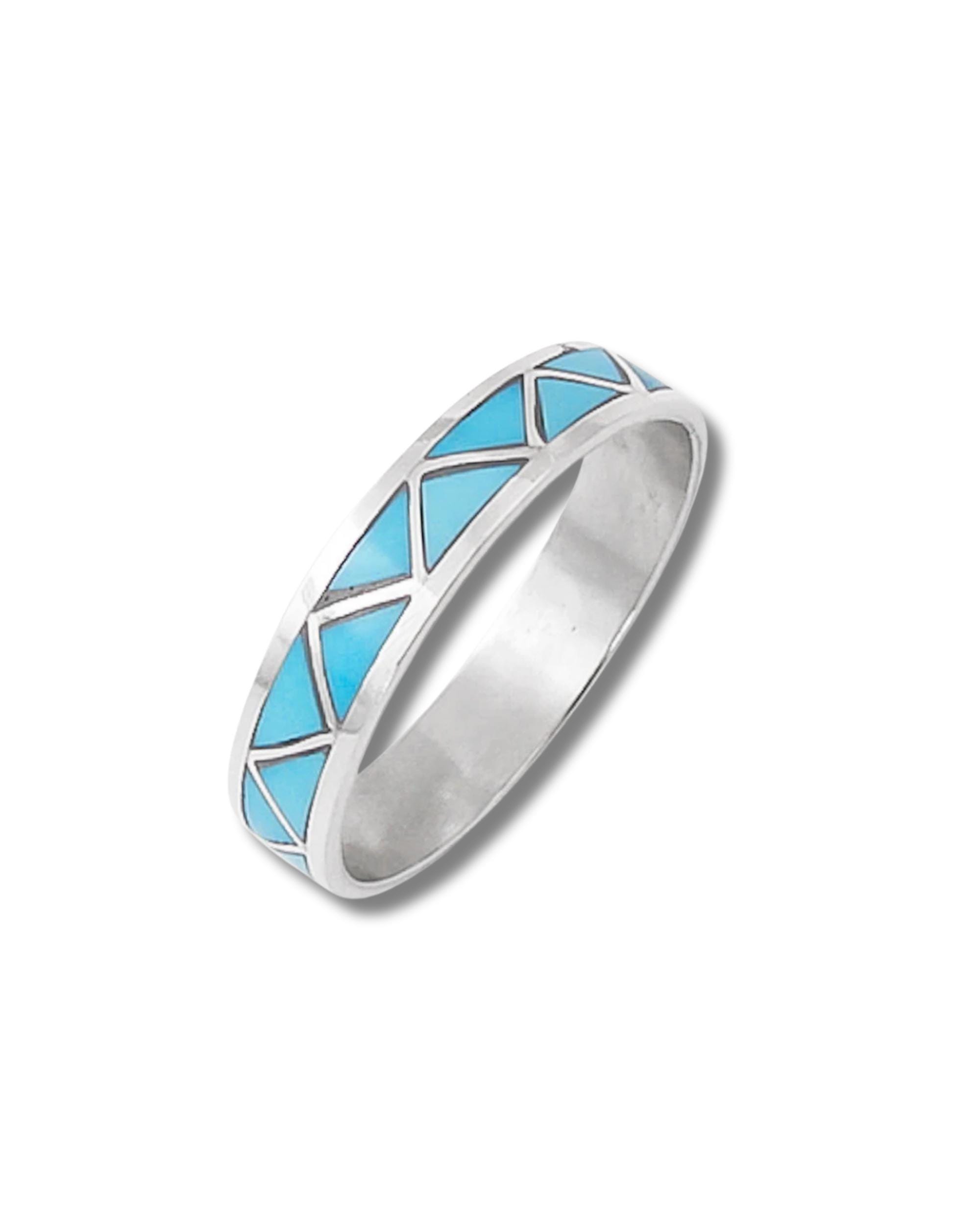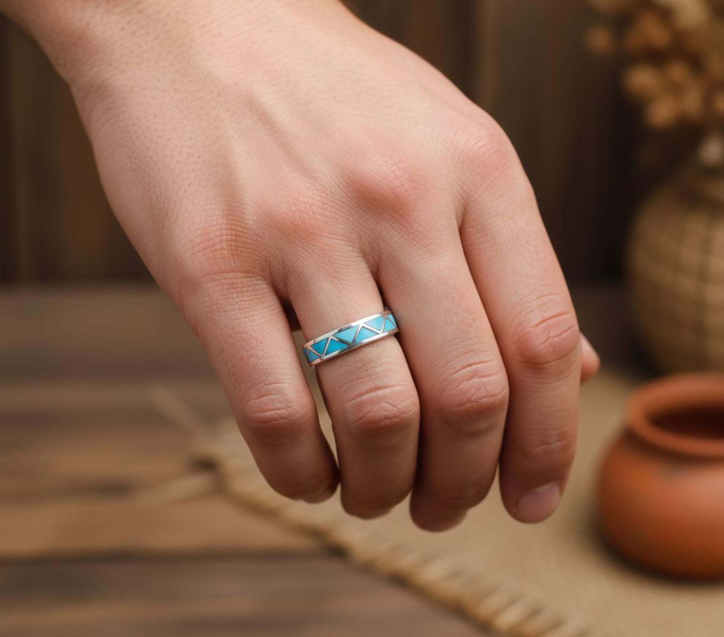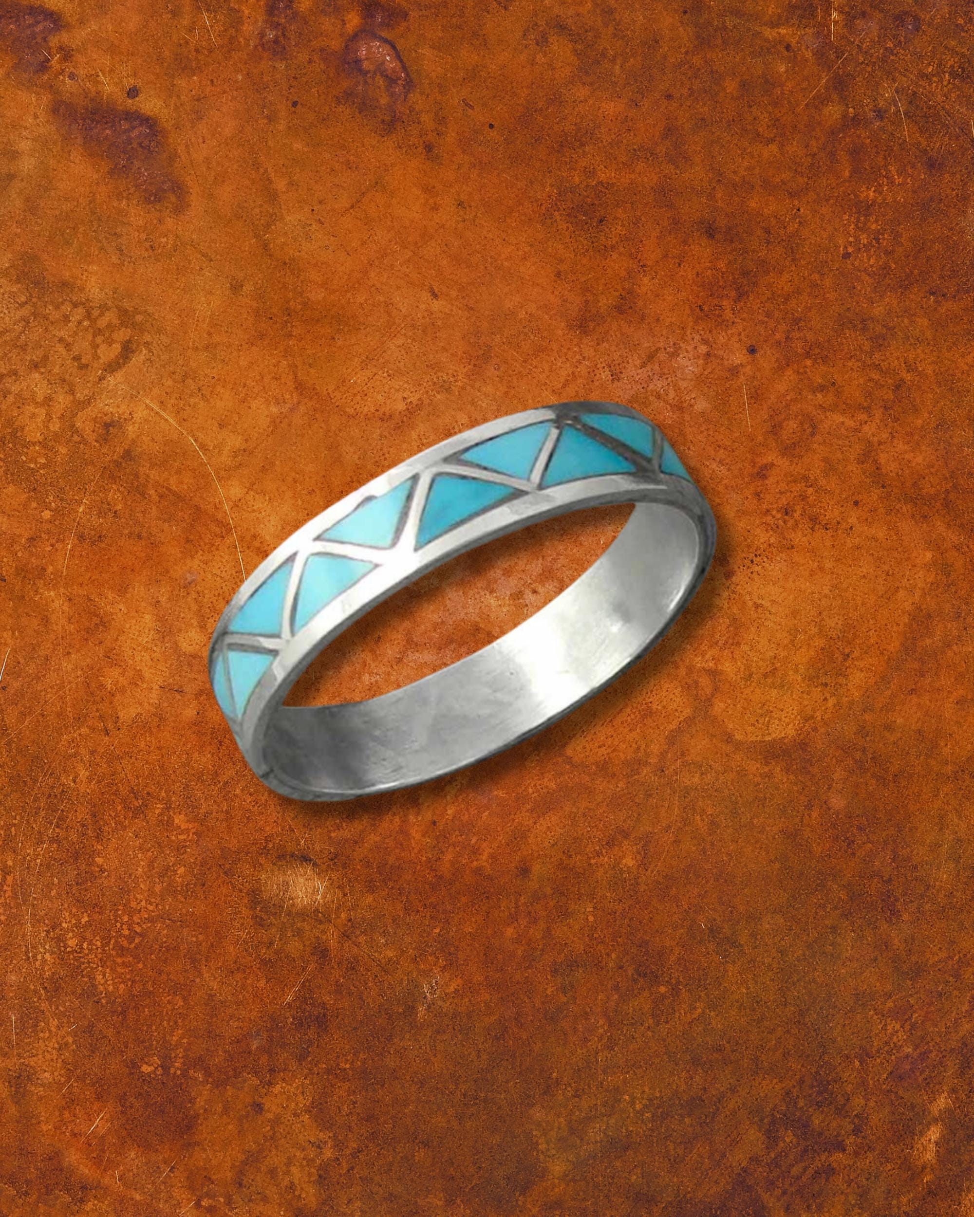 This Zuni ring is handcrafted with Sterling Silver with natural Turquoise inlaid stones. The silver bars separating the inlaid stones are a creative design element indicative of traditional Zuni styling. This ring has all the precision and delicacy that Zuni silversmiths are famous for.