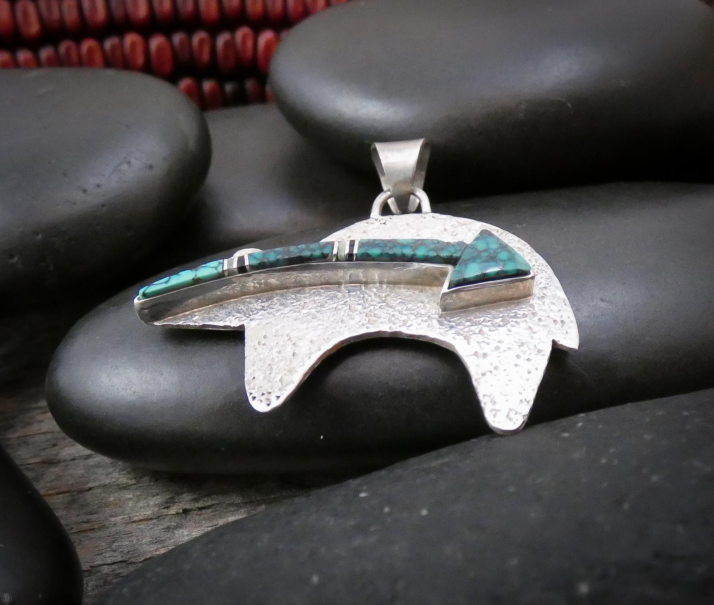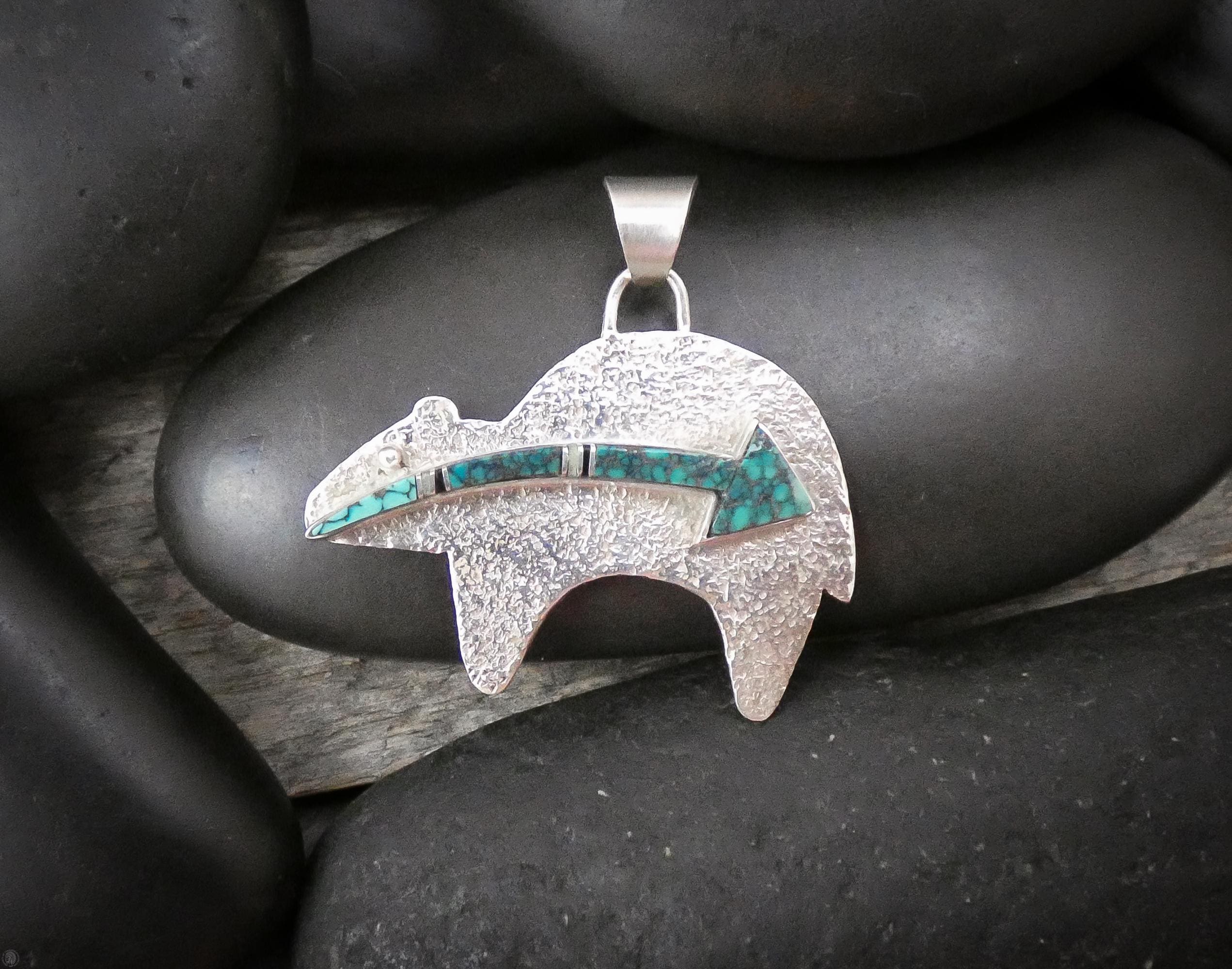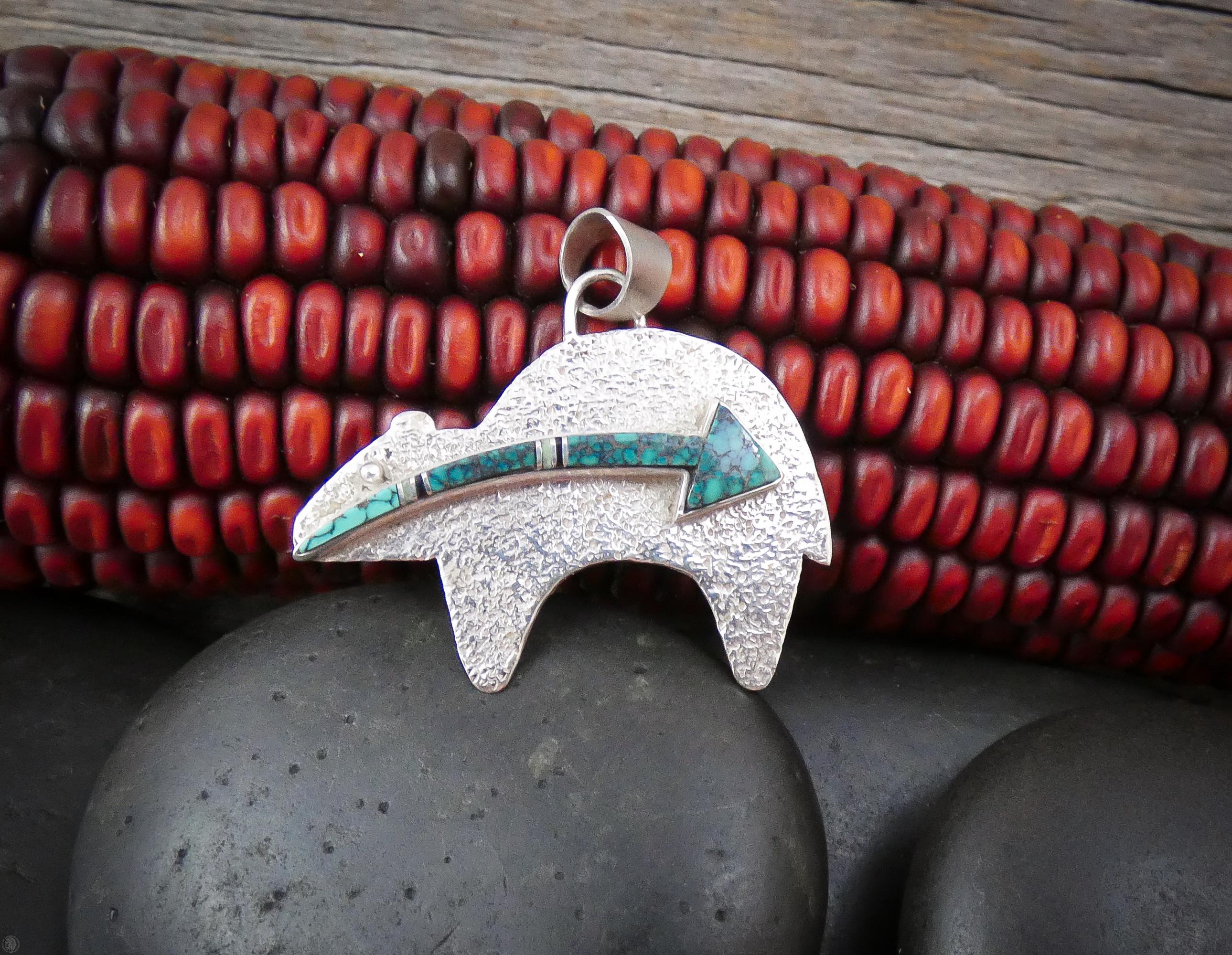 This is a special gift for those who appreciate the spiritual meaning behind the jewelry. This unique Bear fetish Pendant is handcrafted with Sterling Silver and has a heart line design with inlaid Turquoise. The bear fetish signifies many things. It is known as the Guardian of the West and has the power to heal and transform human passions into true wisdom. This is an item that will certainly be cherished and appreciated by anyone who enjoys unique handcrafted jewelry!