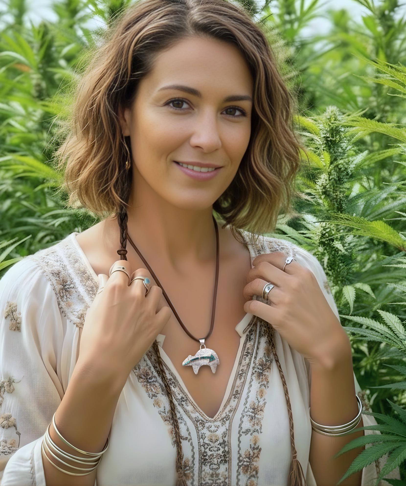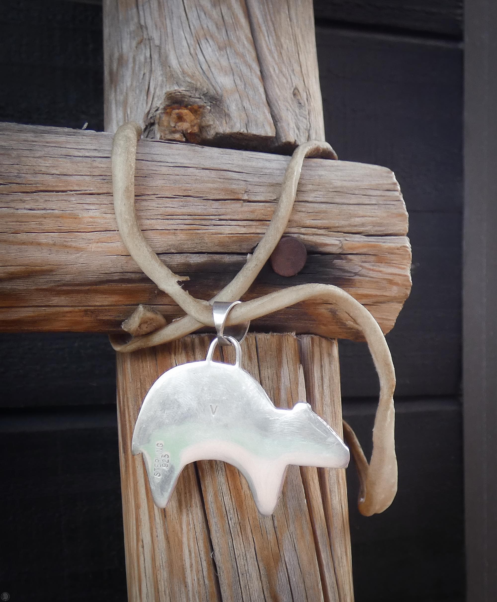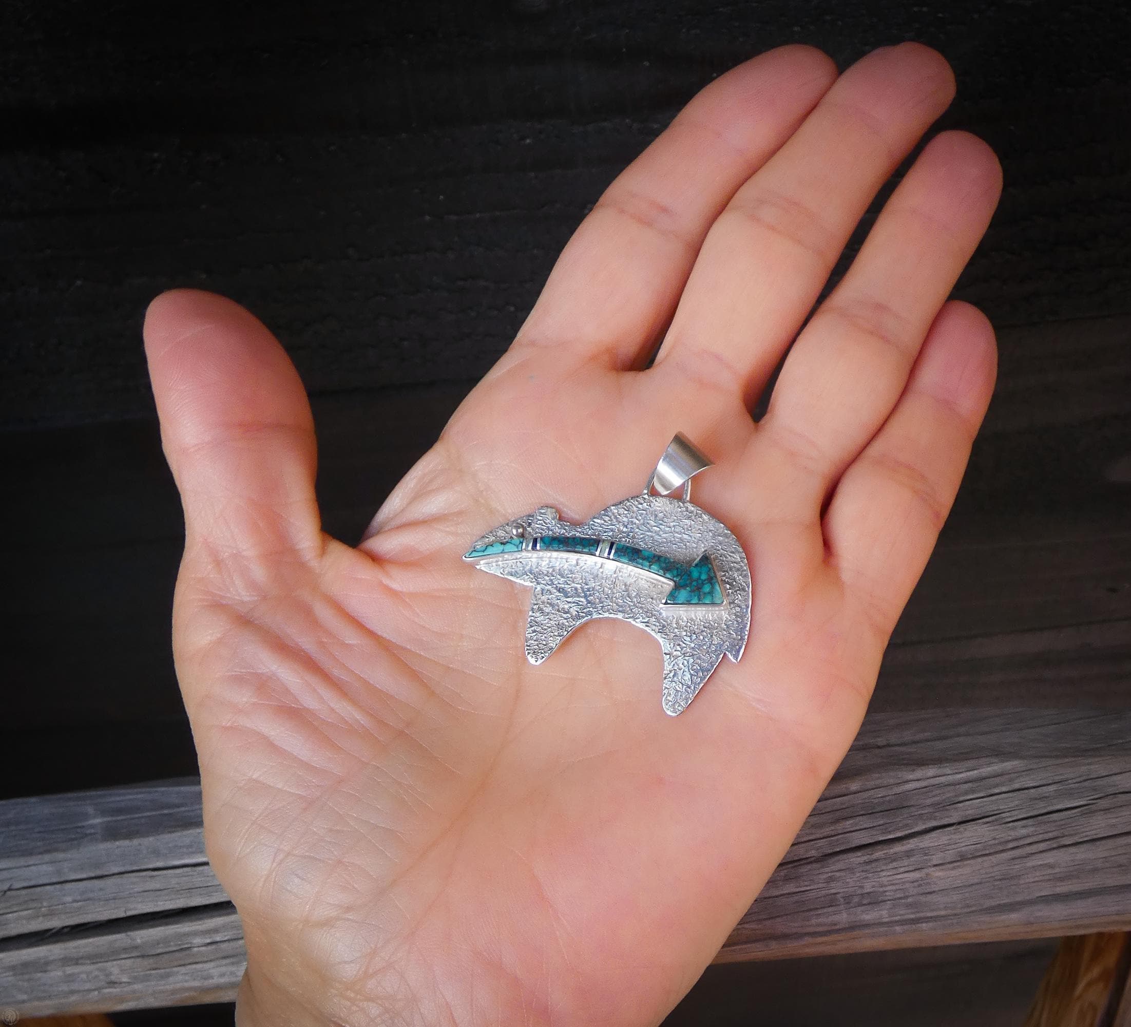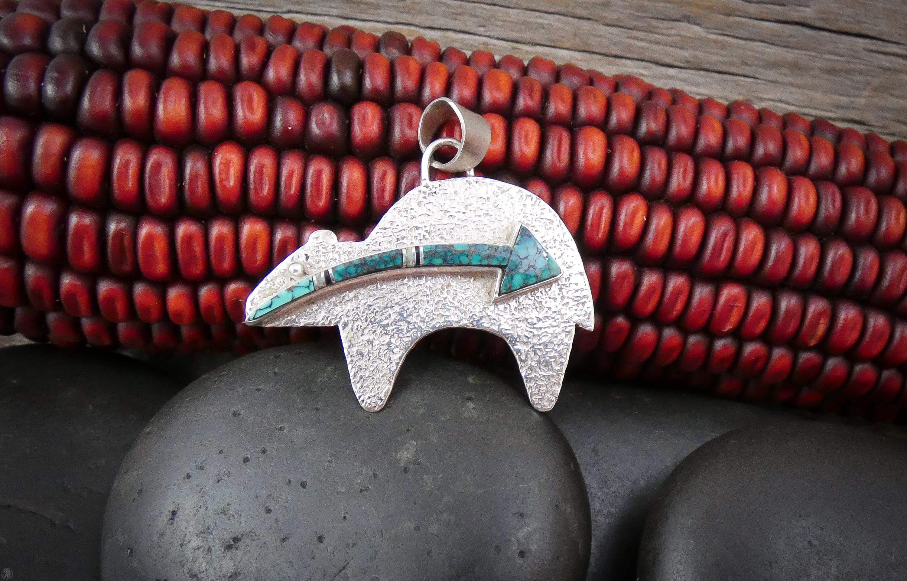 This is a special gift for those who appreciate the spiritual meaning behind the jewelry. This unique Bear fetish Pendant is handcrafted with Sterling Silver and has a heart line design with inlaid Turquoise. The bear fetish signifies many things. It is known as the Guardian of the West and has the power to heal and transform human passions into true wisdom. This is an item that will certainly be cherished and appreciated by anyone who enjoys unique handcrafted jewelry!