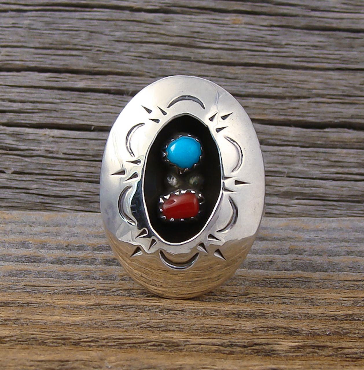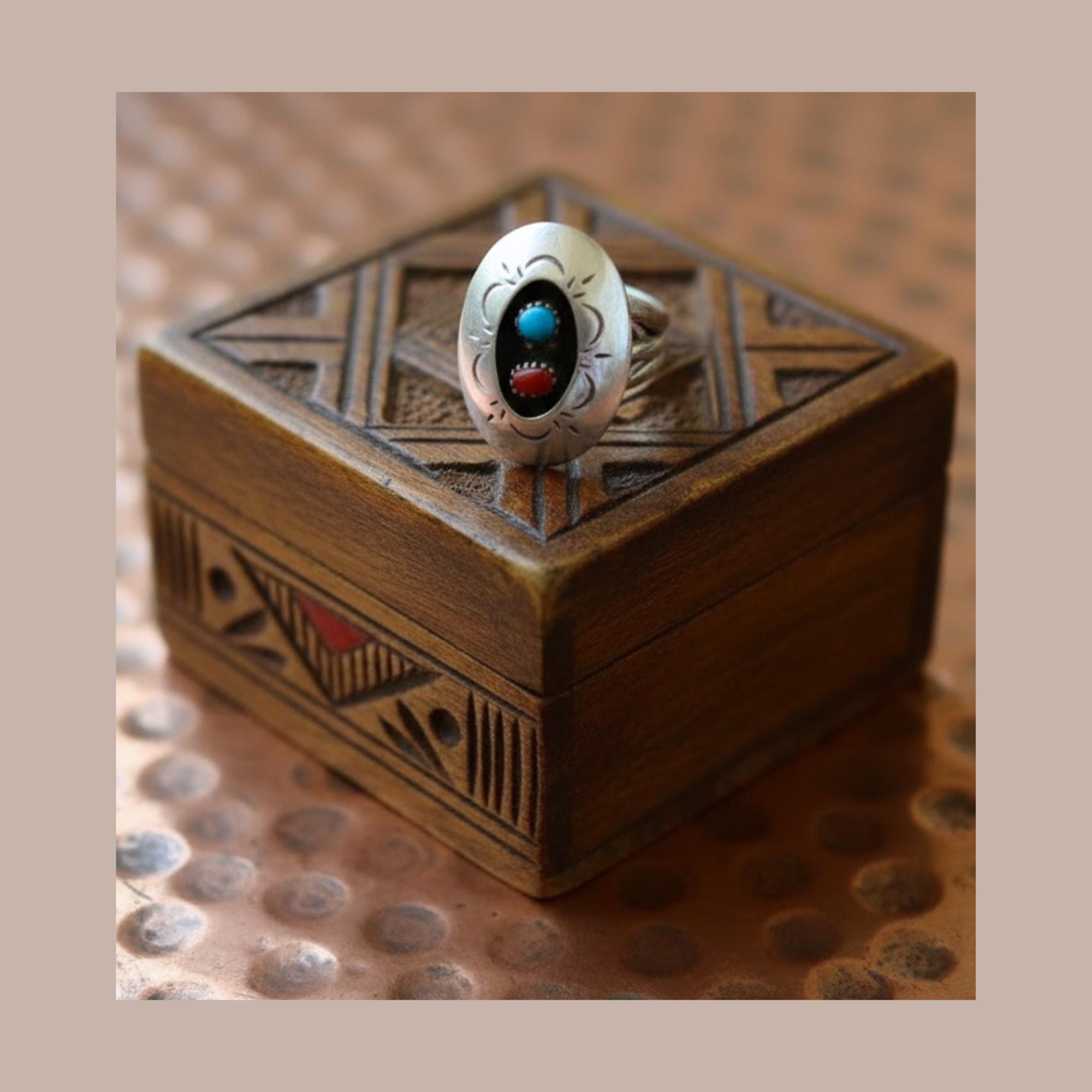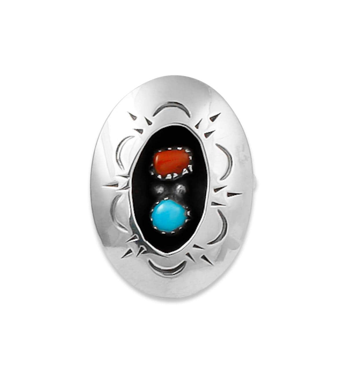 Wear something with Navajo tradition! This ring is made in a timeless style with Sterling Silver, Turquoise, and Coral into a shadow box design. The combination of the two stones is used in Native American jewelry because of the great vivid color contrast. This is perfect for art lovers who appreciate handcrafted Native American made jewelry!