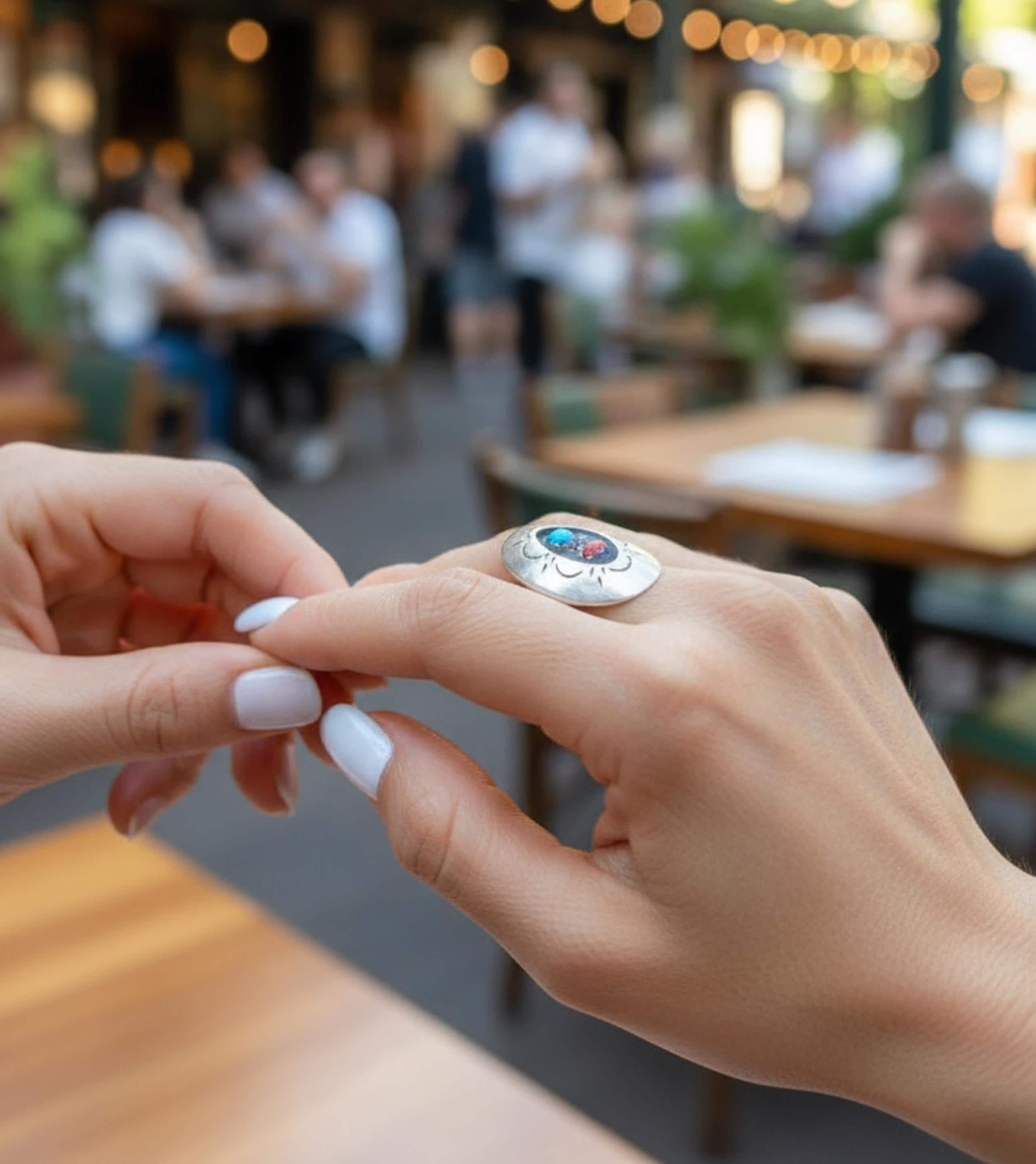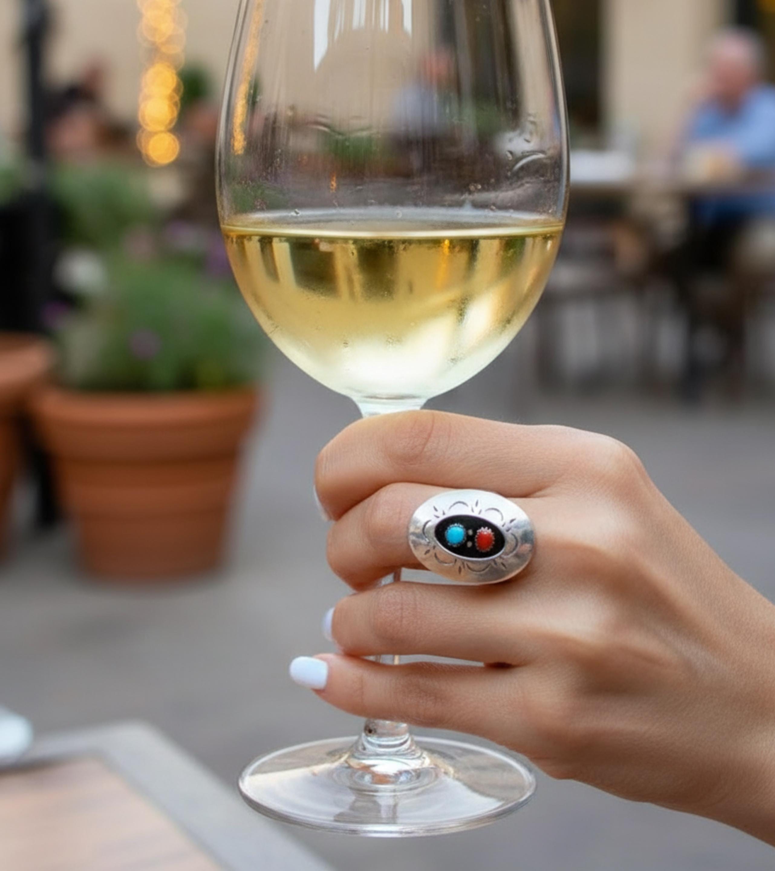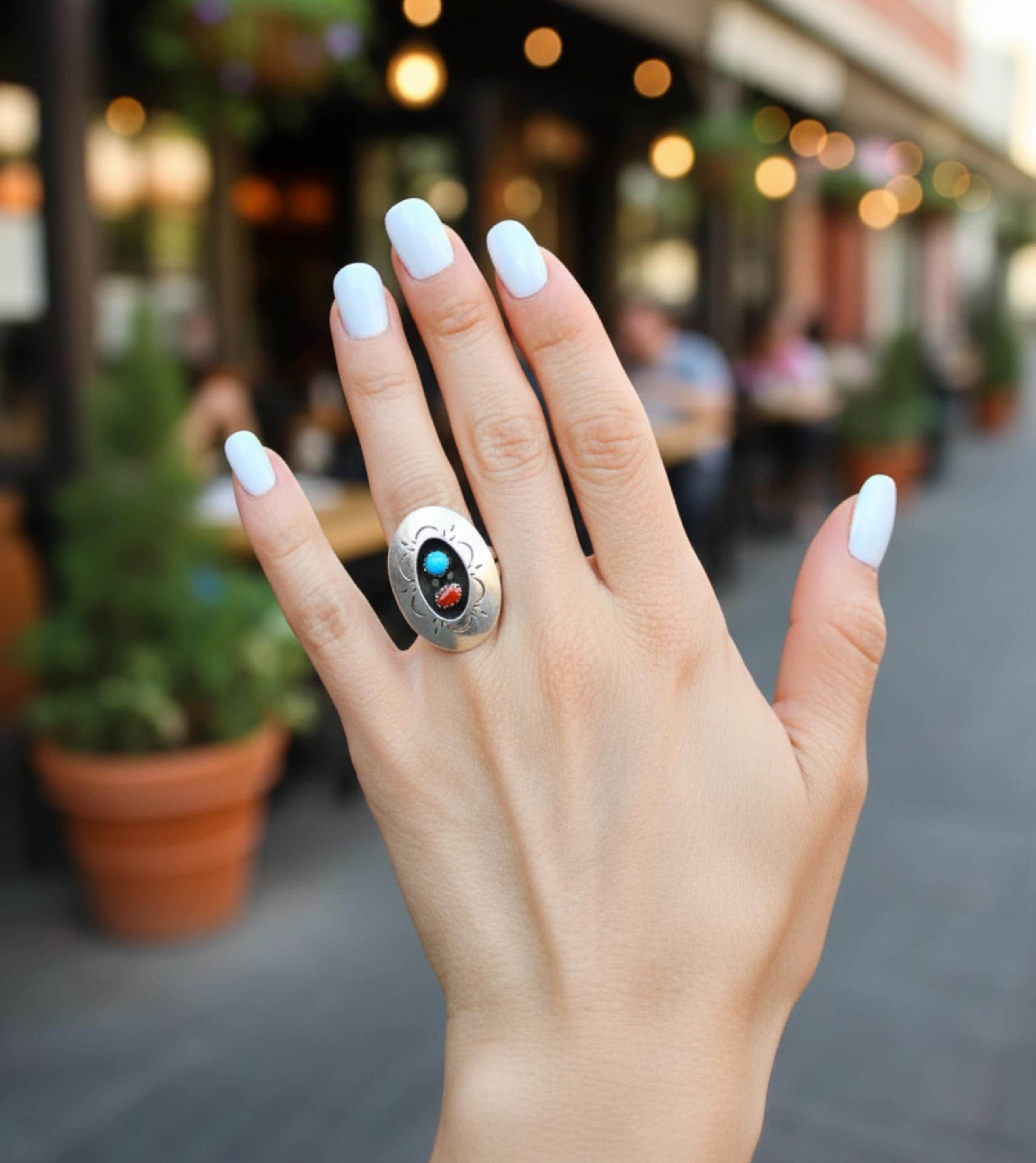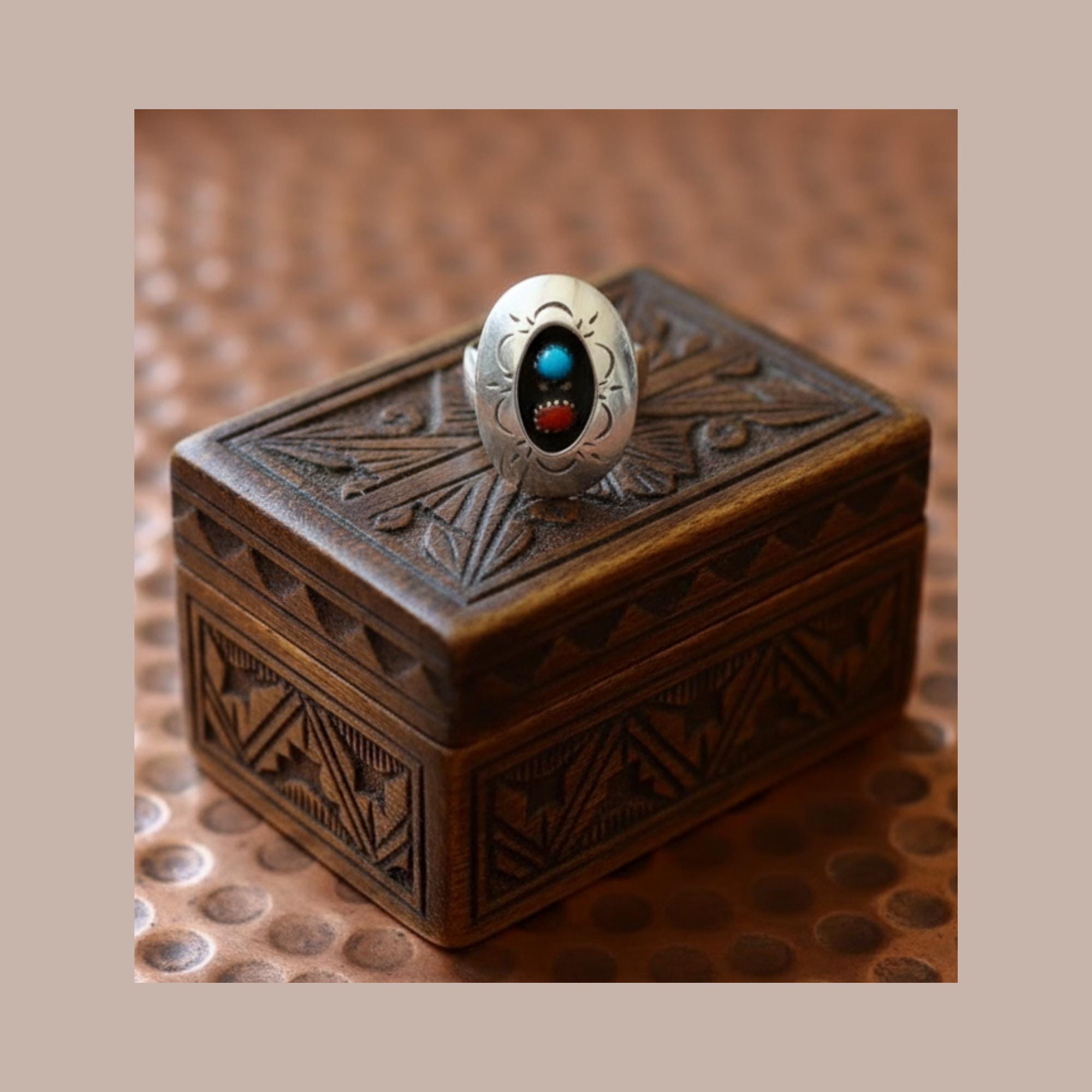 Wear something with Navajo tradition! This ring is made in a timeless style with Sterling Silver, Turquoise, and Coral into a shadow box design. The combination of the two stones is used in Native American jewelry because of the great vivid color contrast. This is perfect for art lovers who appreciate handcrafted Native American made jewelry!