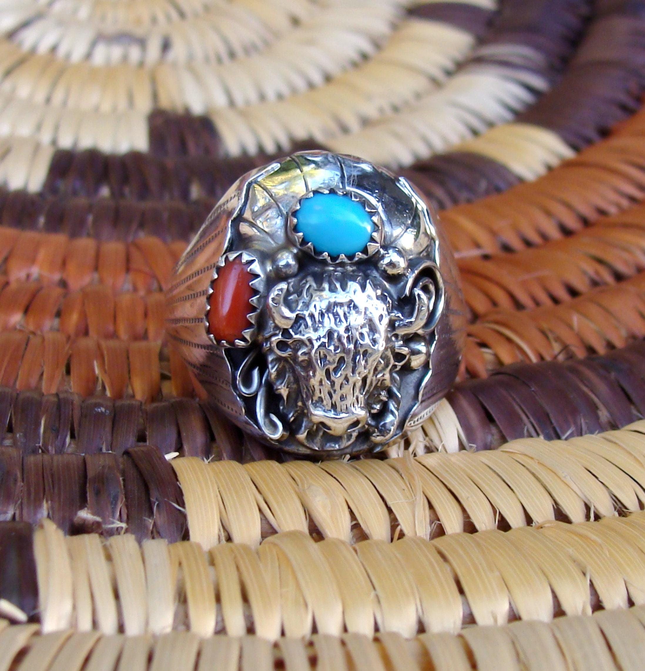 This handsome ring is expertly crafted by Artist Grace Smith. Coral has been called the 'garden of the sea'. Red is considered the most sought after color but Coral also can be found in pink, white, yellow and black. However, Mediterranean Coral is no longer being pulled from the sea due to environmental restrictions. The Turquoise is a bright shade which creates a vivid color contrast between the stones. This Navajo ring is finished off with an intricate hand-tooled Buffalo. Truly a wonderful, meaningful accessory.