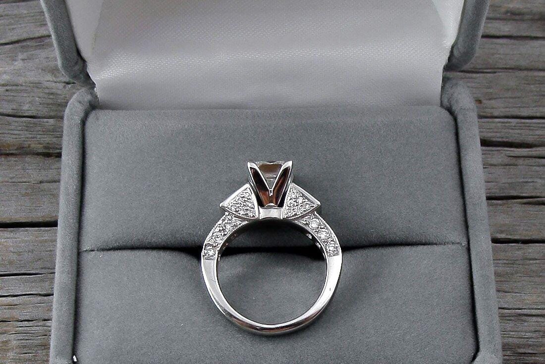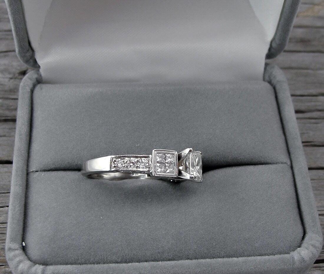 Featured here is a stunning Princess cut engagement ring. This is a BARGAIN for this quality!! Remember, when you buy diamonds, most of them are truly junk (inclusions with bad color). This princess cut stone is a high grade diamond, not the standard mall diamond -- or any similar in size online. This ring has not been worn for years. I had the ring completely cleaned and reconditioned so it is truly in new condition.