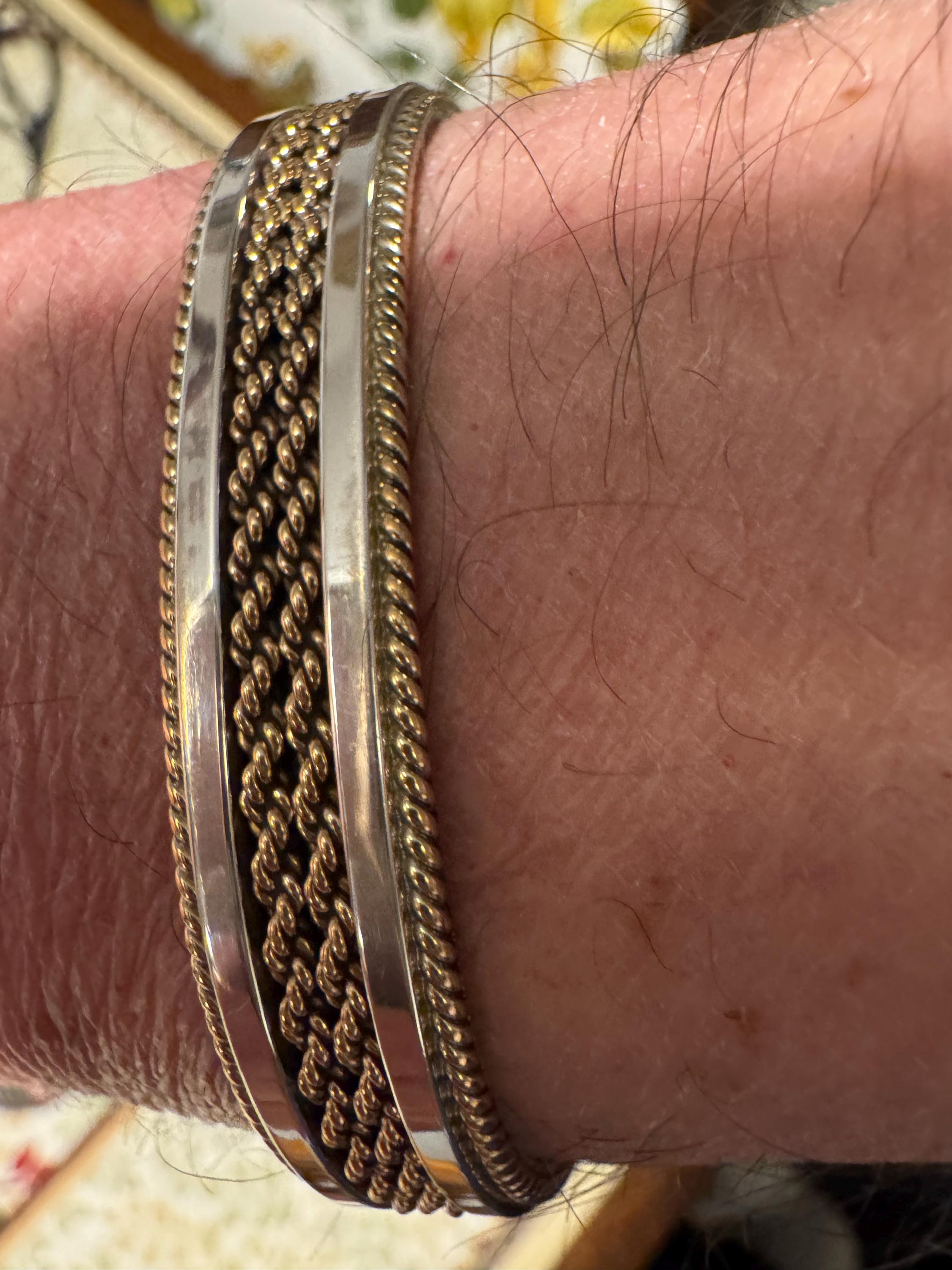 This item is handcrafted from 12KGF (12 karat gold fill) and Sterling Silver. Made by the Tahe family whom is very famous for their Navajo bracelets. This is a unique piece of jewelry that will be highly valued to the person that wears it.