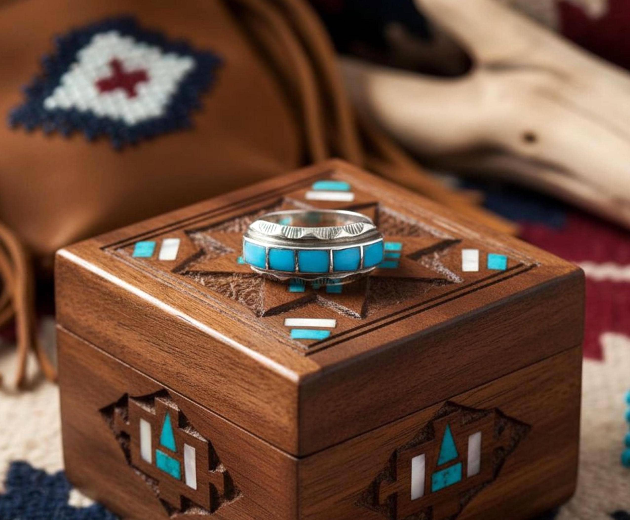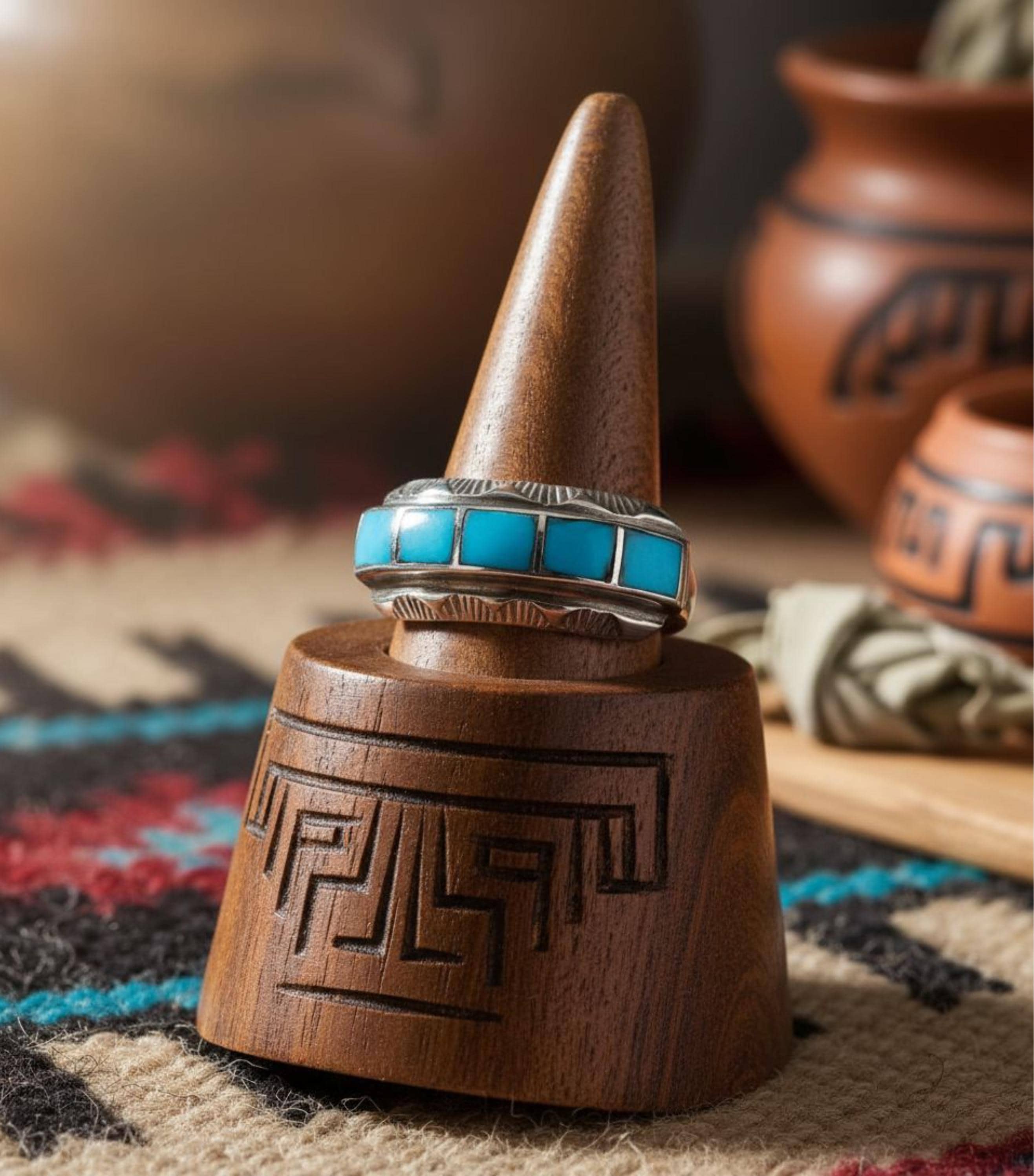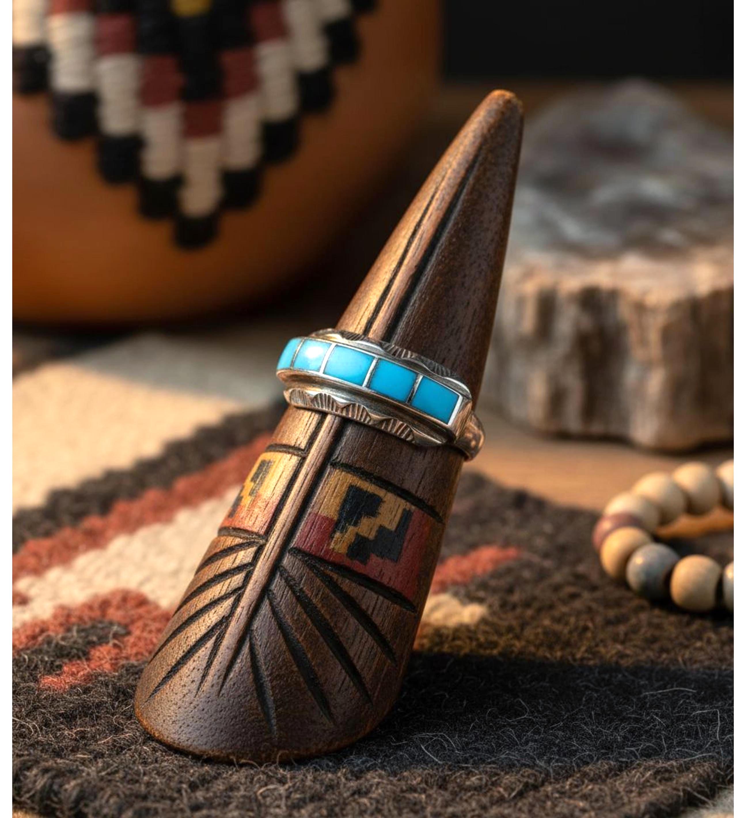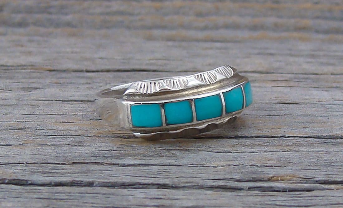 This vintage Zuni ring is handcrafted with Sterling Silver and natural Turquoise inlaid stones. The geometric, smooth, inlay design is a creative element that gives the piece its own unique flair! This ring has all the same precision and delicacy that the Zuni silversmiths are known for. This ring is not available in any other shop because they are no longer being made. The back is plain silver.
