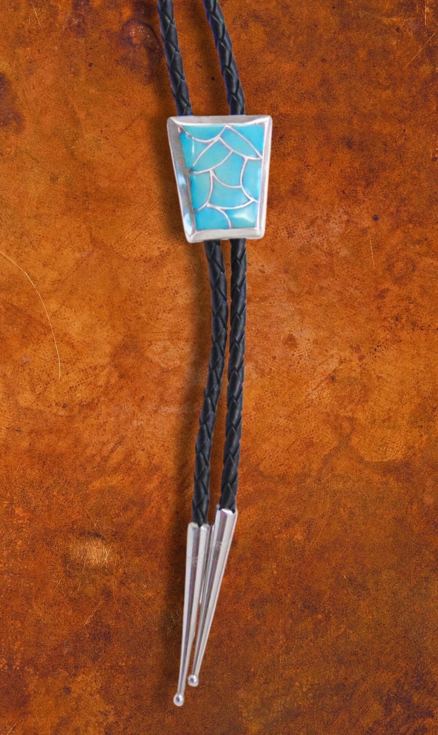 This is such a beautiful work of art, perfect for adding a touch of the Southwest to your wardrobe. This Zuni Bolo Tie is made with Sterling Silver, Turquoise, and Leather straps. The Turquoise stone is a bright blue color, which is set into an inlay design. The size is perfect for a man or woman -- the perfect signature gift for you or that special someone!