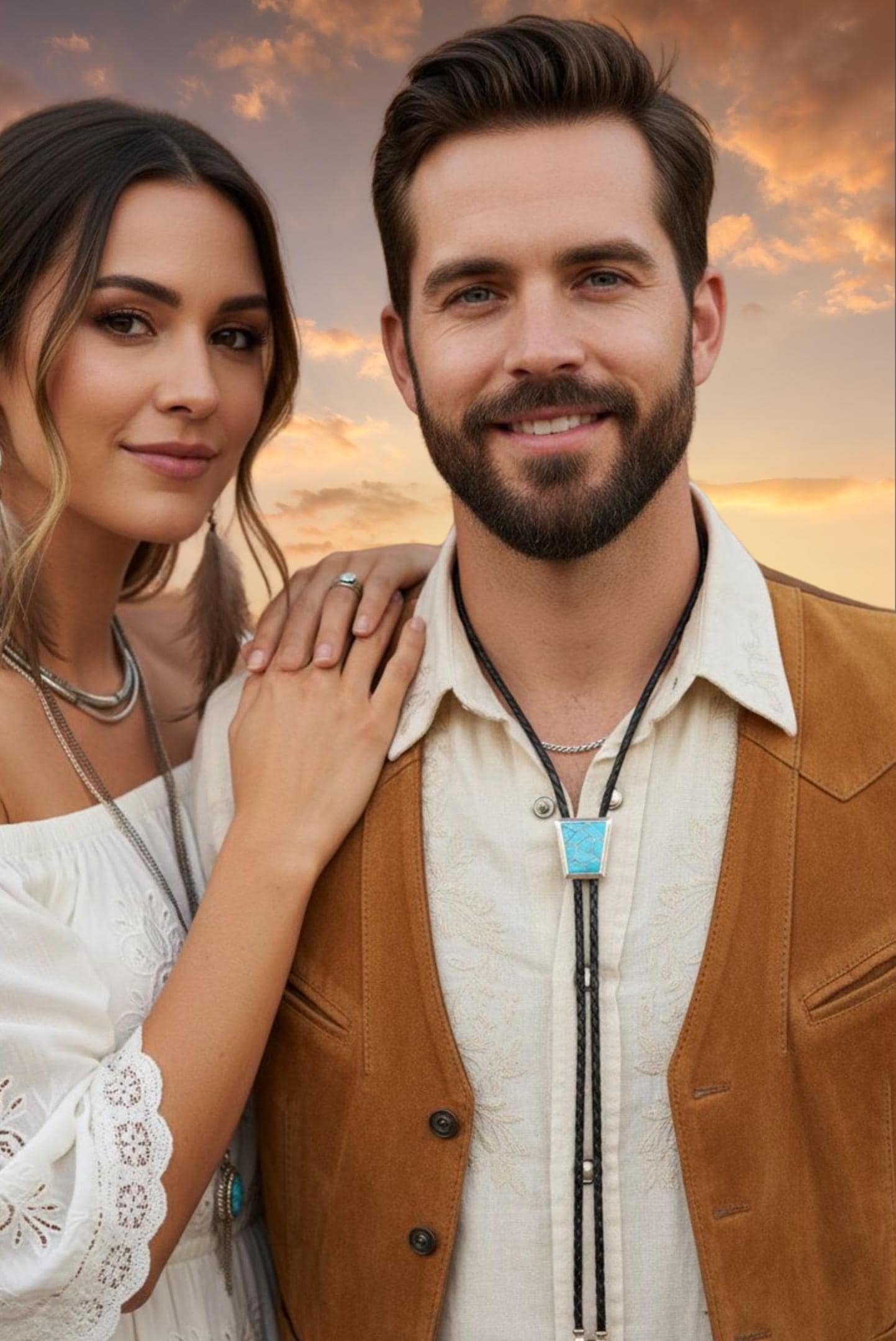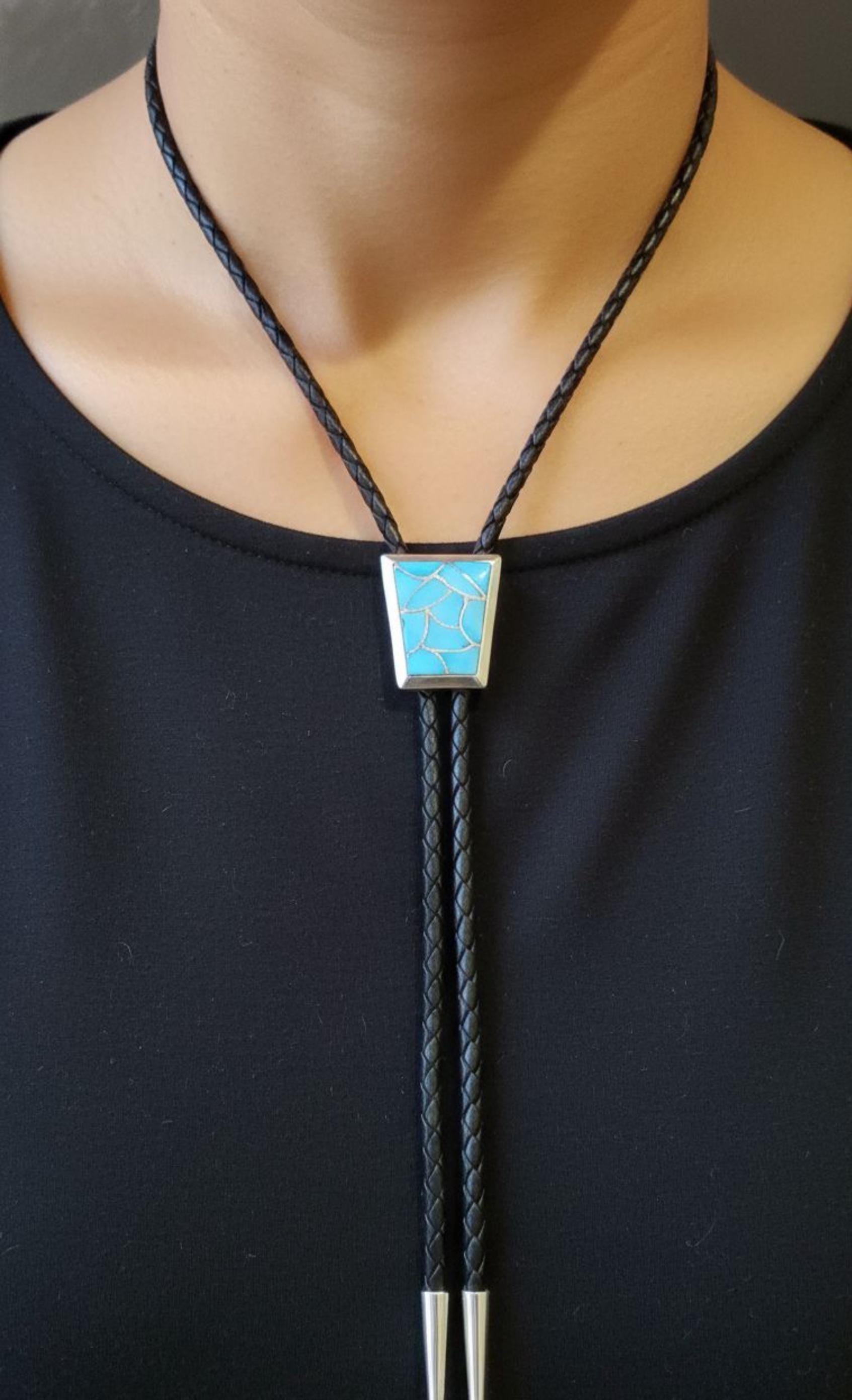 This is such a beautiful work of art, perfect for adding a touch of the Southwest to your wardrobe. This Zuni Bolo Tie is made with Sterling Silver, Turquoise, and Leather straps. The Turquoise stone is a bright blue color, which is set into an inlay design. The size is perfect for a man or woman -- the perfect signature gift for you or that special someone!