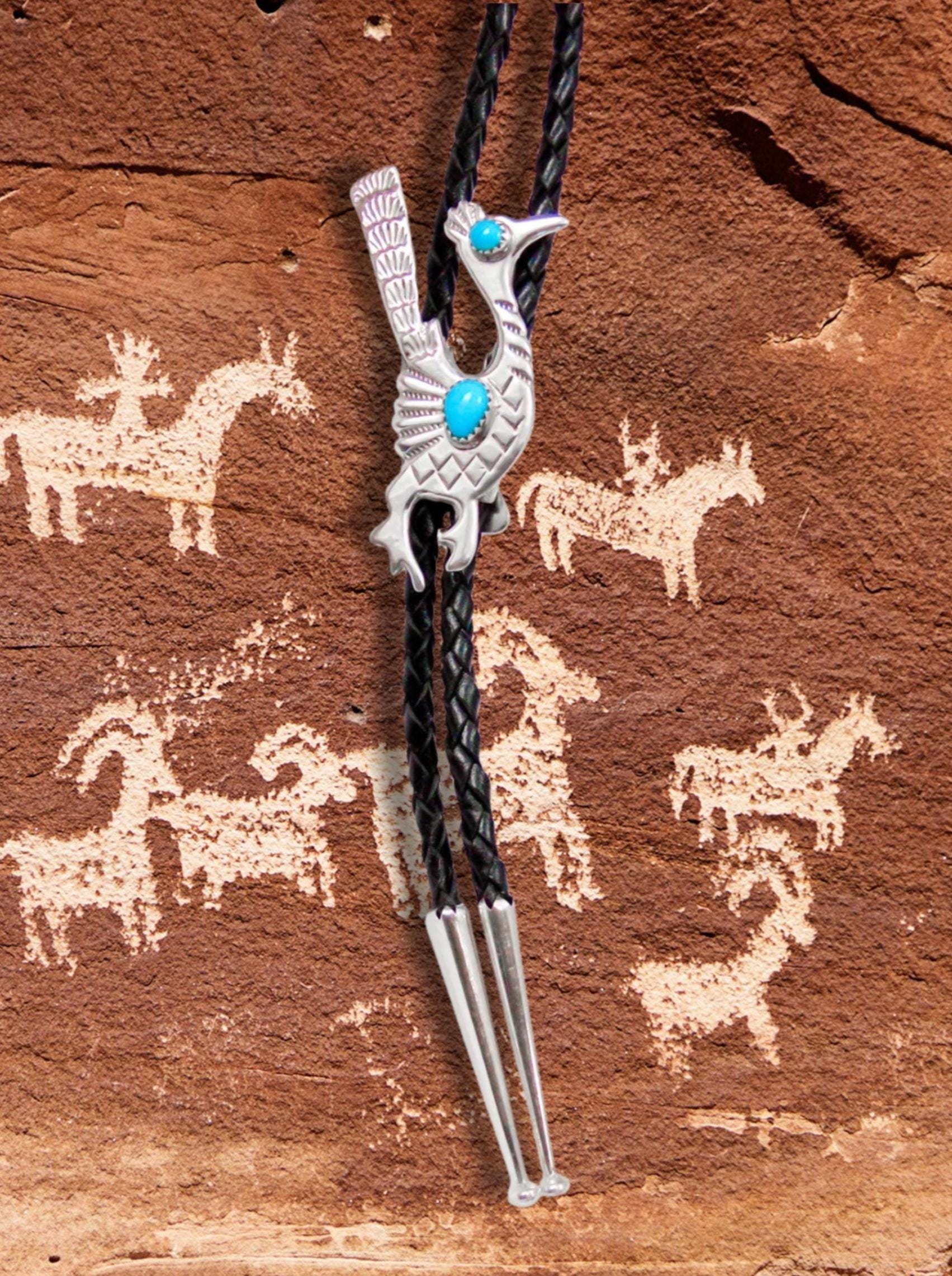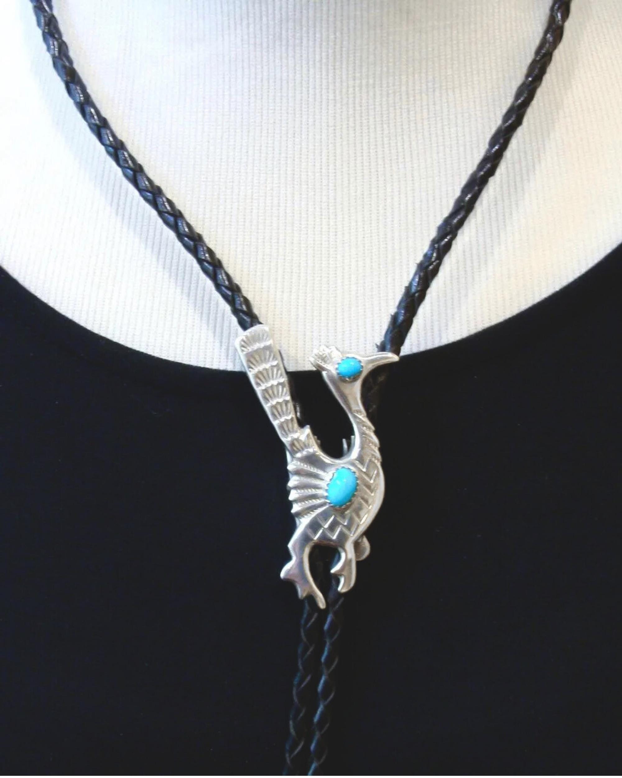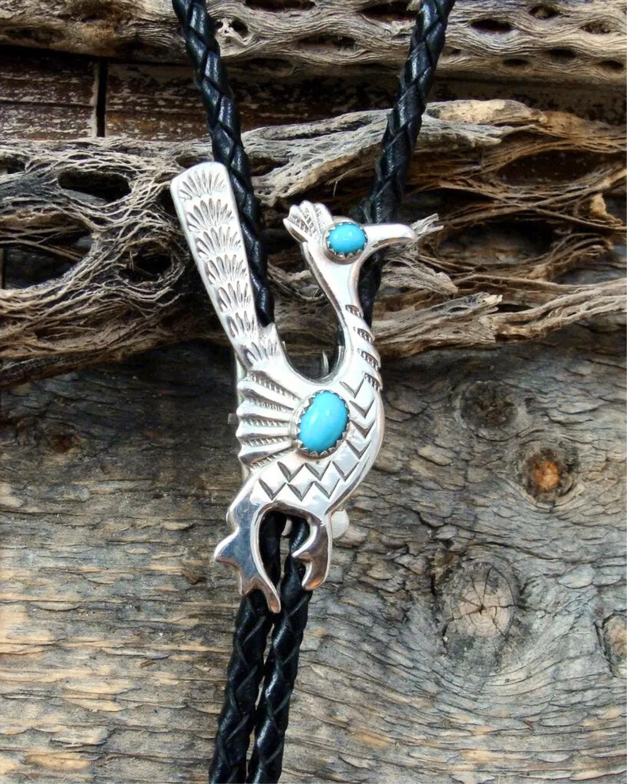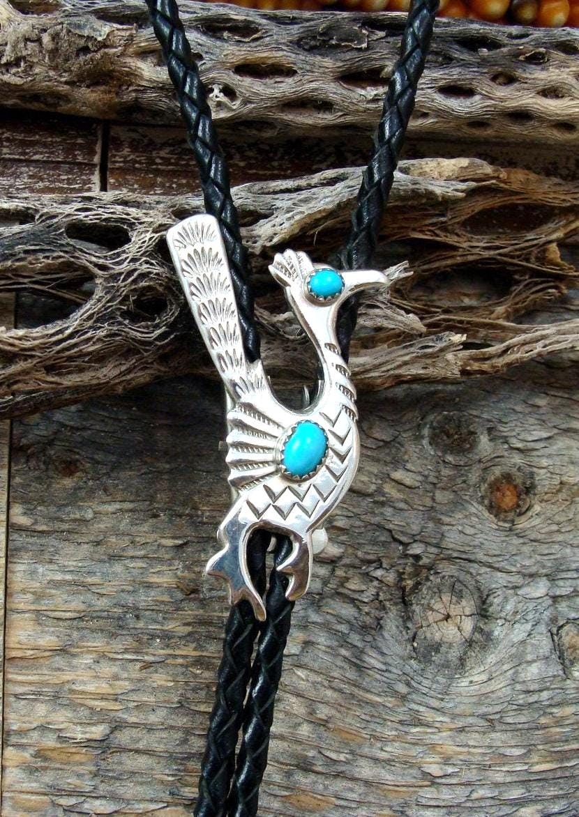 This is such a wonderful accessory that will add lots of personality to your wardrobe. This Bolo Tie is made with Sterling Silver, Turquoise and Leather straps into a Roadrunner. The Roadrunner is thought to teach the ability of mental sharpness, quick thinking, and fast response. This is the perfect gift for that special someone!