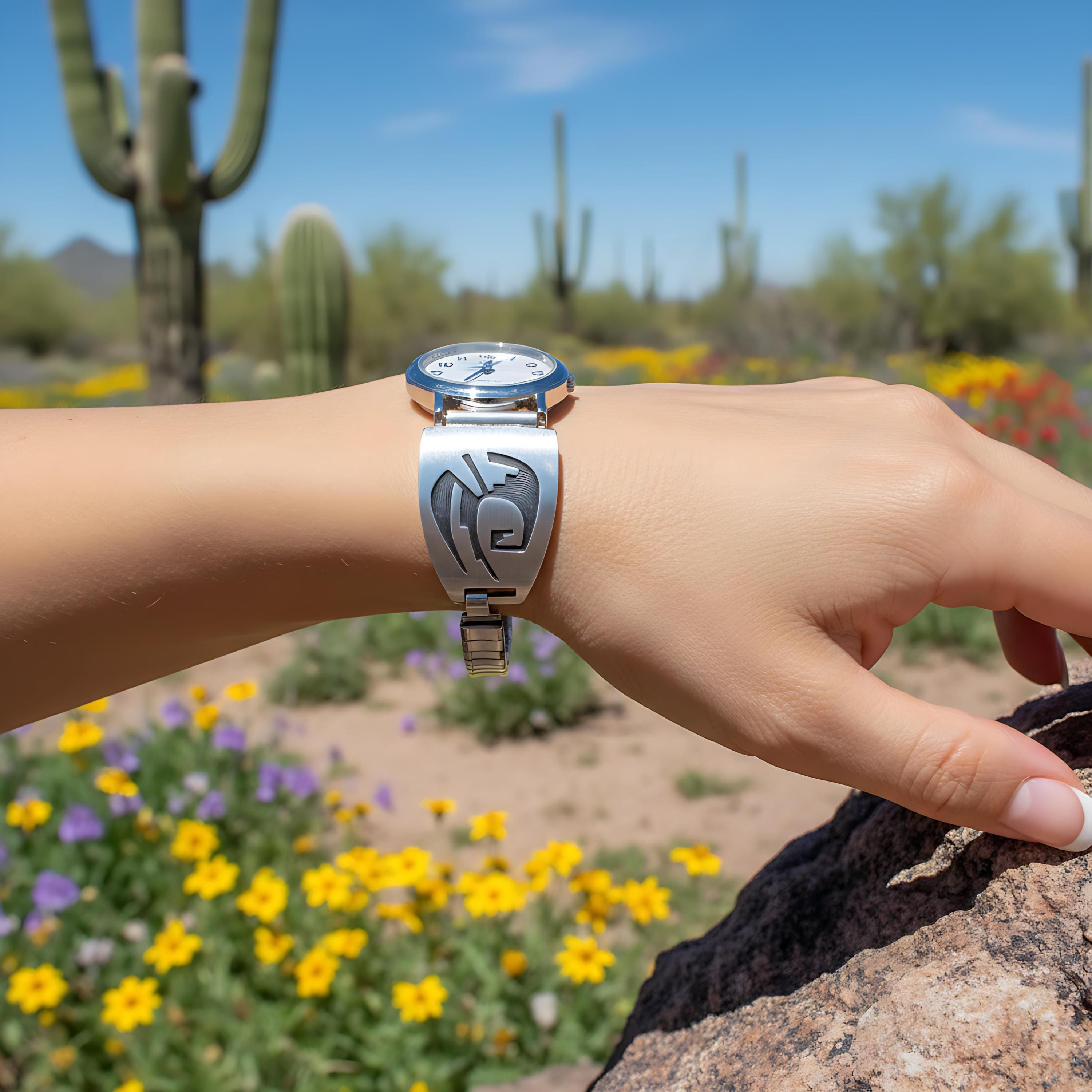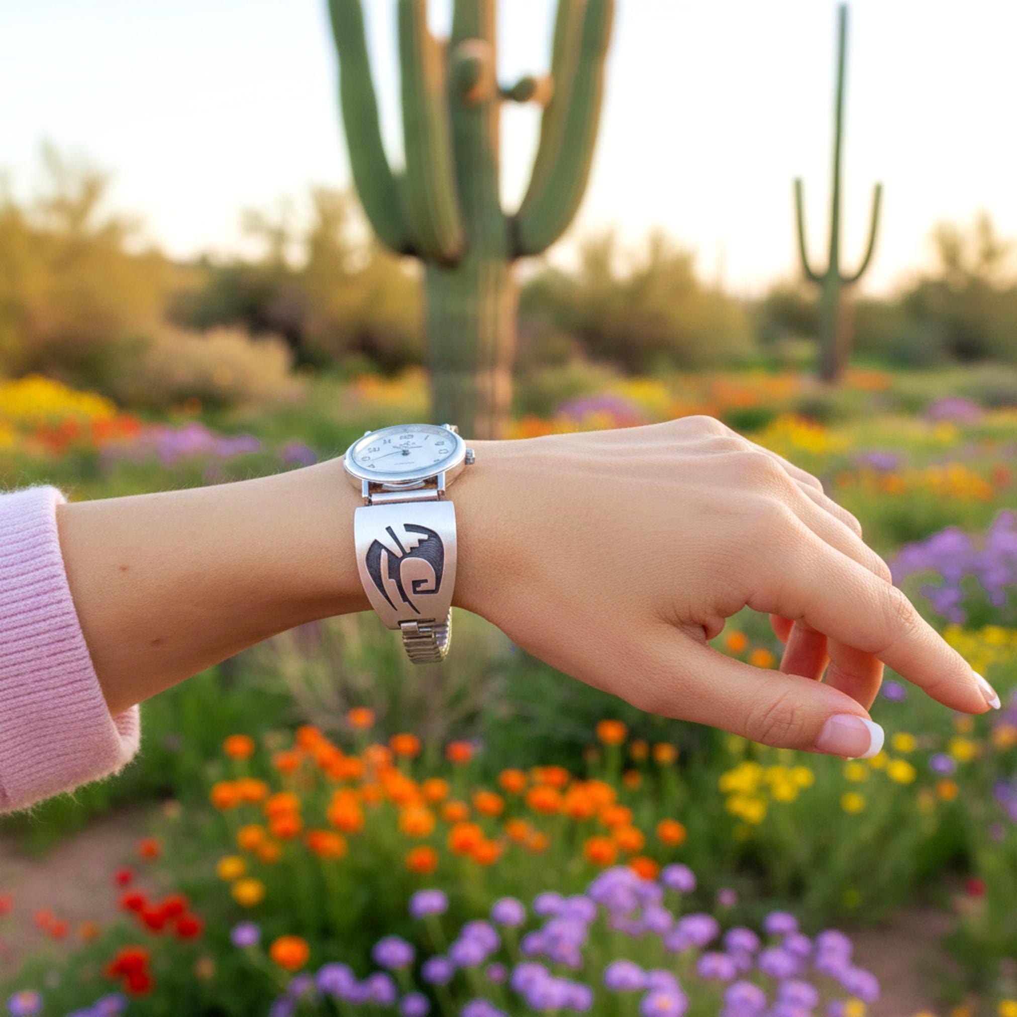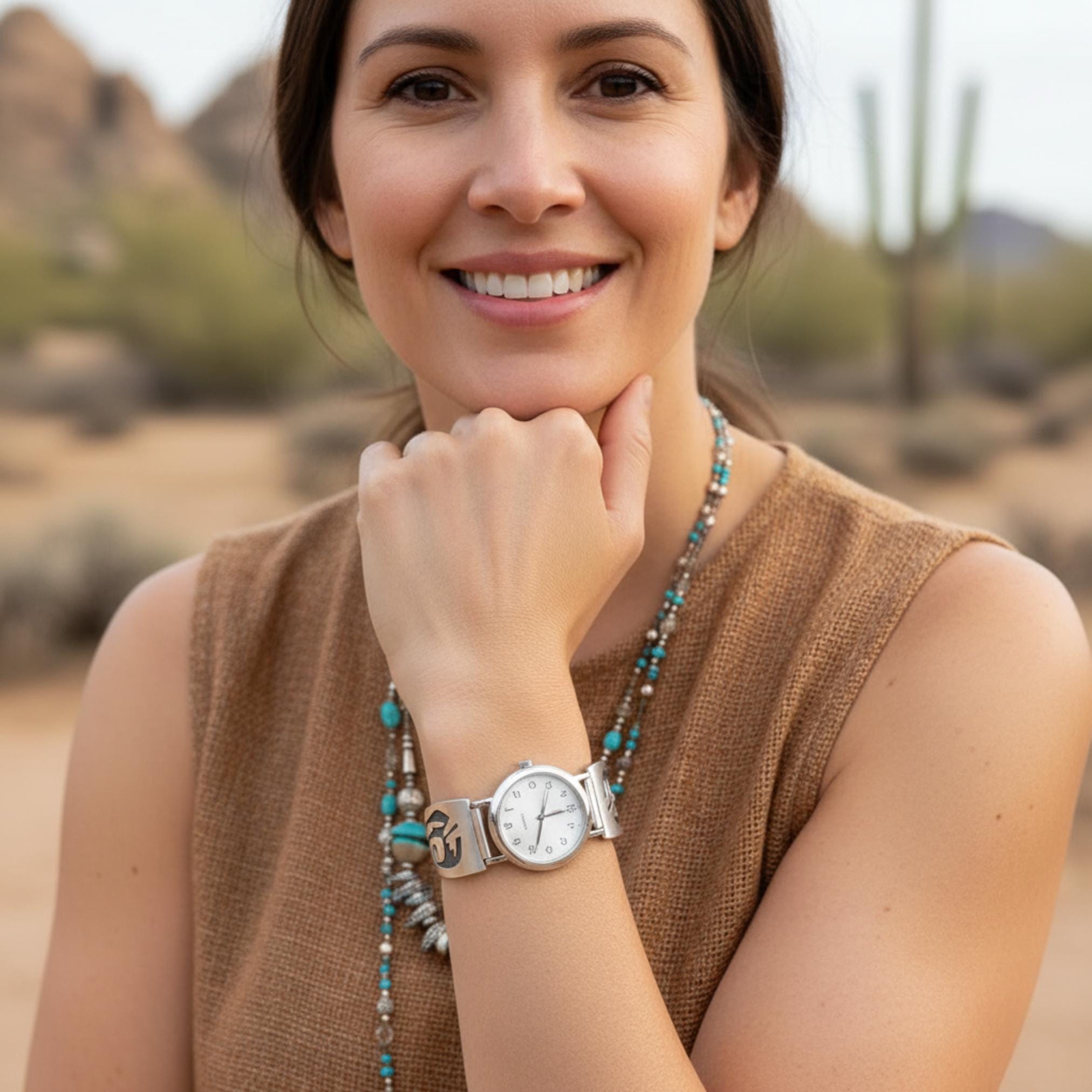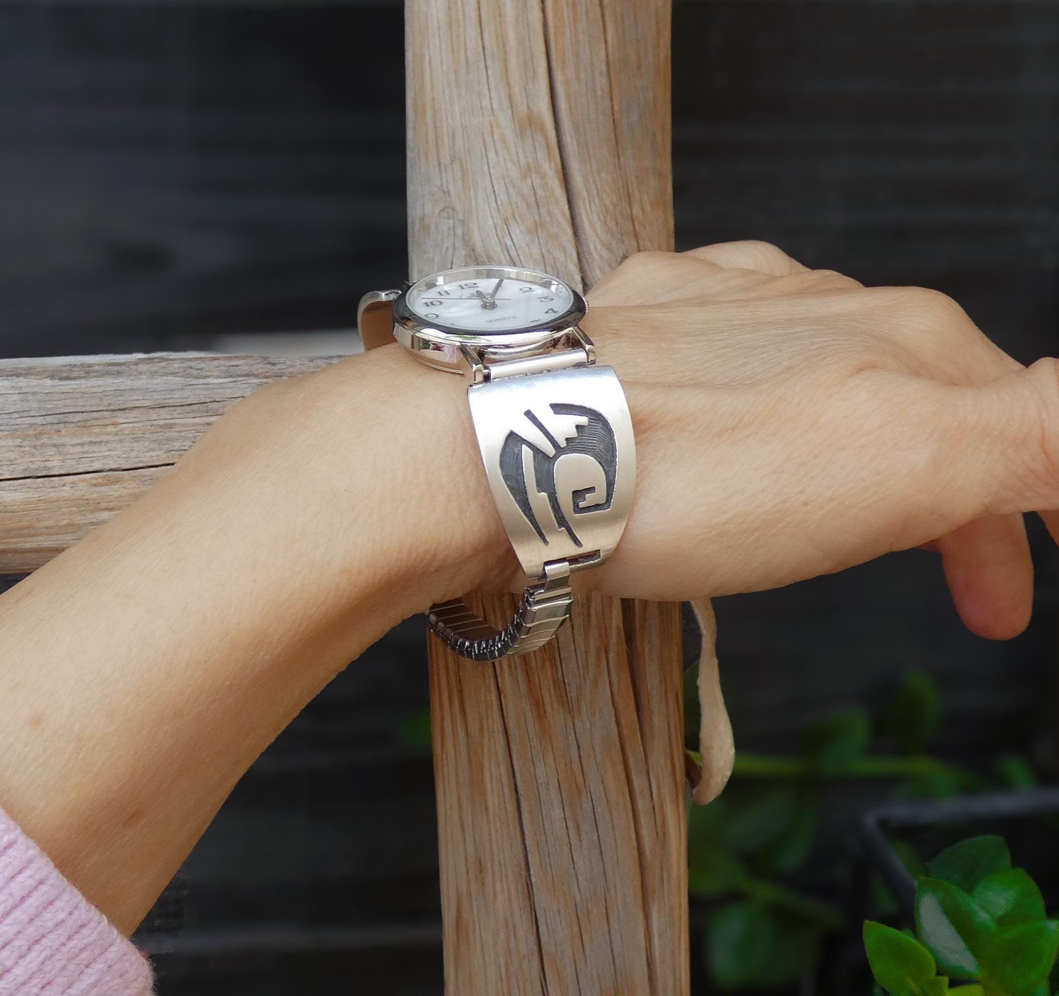 This women's watch band was made by a Native American Hopi silversmith in traditional overlay that features a stylized Eagle in flight; it still has a soft feminine appeal. These watch tips were made in the 1990s in Hopi Land (Northern Arizona). A wearable work of art gift for the amazing woman in your life.