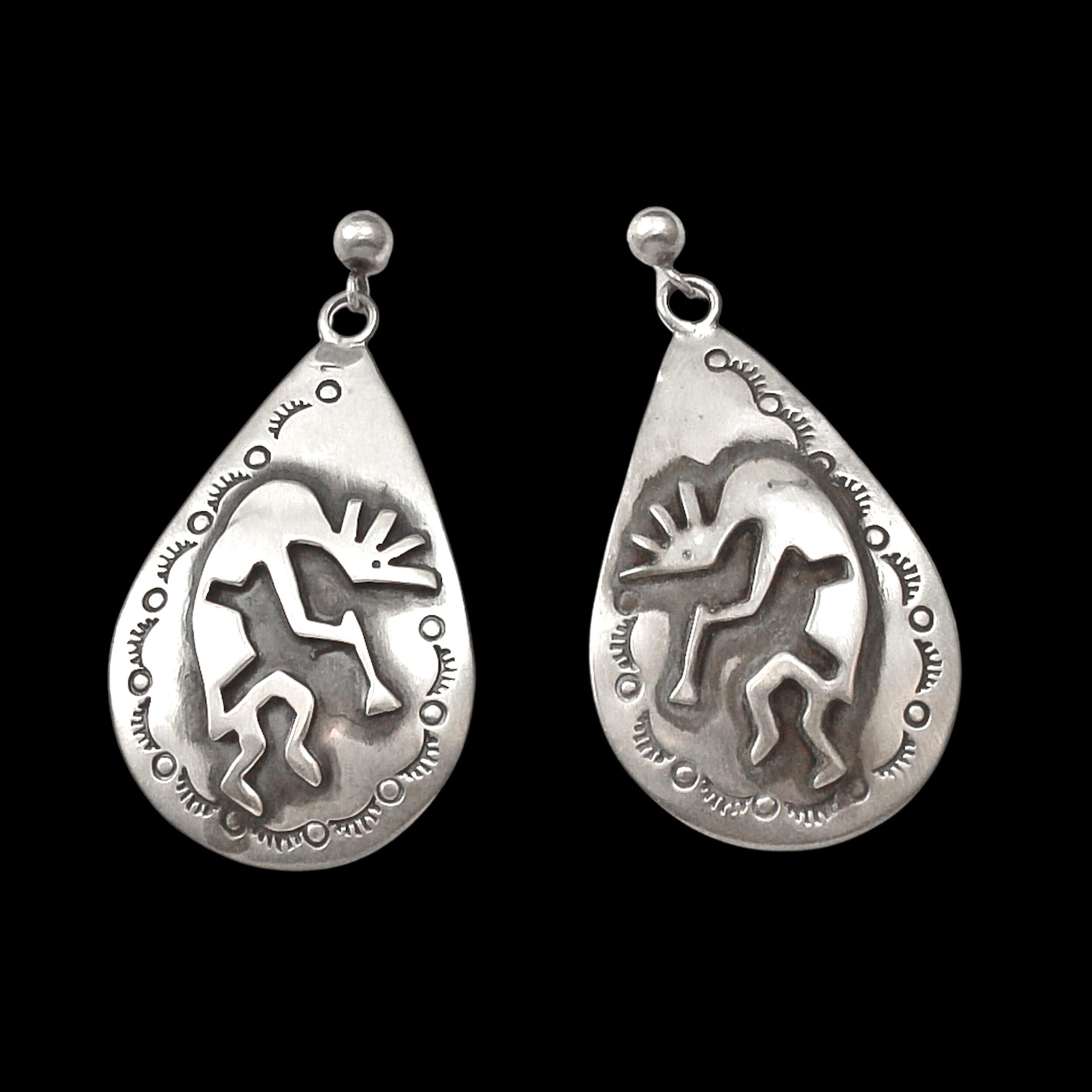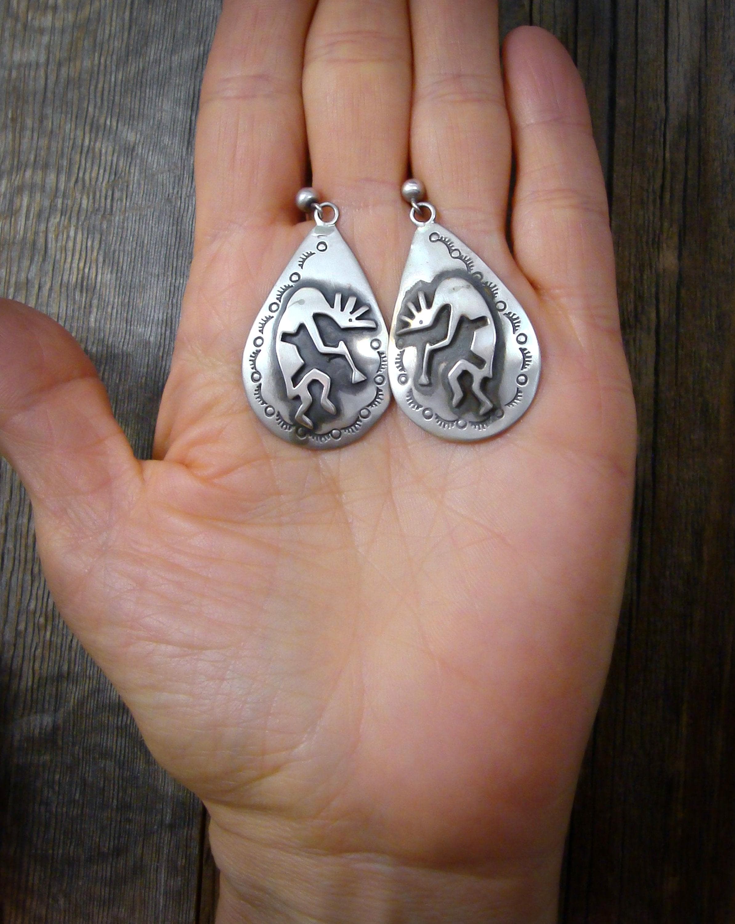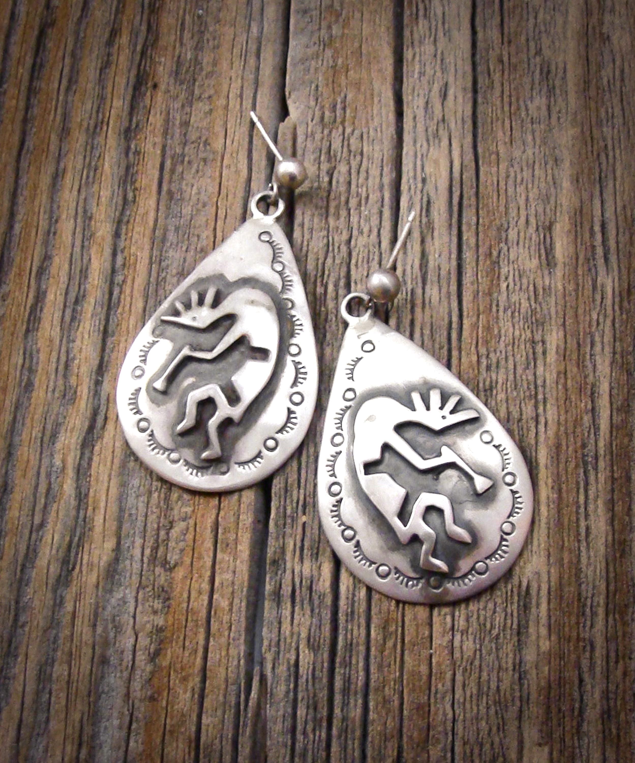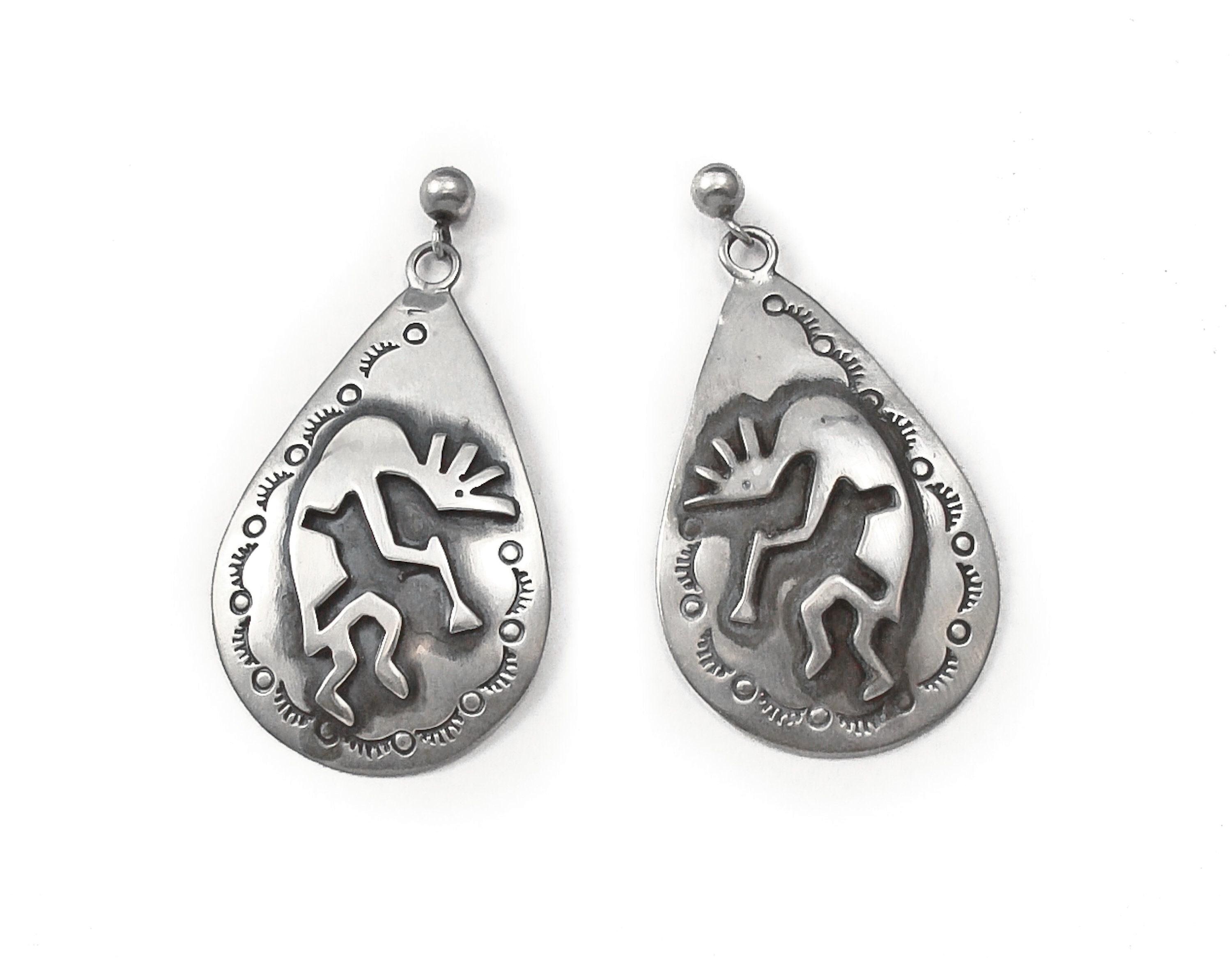 These vintage Navajo dangle earrings are handmade with Sterling Silver. The etched silver design of the Kokopelli is a part of the Native American handmade tradition that chases away Winter and brings forth Spring. These are perfect for dressing up any outfit!