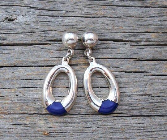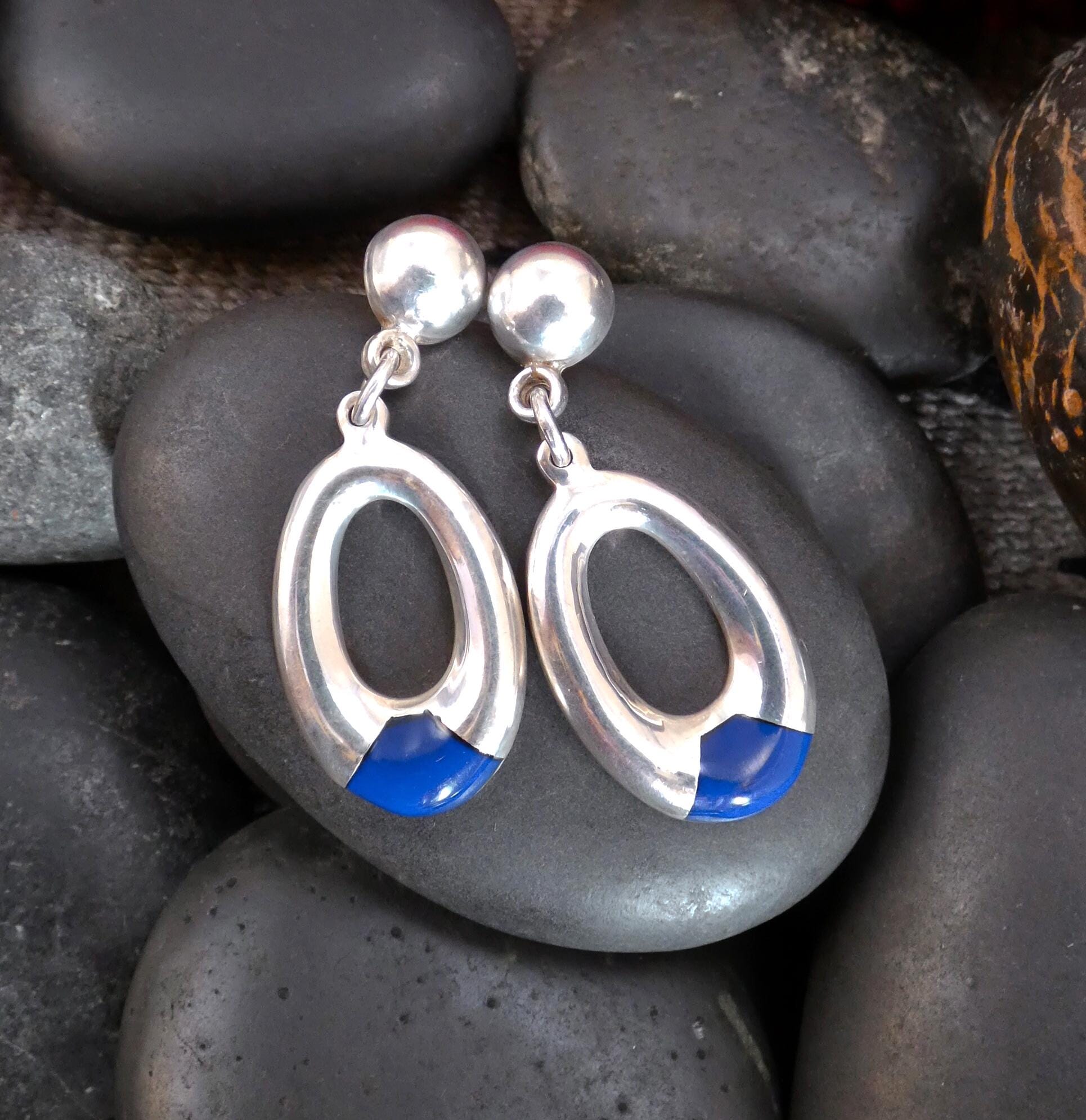 These elegant earrings from the Taxco region of Mexico, which is widely known for the silver found in the area, as well as the artistic craft of silversmithing. The Blue Lapis and Sterling Silver combination is eye catching. They offer handcrafted elegance! These earrings are handcrafted with Lapis that is prized for its intense blue natural color. These are perfect for any outfit.