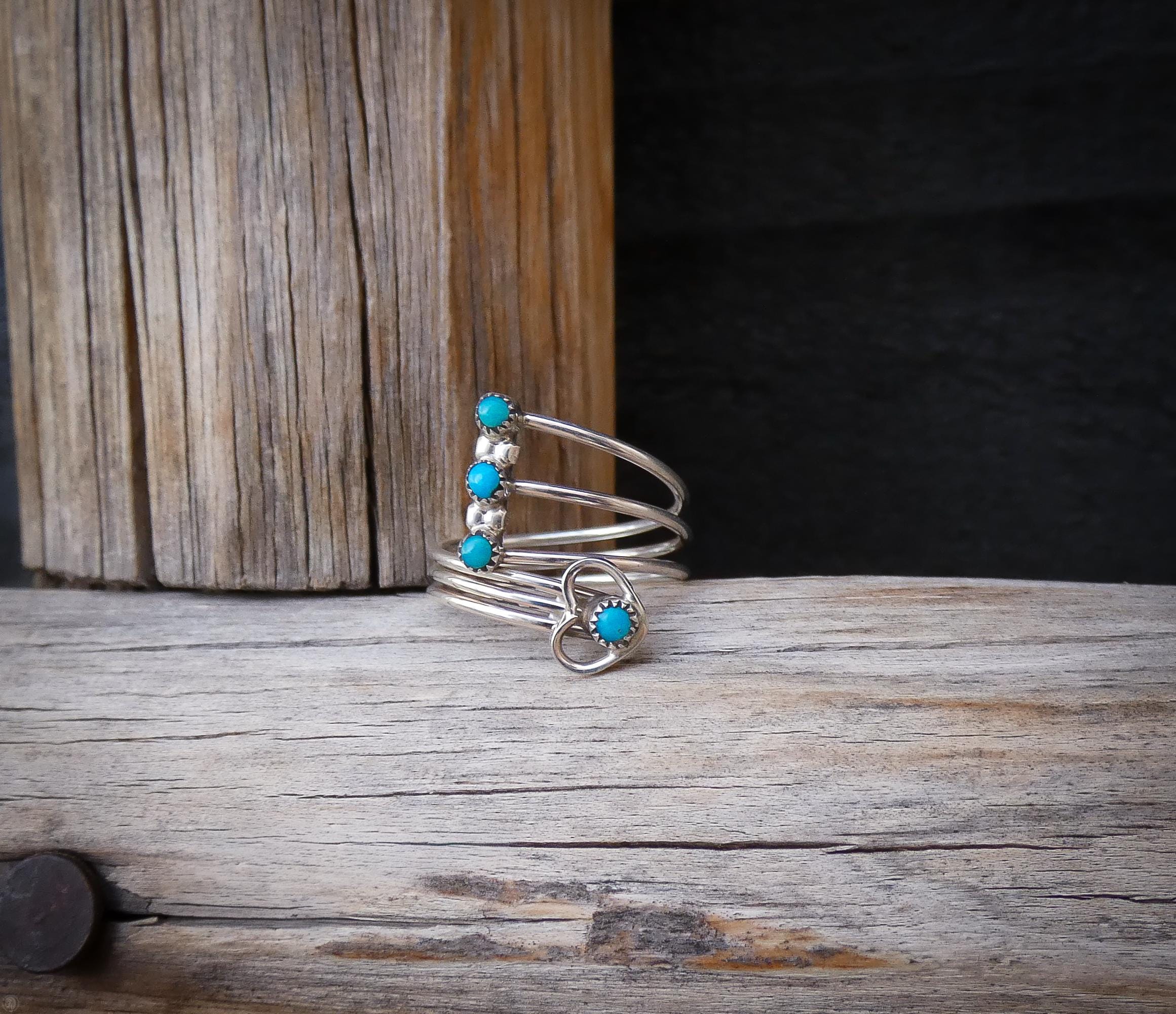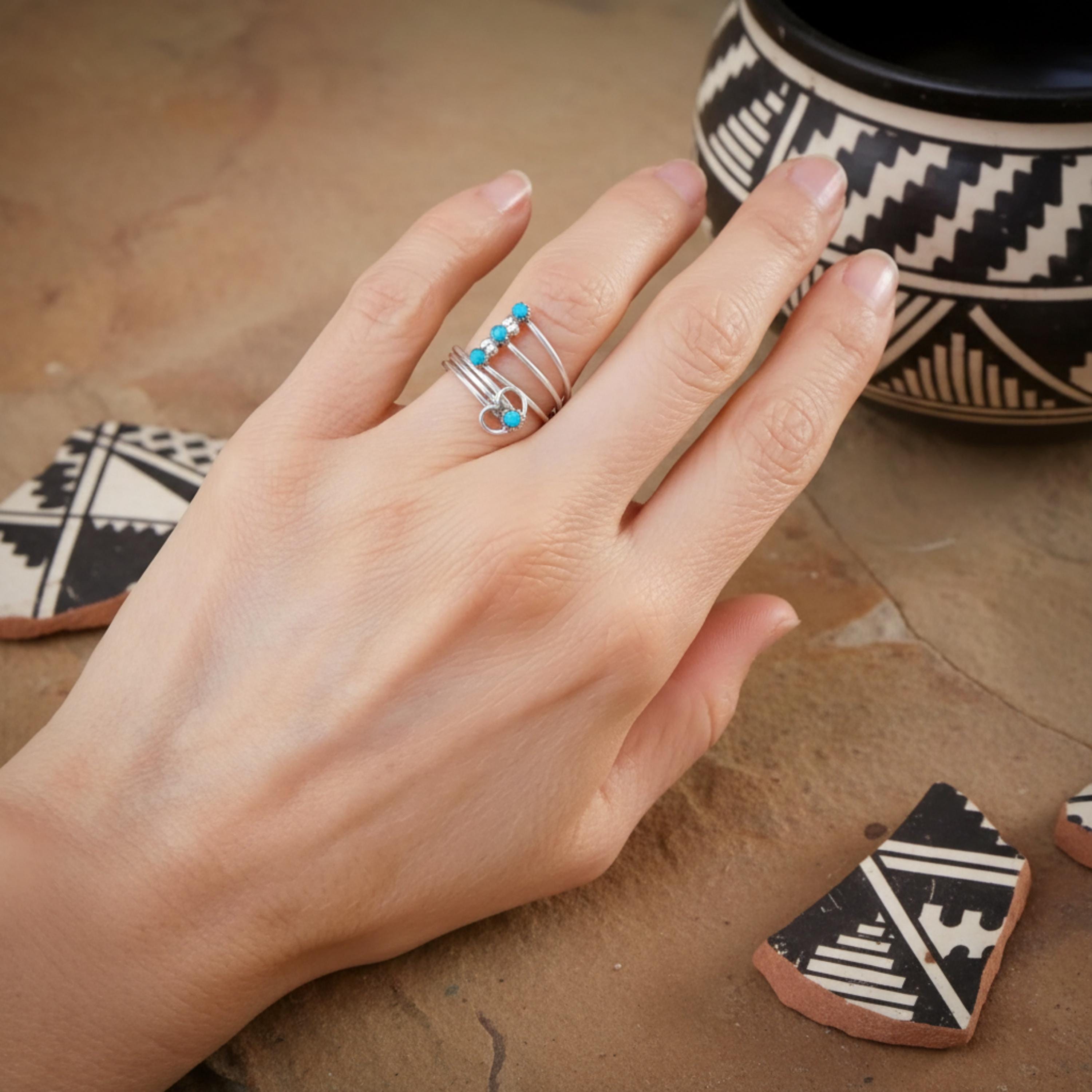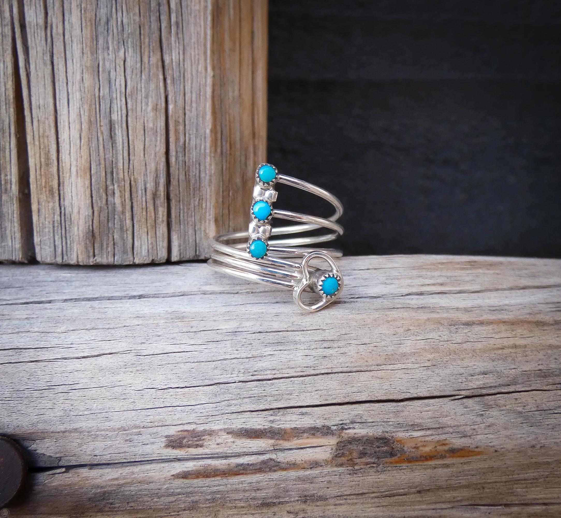 This delicate Zuni ring is made for a woman or girl with Sterling Silver and Turquoise. The styling of this ring is perfect for the adjustable comfortable design. This is perfect for art lovers who appreciate handcrafted Native American made jewelry!