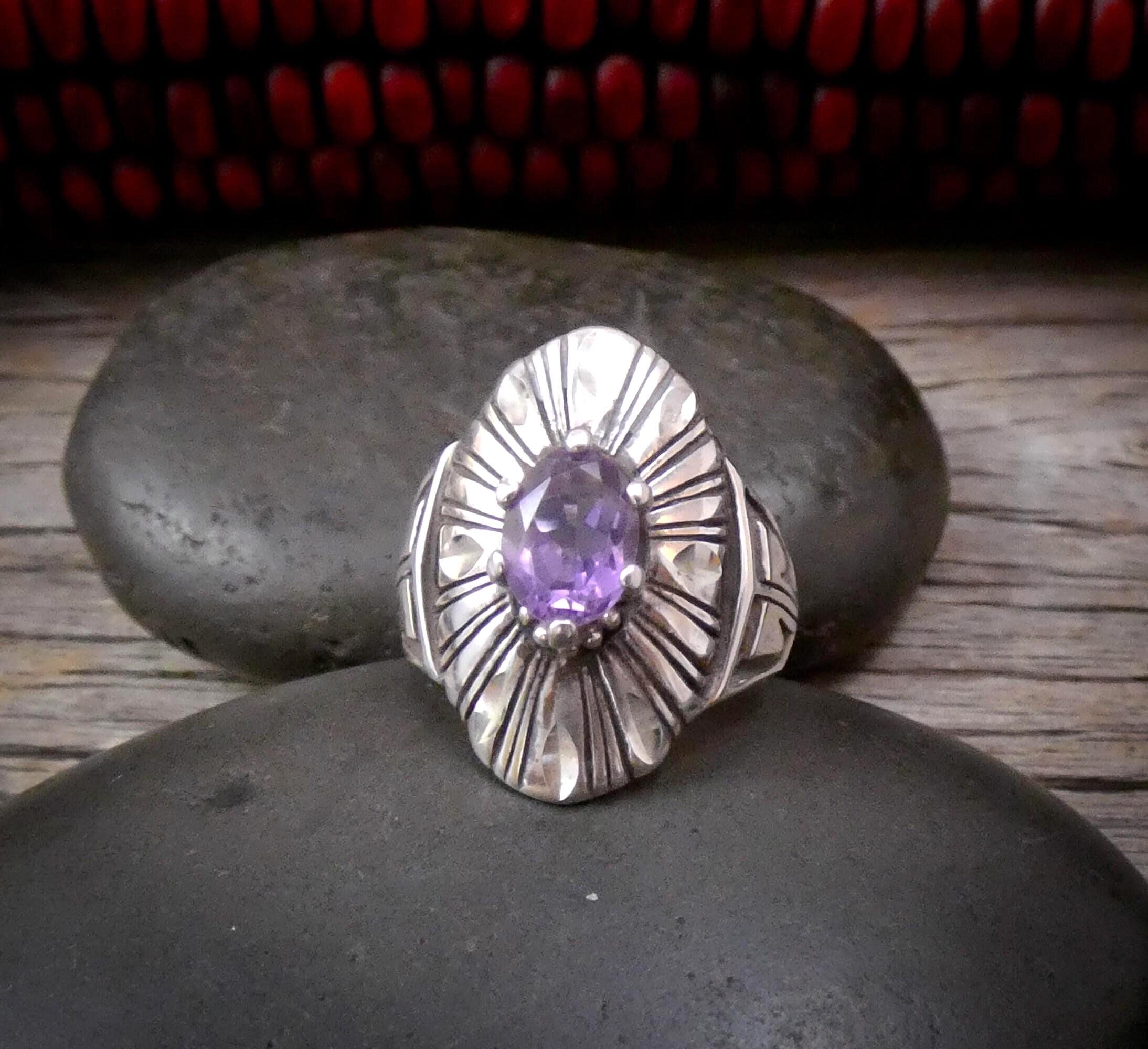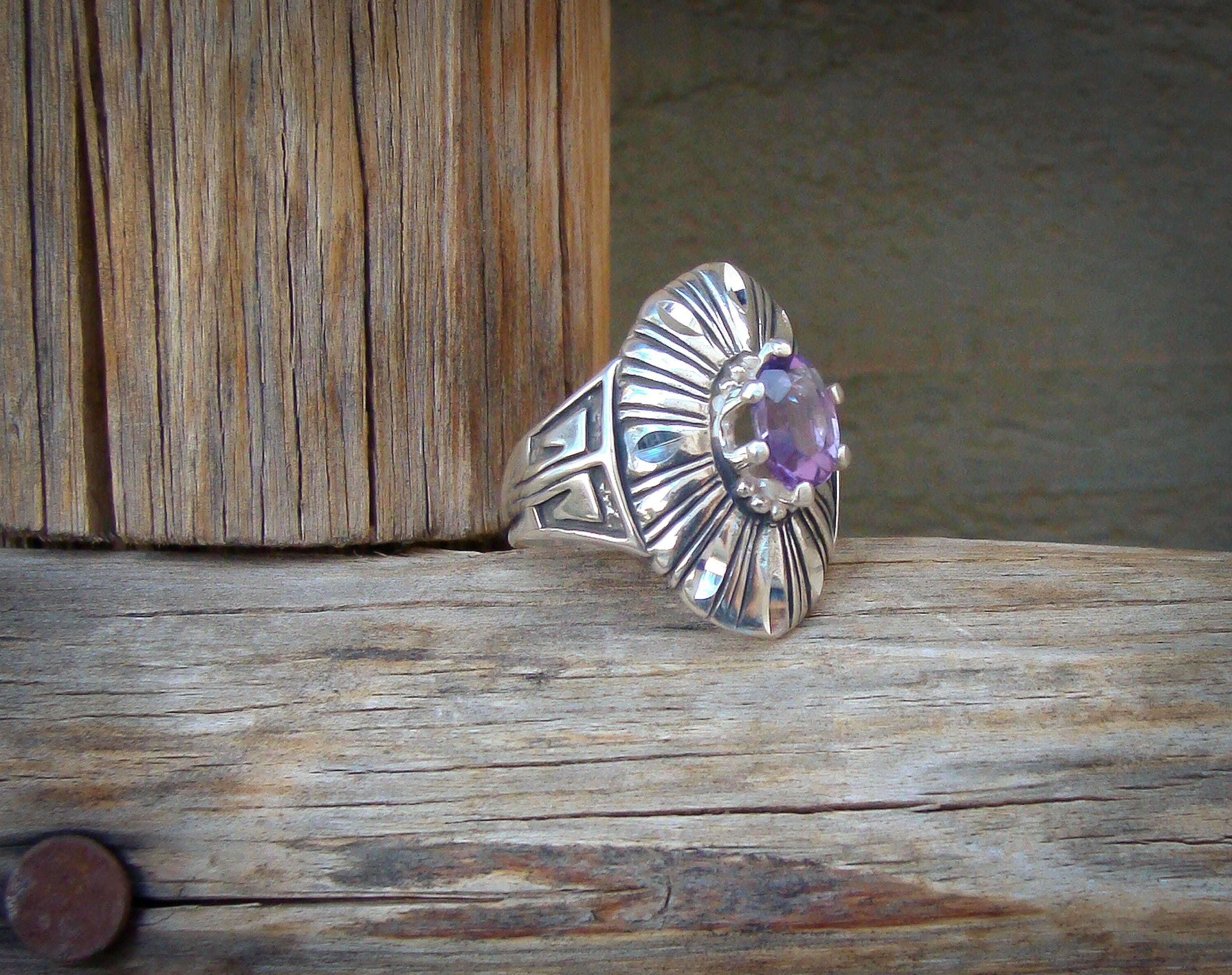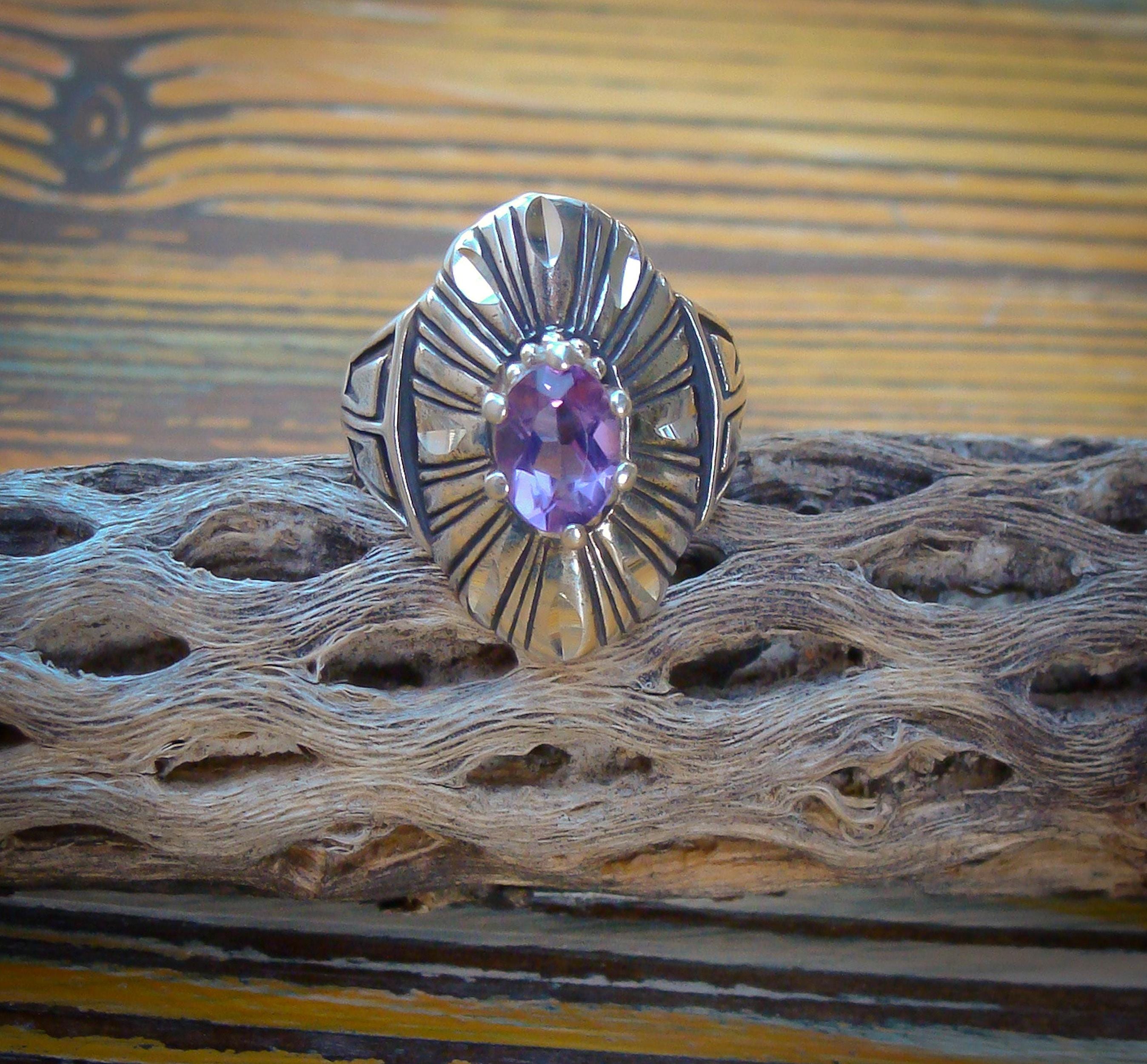 This gorgeous women's ring is handcrafted with Sterling Silver and set with an oval cut Amethyst stone. It is a very beautiful, contemporary Navajo design. The clean lines and the purple solitaire is a dramatic touch. This is a beautiful rendition of a high end look for a fraction of the price!
