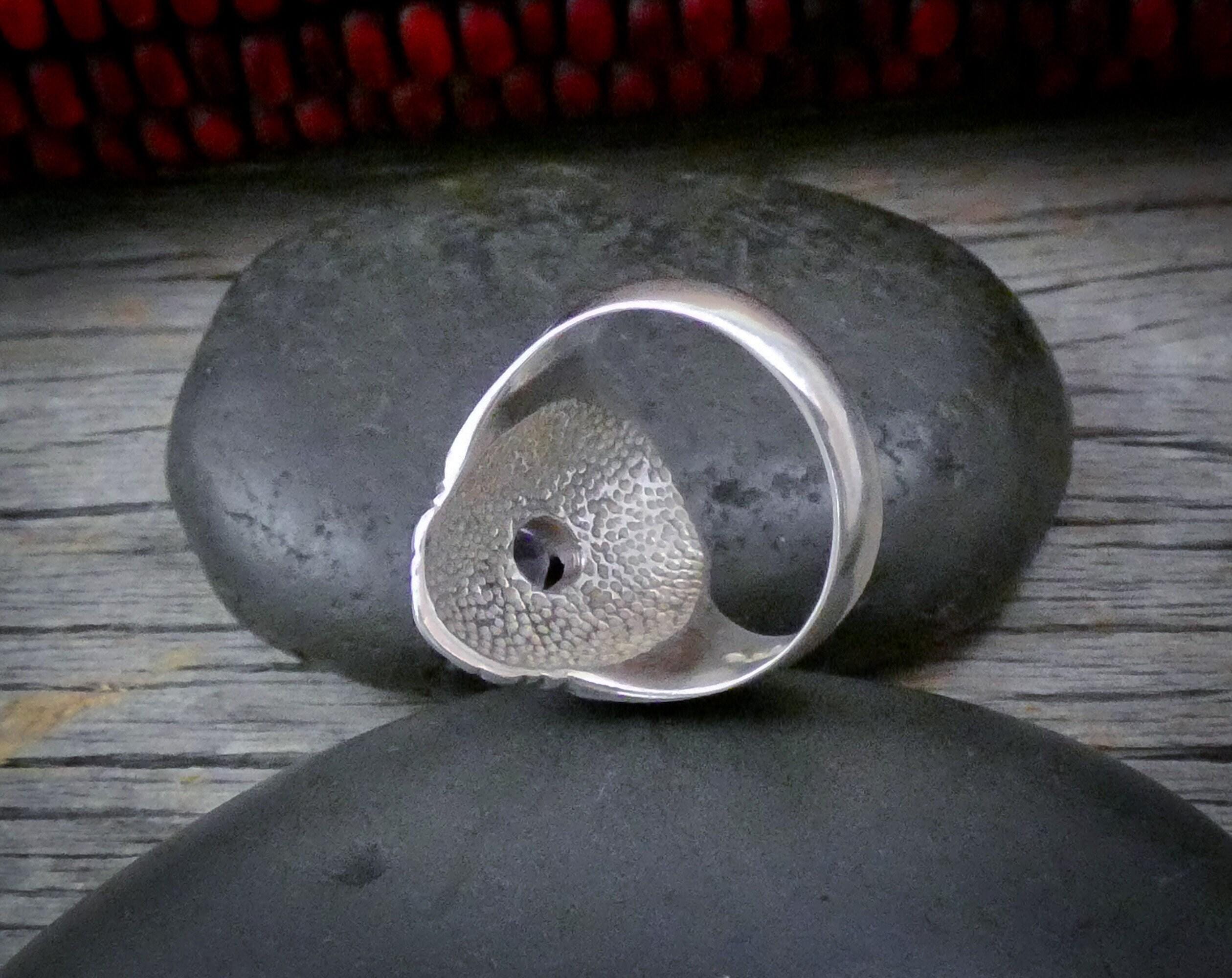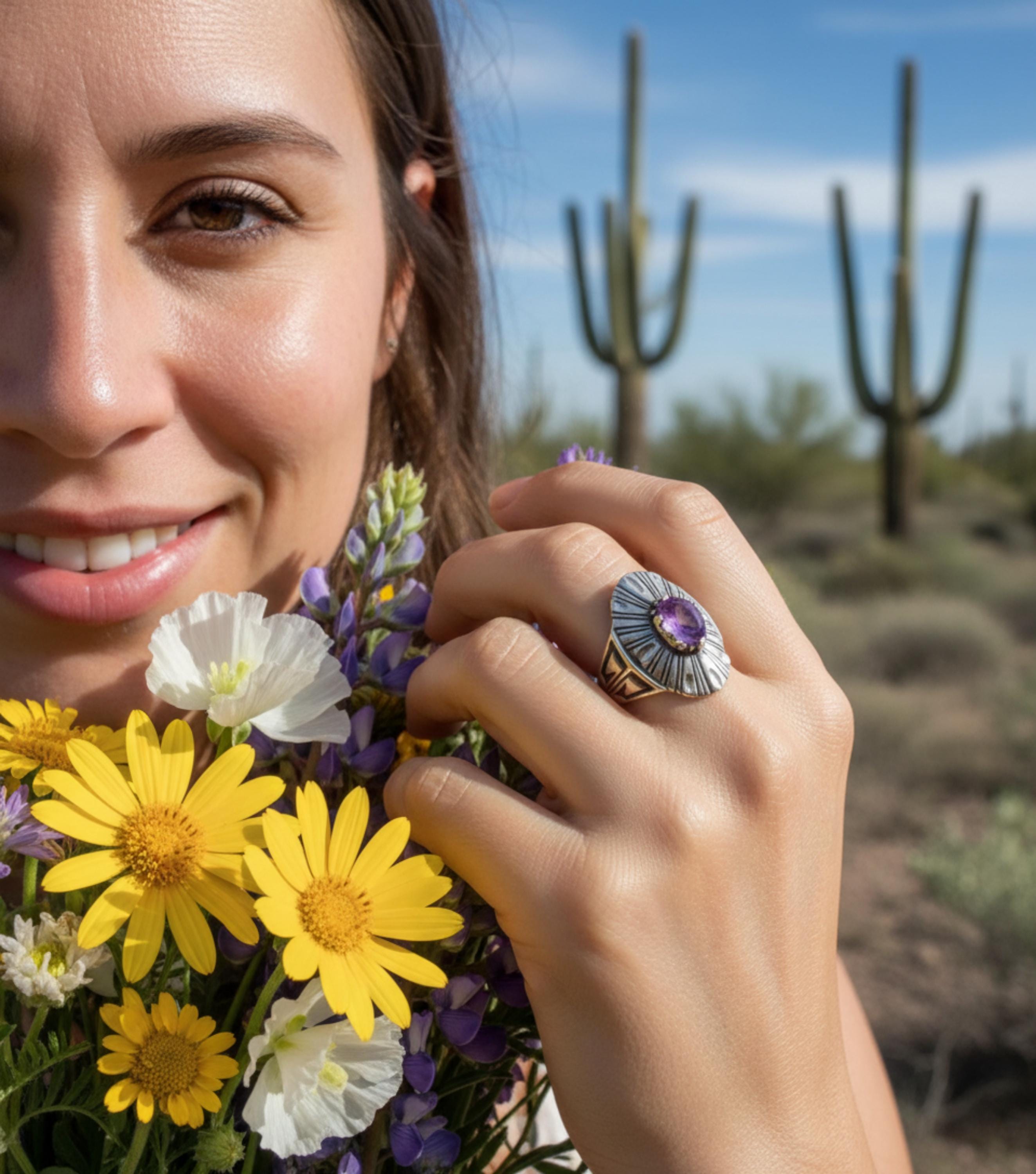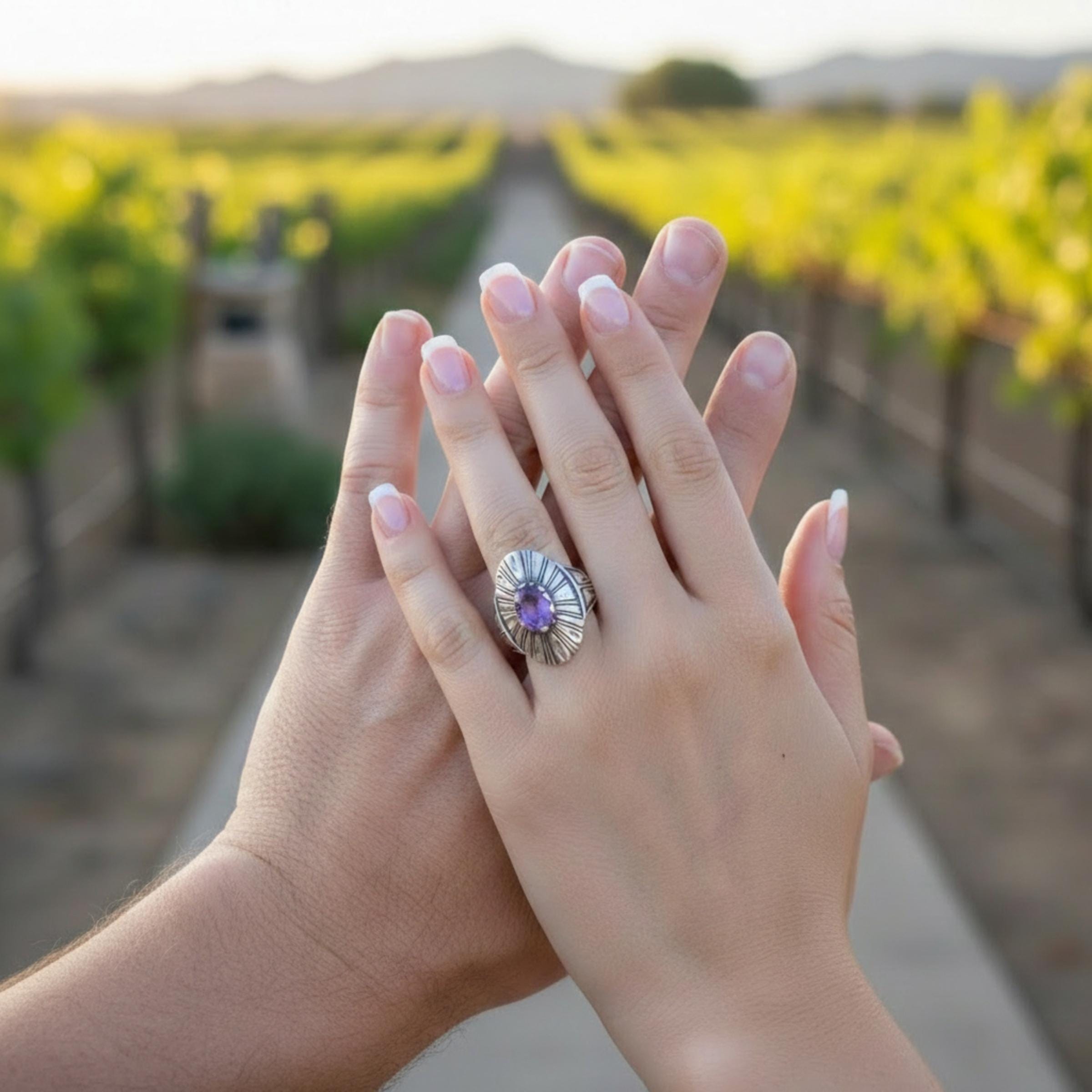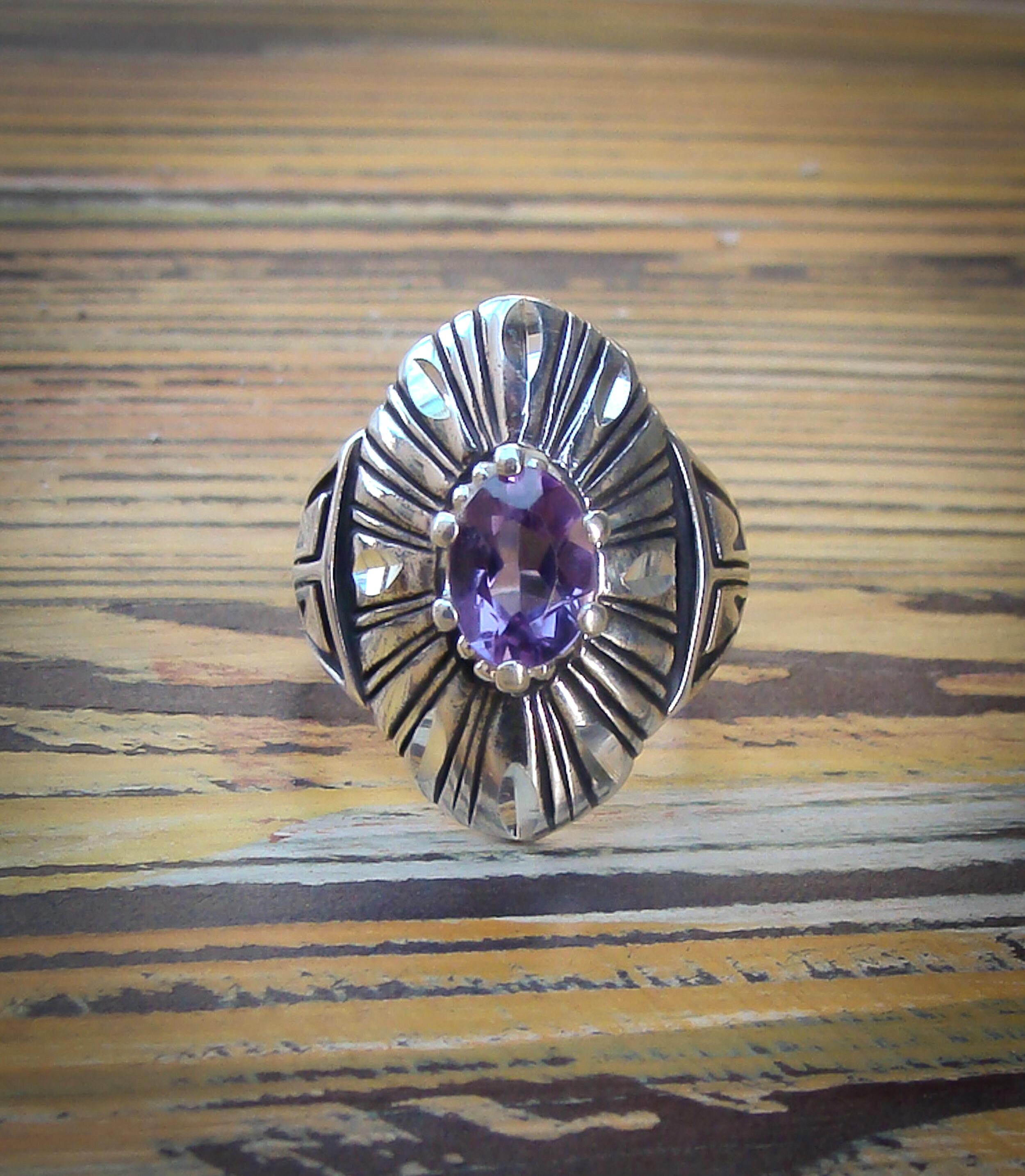 This gorgeous women's ring is handcrafted with Sterling Silver and set with an oval cut Amethyst stone. It is a very beautiful, contemporary Navajo design. The clean lines and the purple solitaire is a dramatic touch. This is a beautiful rendition of a high end look for a fraction of the price!